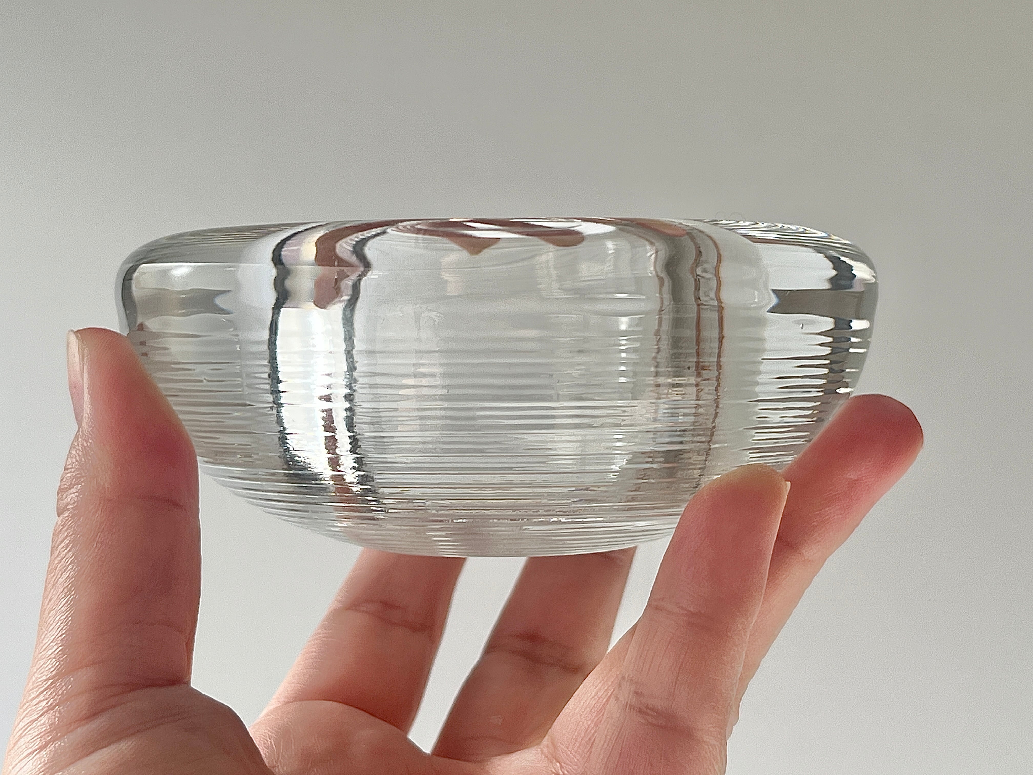 たっぷりのガラスを用いており、手に持つとどっしりとした重量を感じます。焼き物の轆轤目を思わせるような美しいラインがとても魅力的な一品です。
