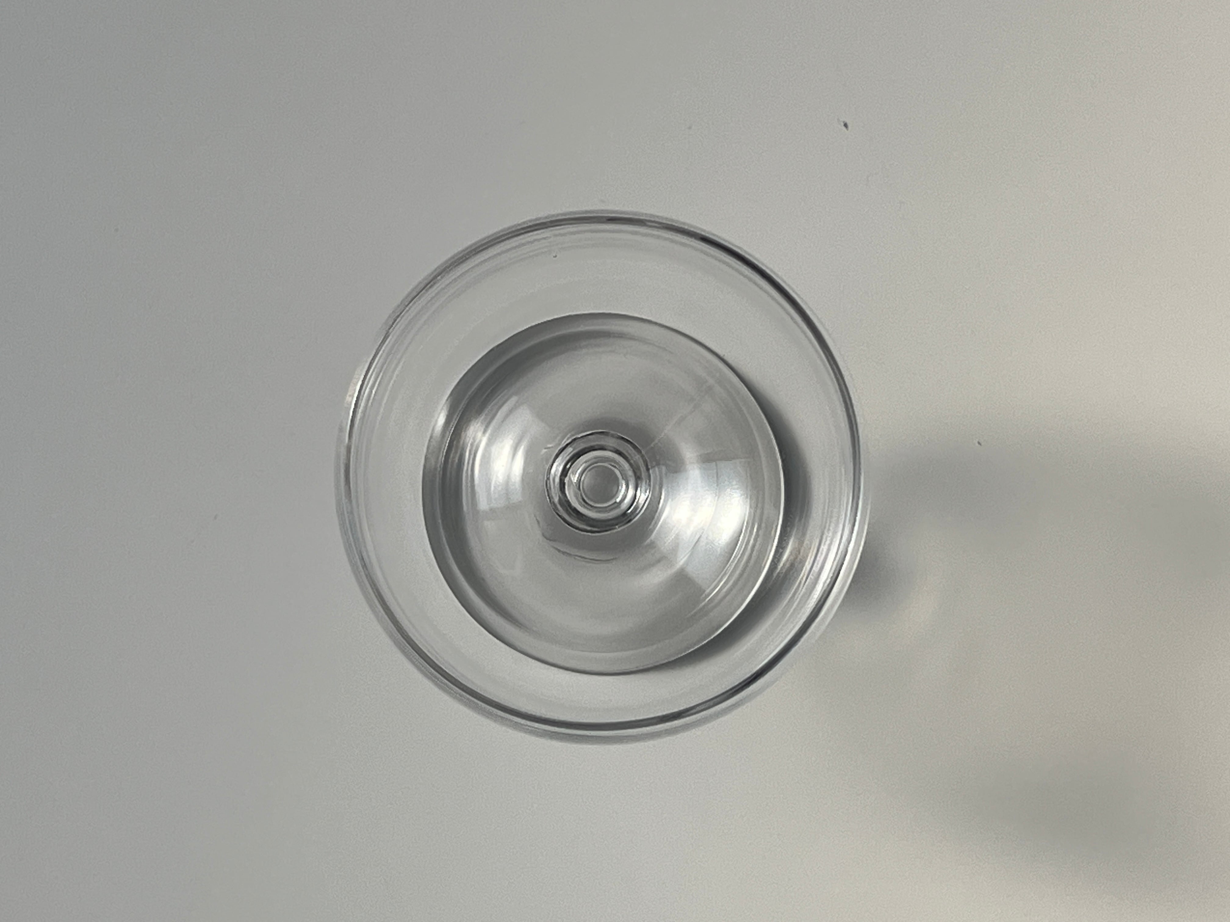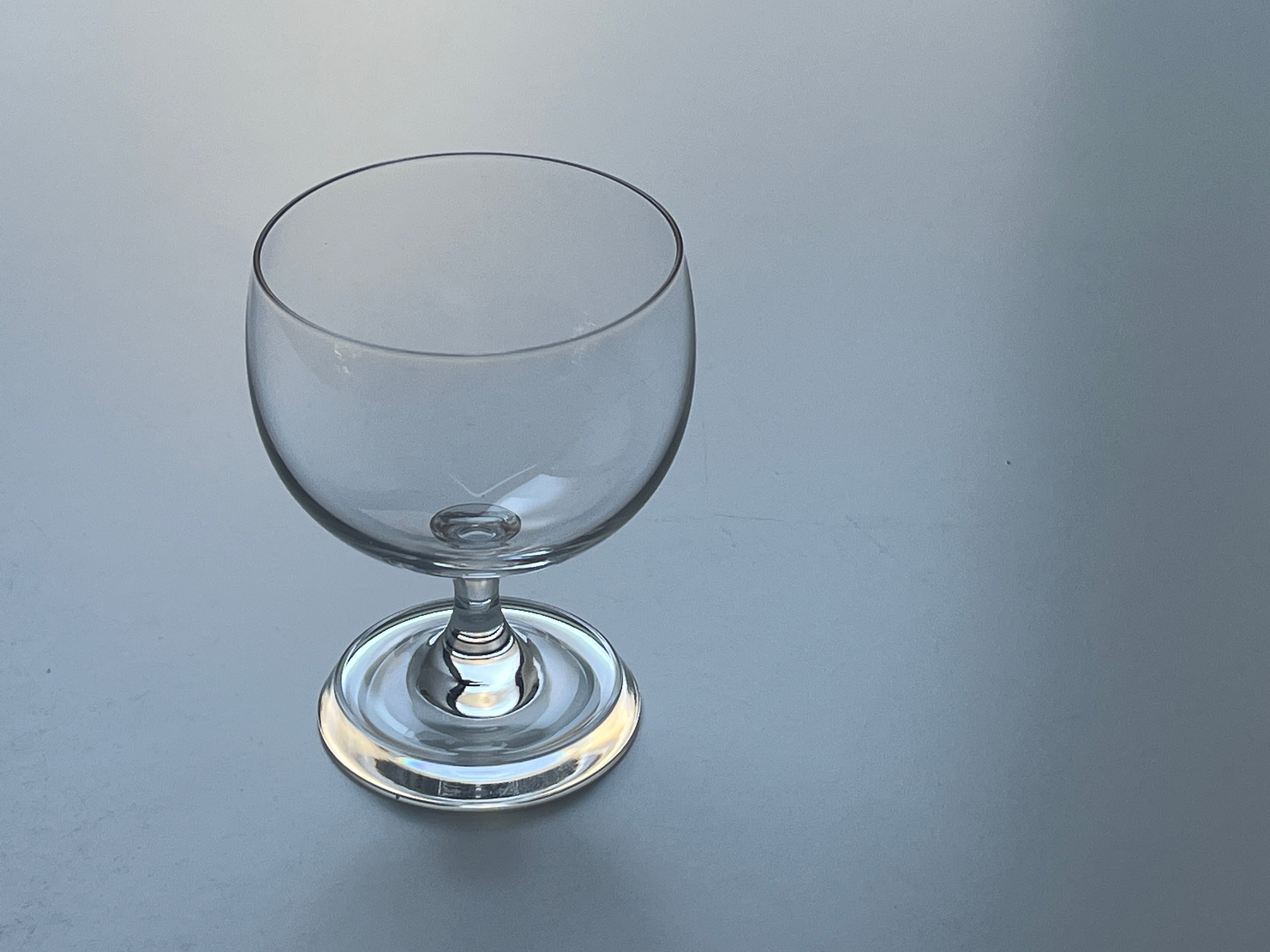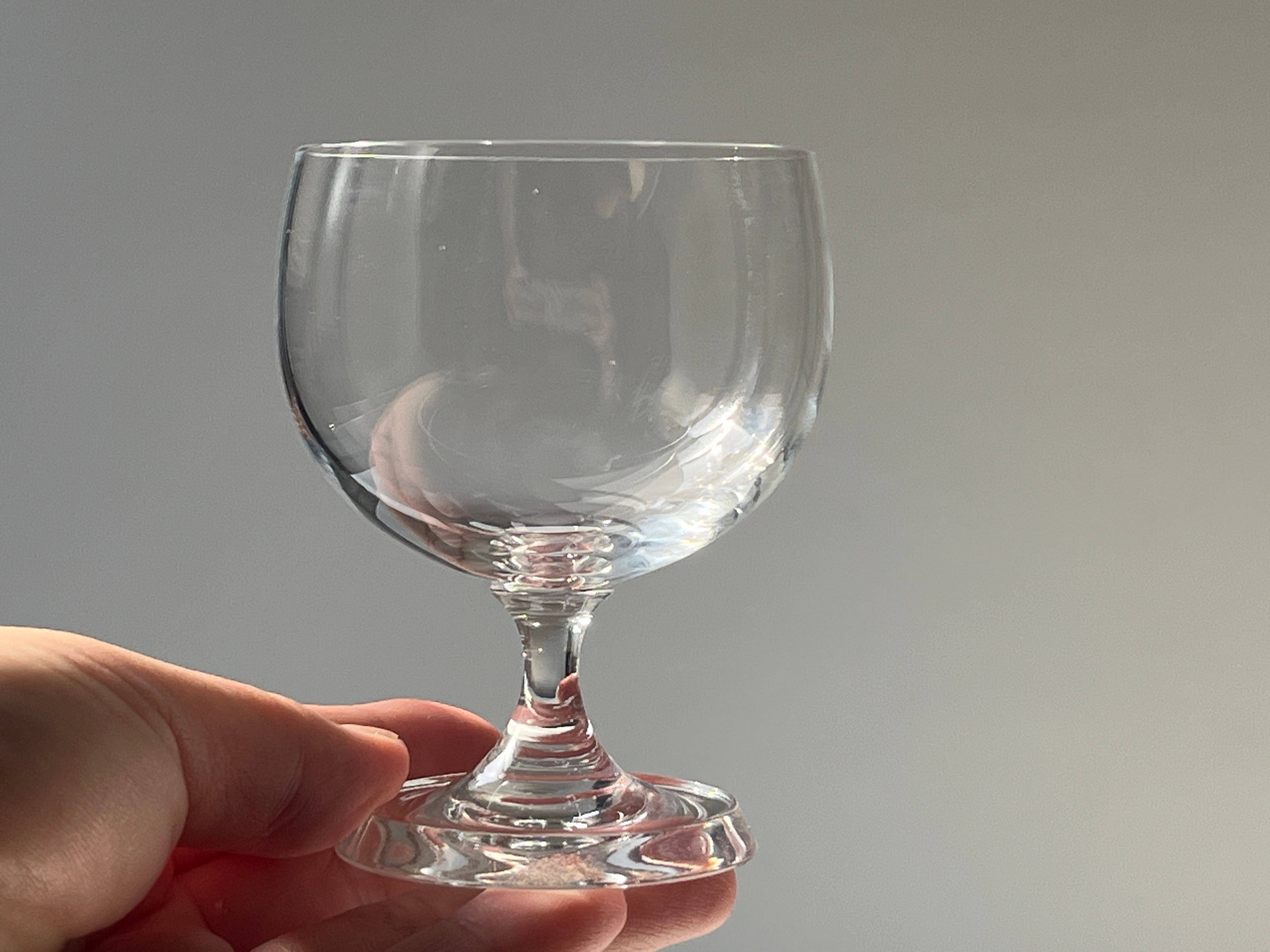 マウスブローの型吹きで製造された繊細なボウルに砂時計型の短いステム、そして縁の立ち上がった厚みのあるプレート状のフットが合わさって美しいフォルムを生み出しています。