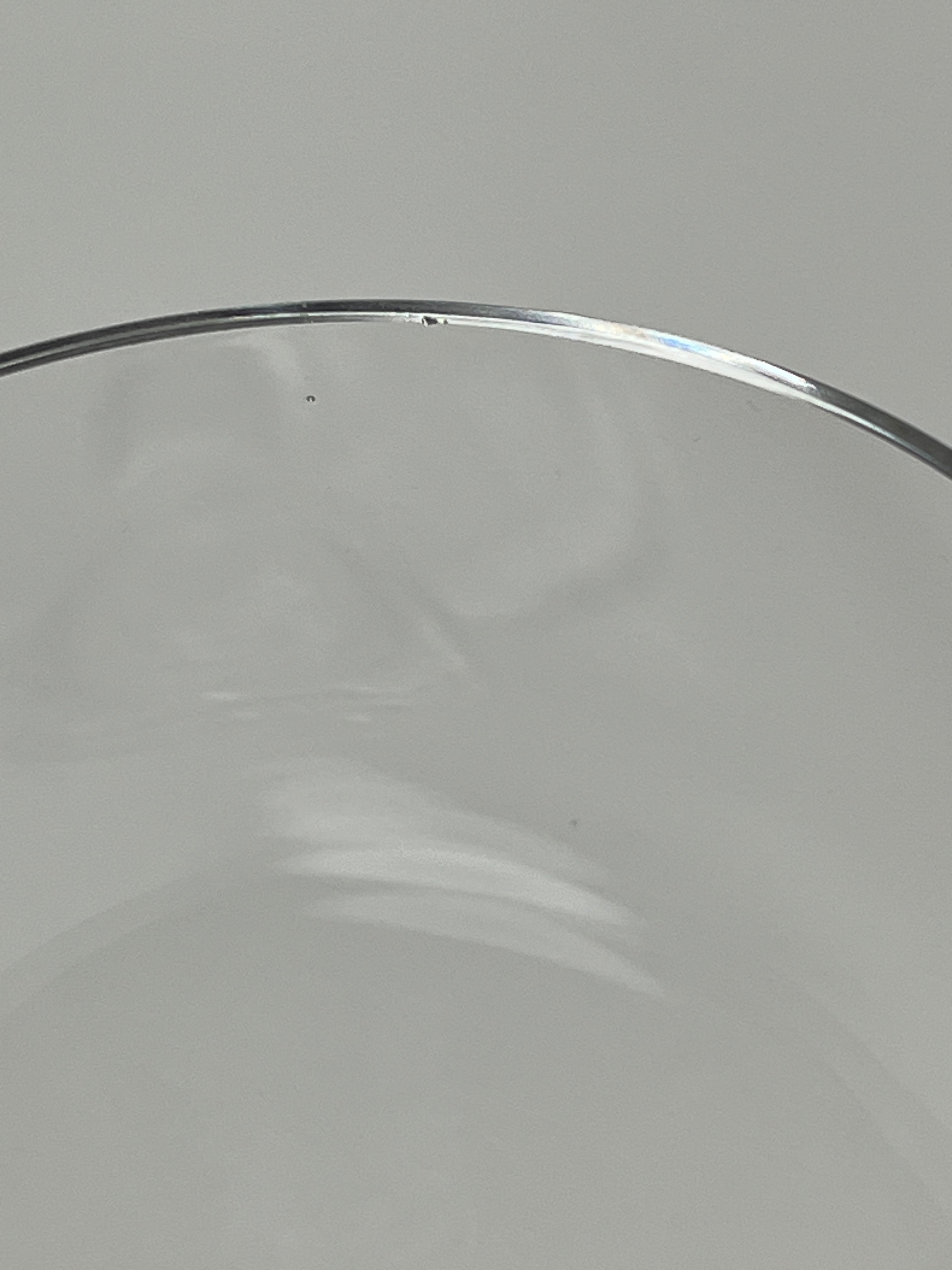 製造段階のものですが、僅かな気泡やグラスの口をカットする処理によって、口の内側に小さな削れまたは窪みのようなもの(光に透かしてよく見なければわからないような極小のもの)が生じることがございますが、正規の製品として販売されていたクオリティに問題のないものです。