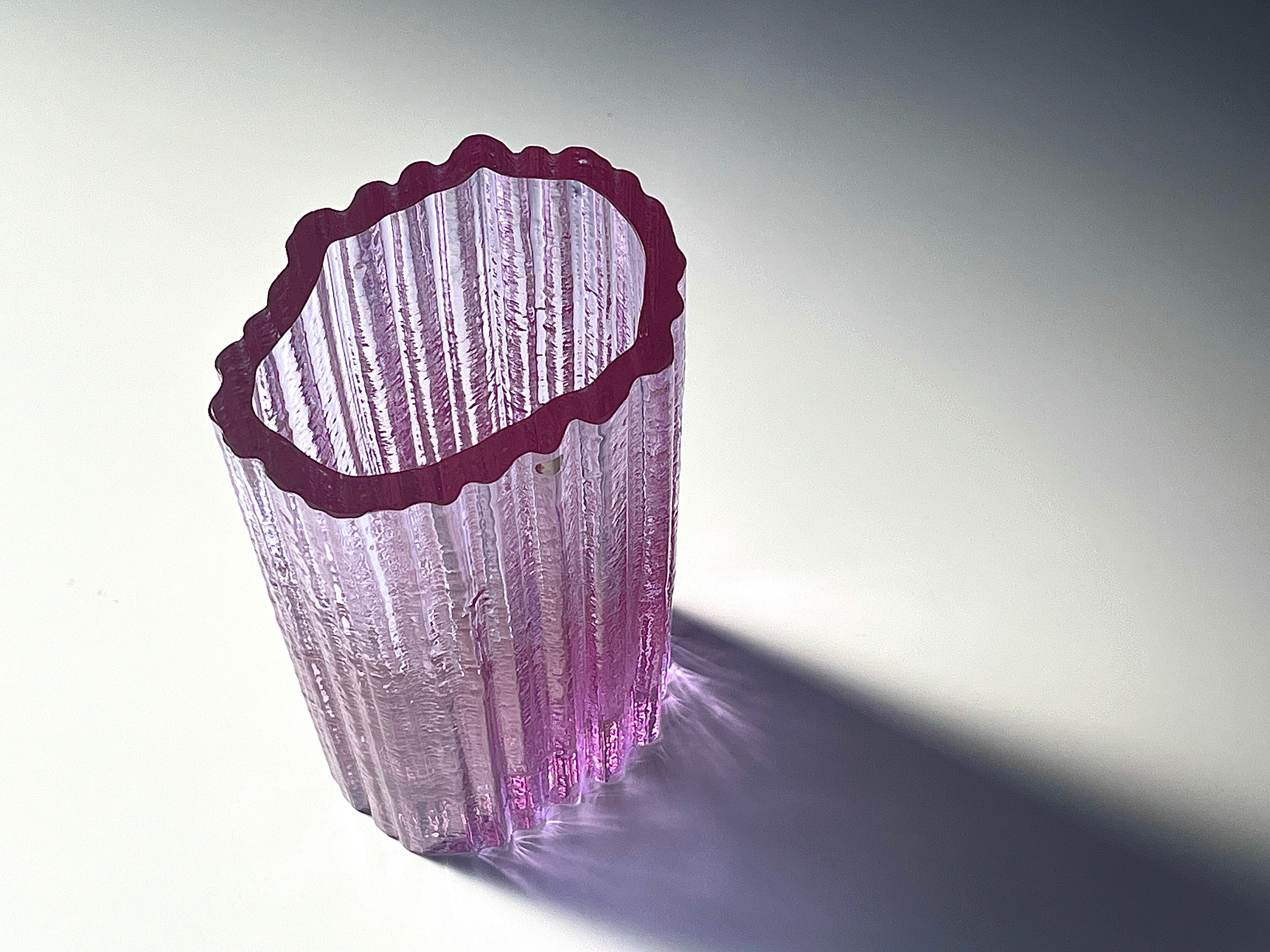 ネオジウムガラスは薄紫の美しい色合いをしていますが、太陽光の下で見た場合は赤味を帯び、蛍光灯の下で見た場合は青みを帯びて見えるという面白い特徴を持ち、フィンランドのガラスデザインに多く用いられてきました。