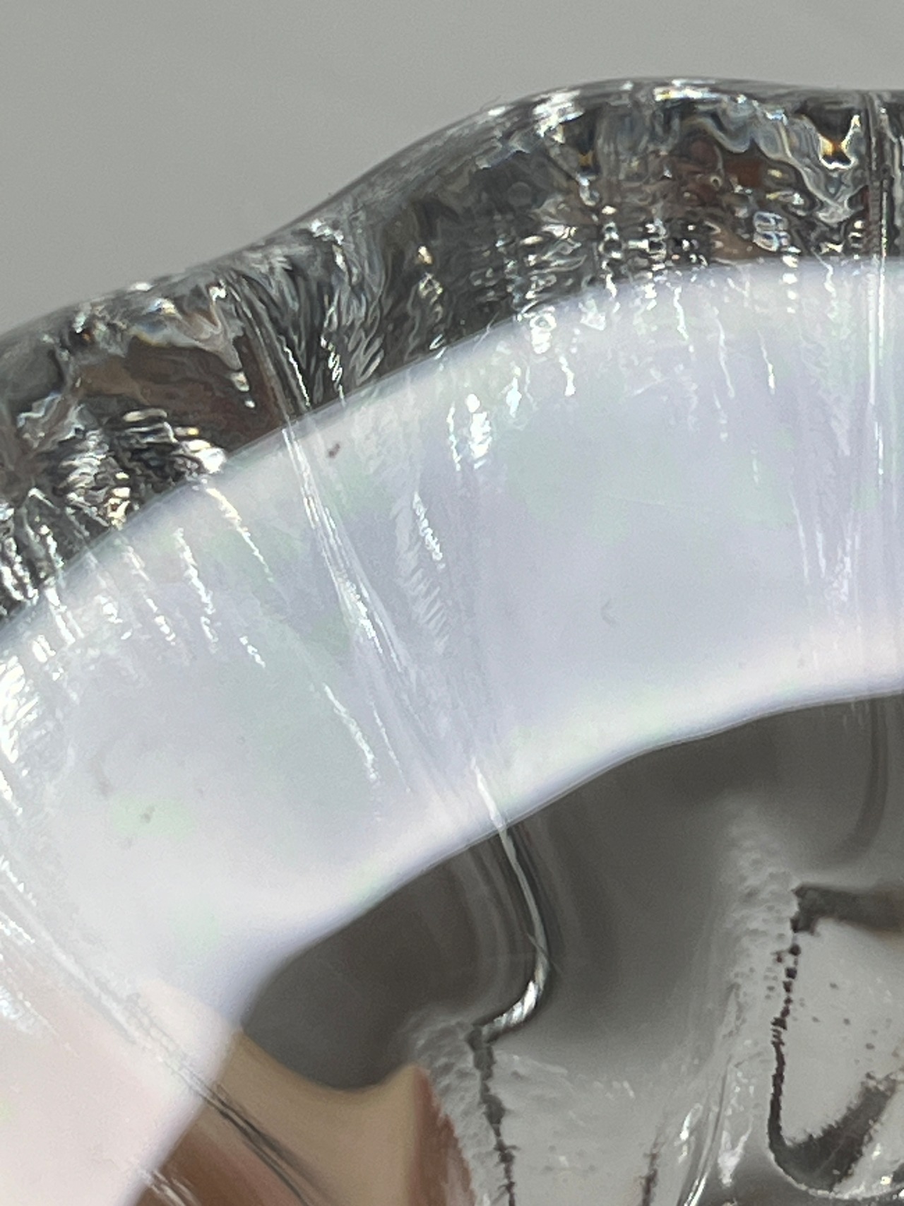 表面上部に極薄い擦れと極微細なガラスの膨らみがありますが、いずれも光にかざしてかなりしっかりと見なければ確認できない程度のものです。その気になるような傷や汚れは見当たらず、大変きれいなコンディションです。