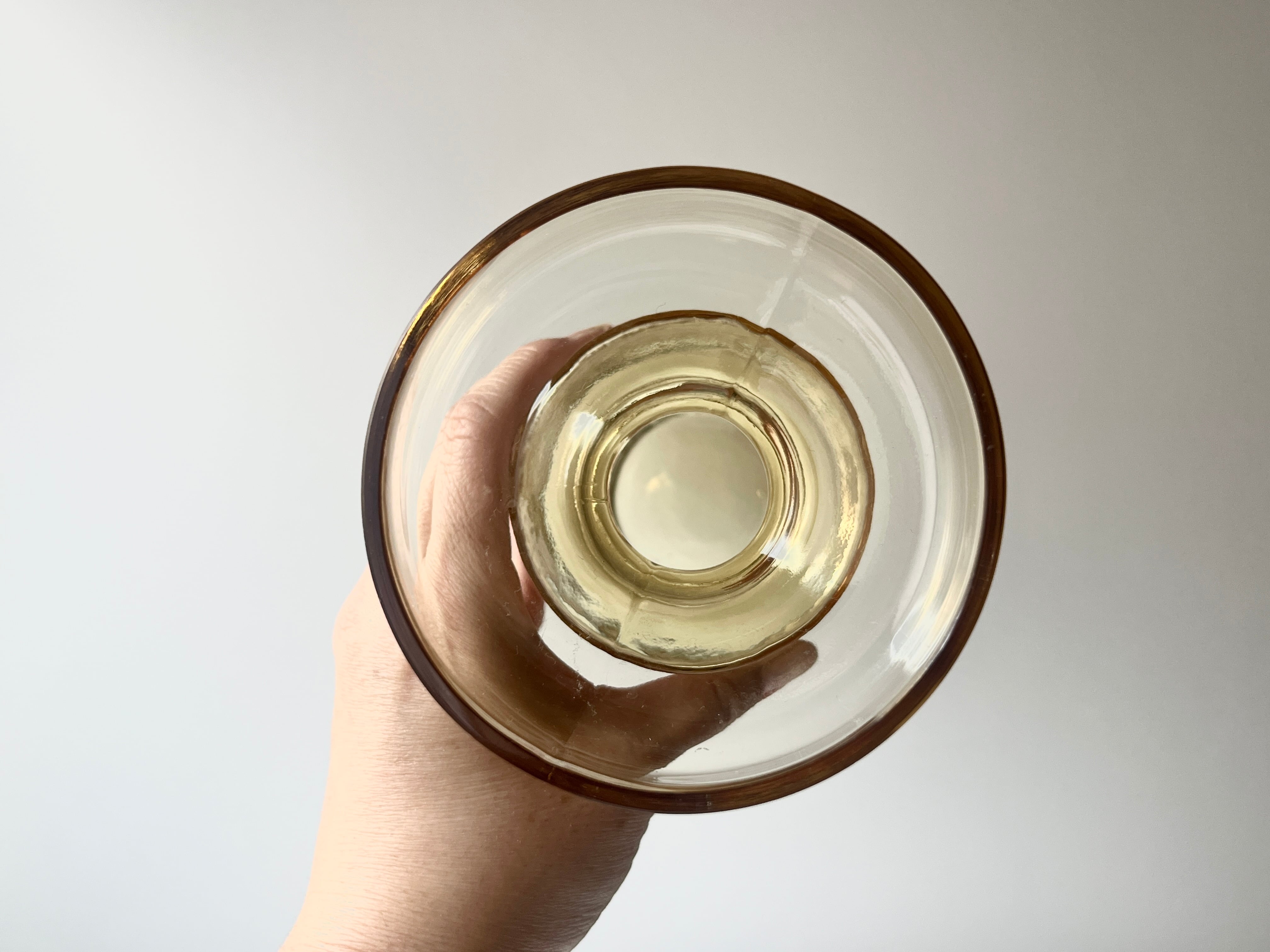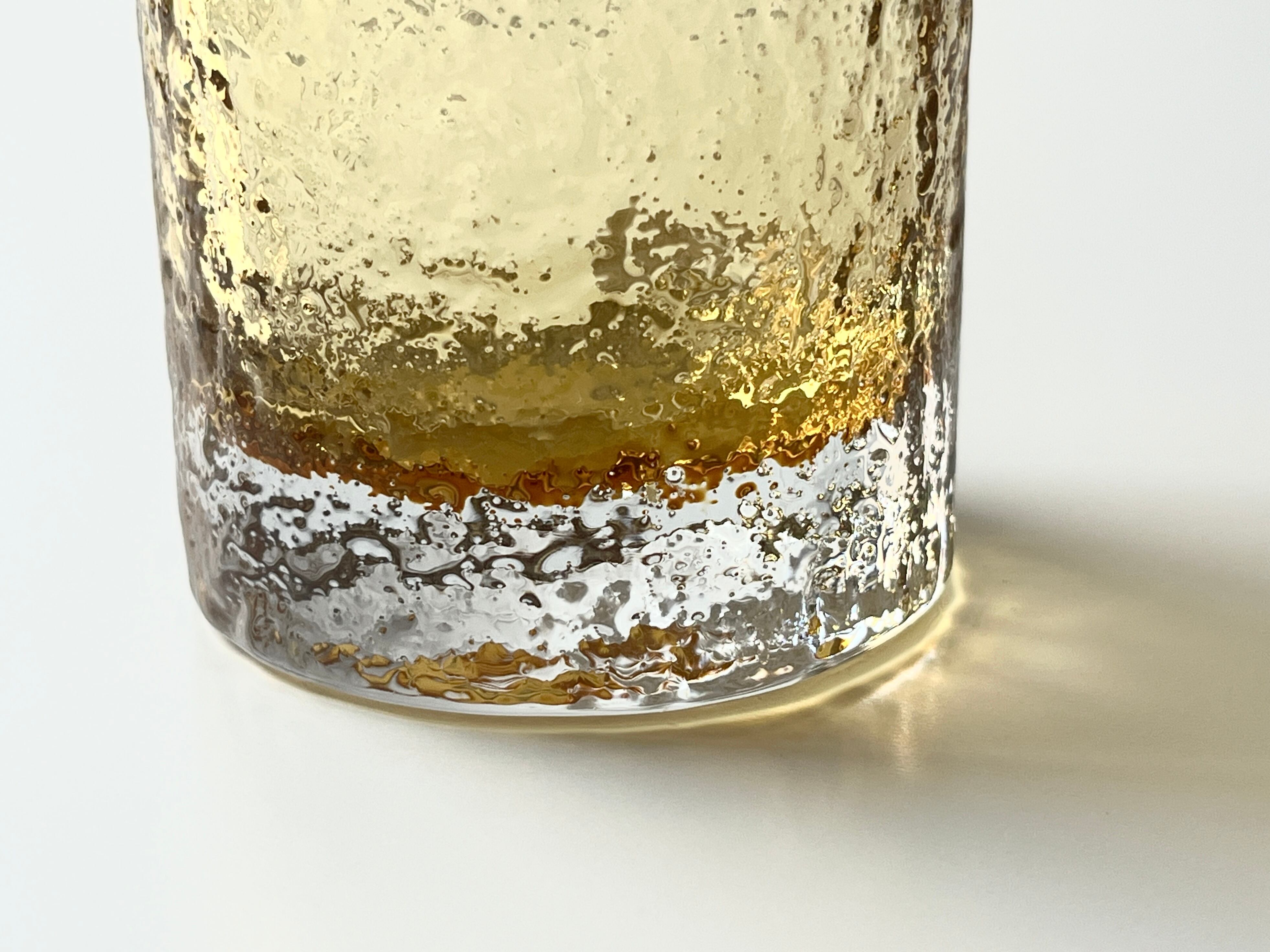 クリアの底と淡い飴色のガラスで構成されたフラワーベースの表面には