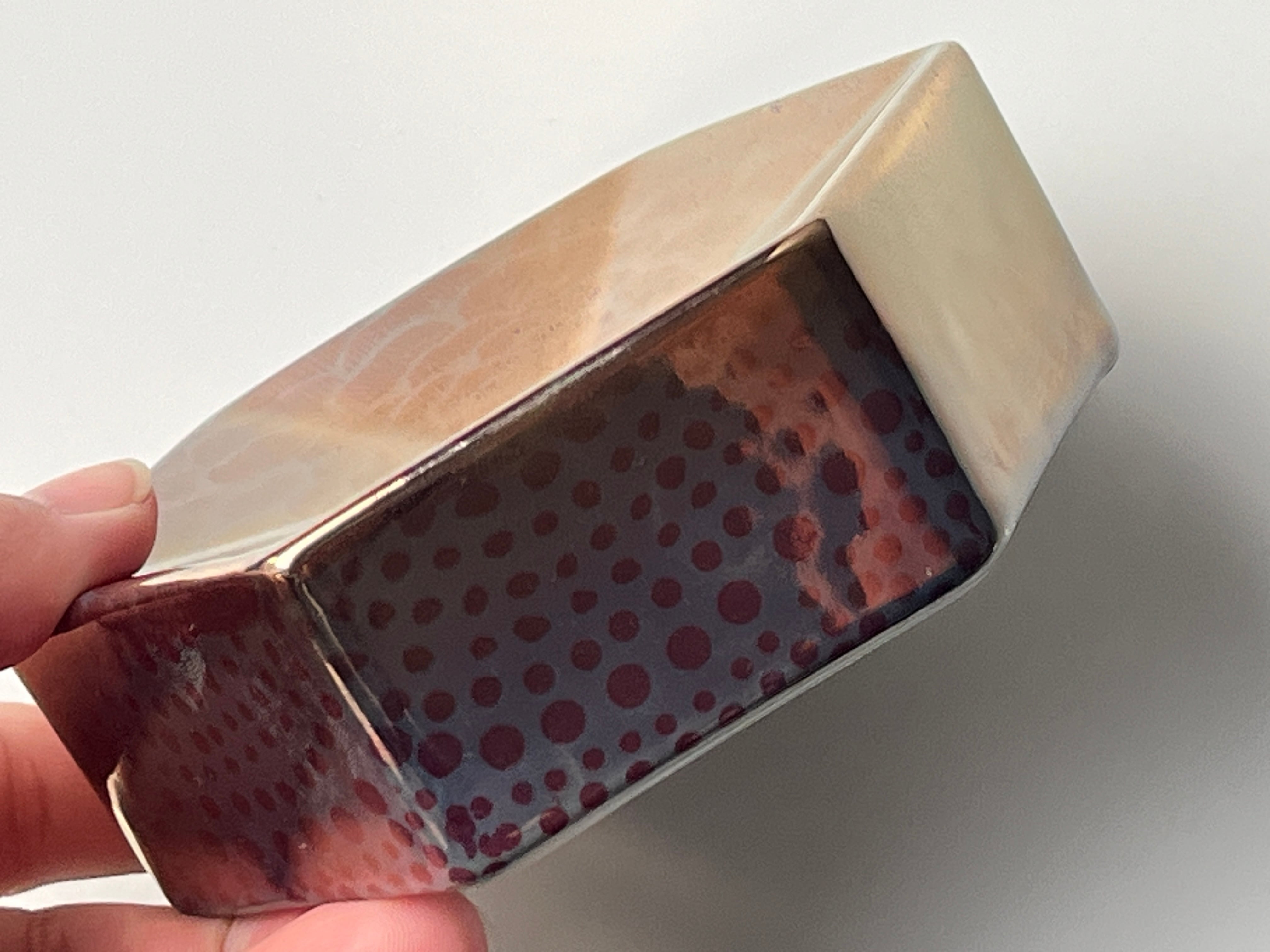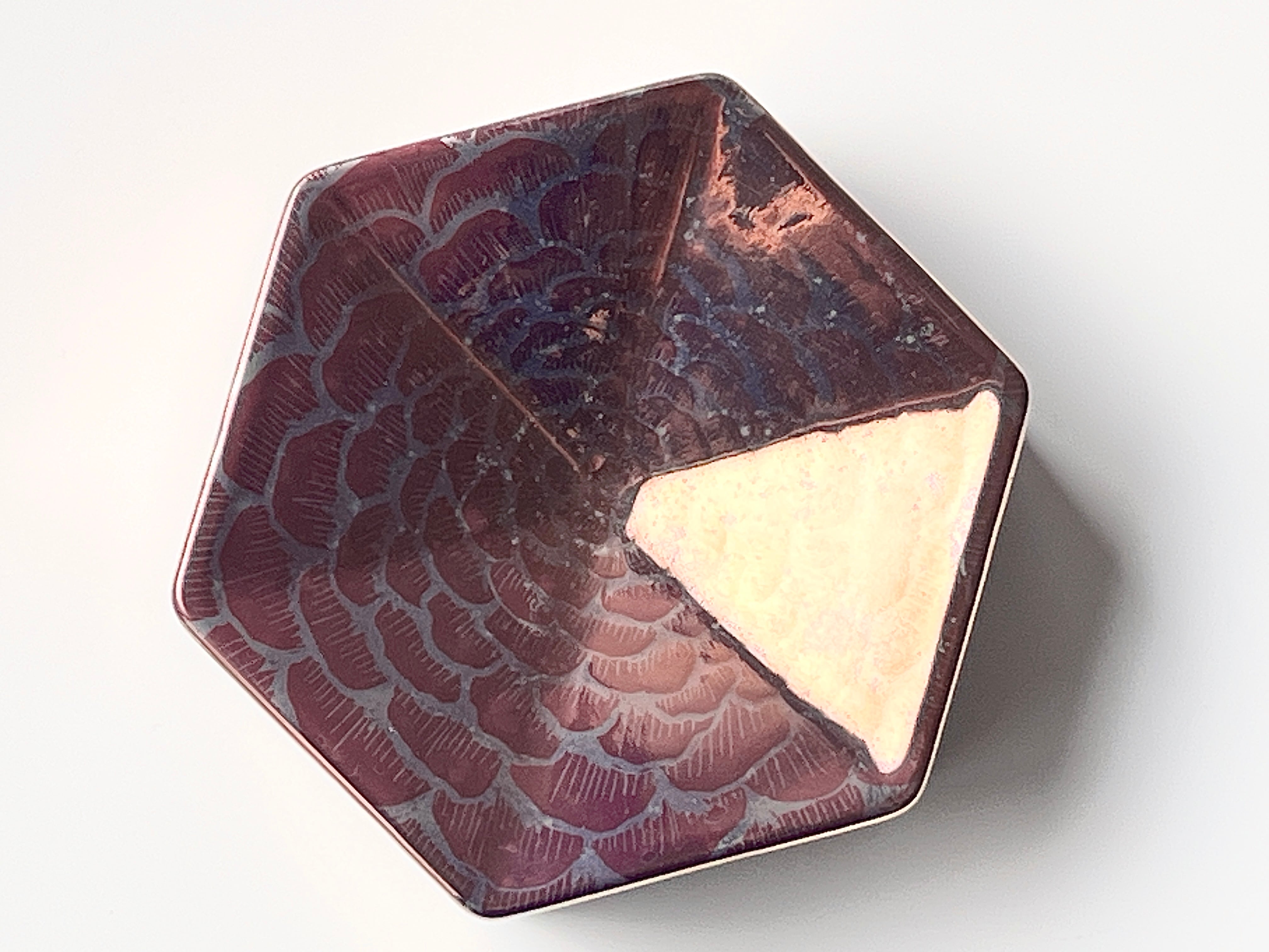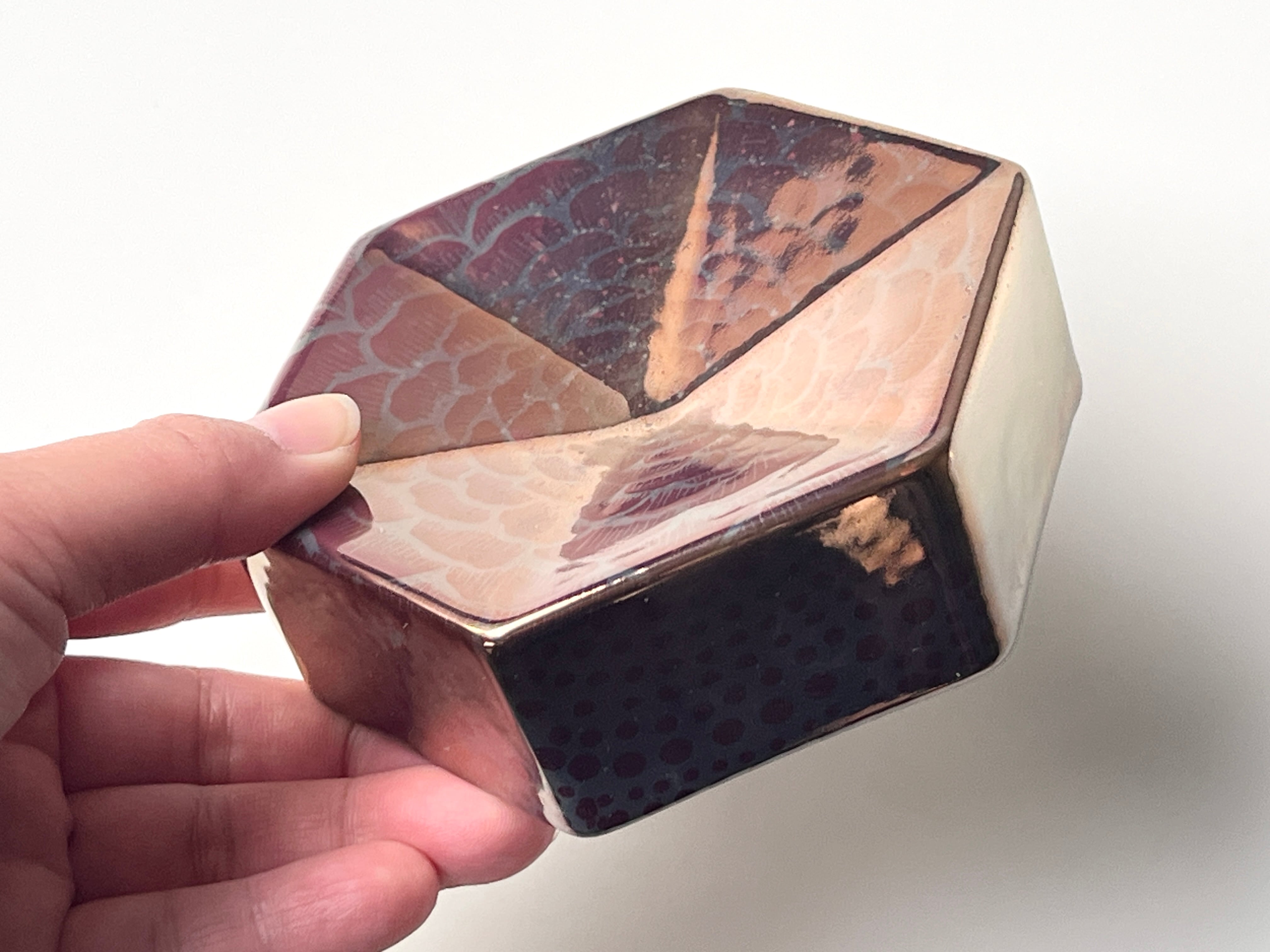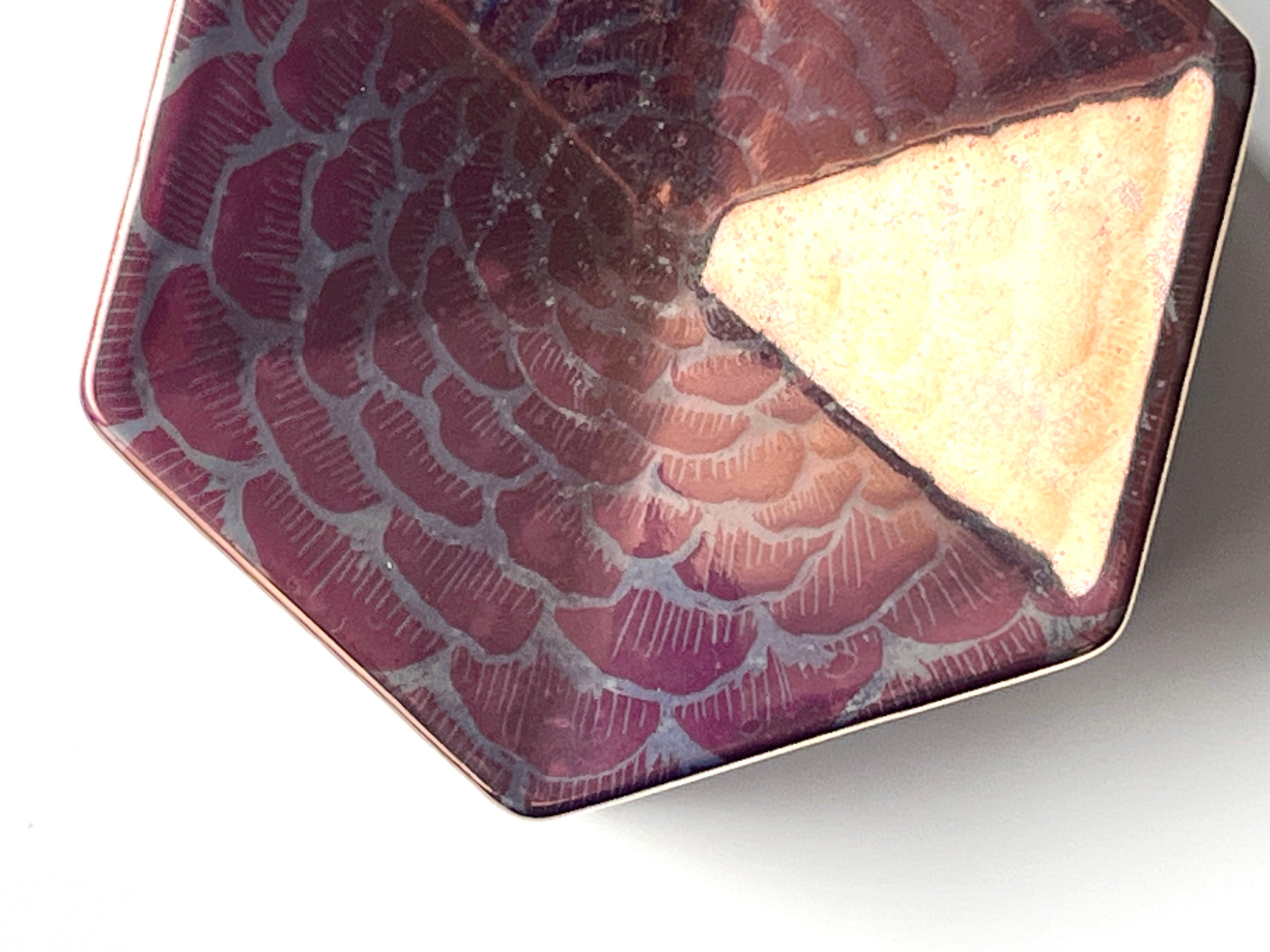 ベースにはグレー系の釉薬が掛けられ、六角形の天面には美しく大胆な構図の花が赤色で施されています。また、側面にはそれぞれ弧を描いたドットラインが同じく赤色で施されていおり、その上から本金を配合した金の彩色で塗りこめられています。