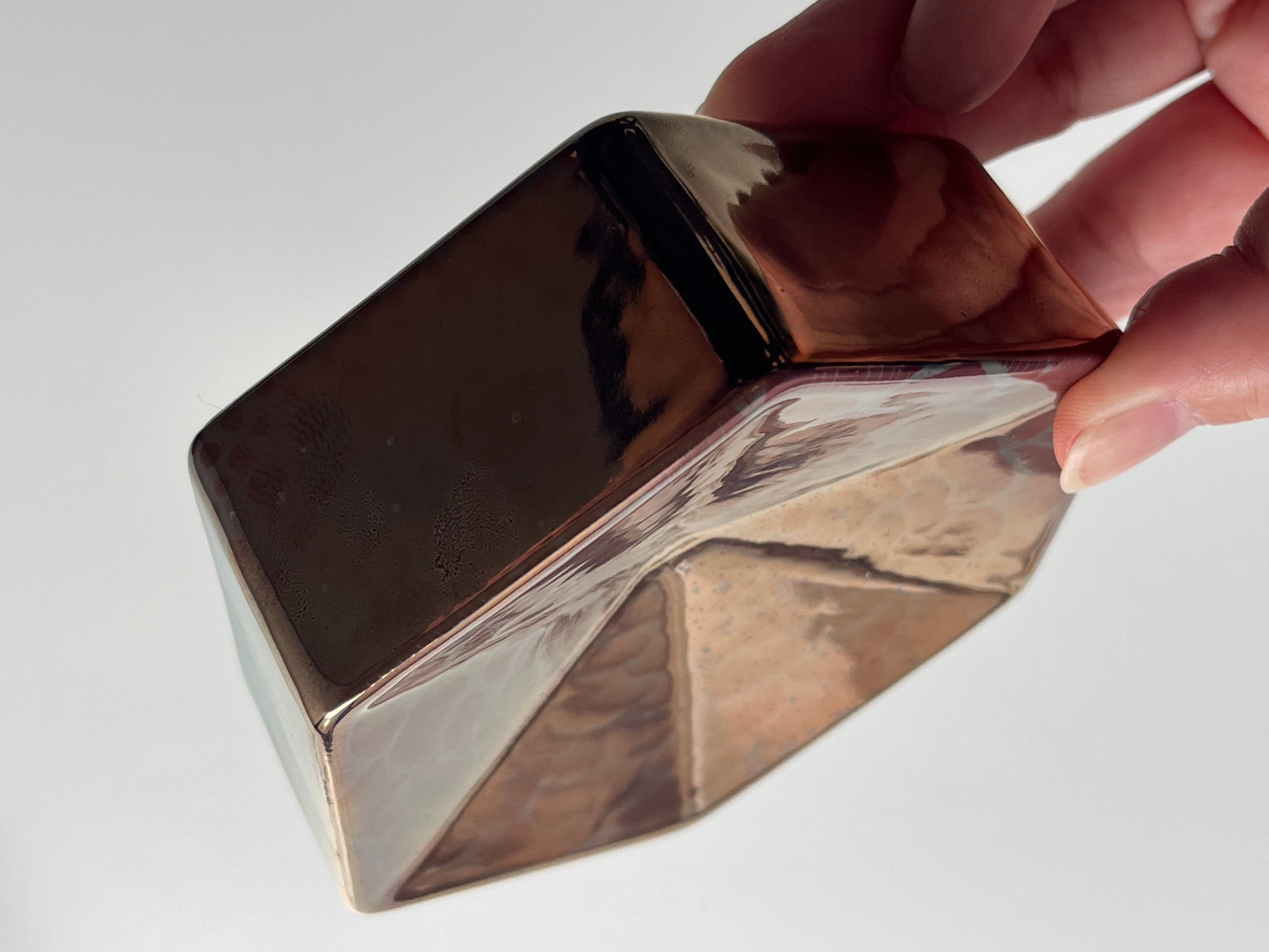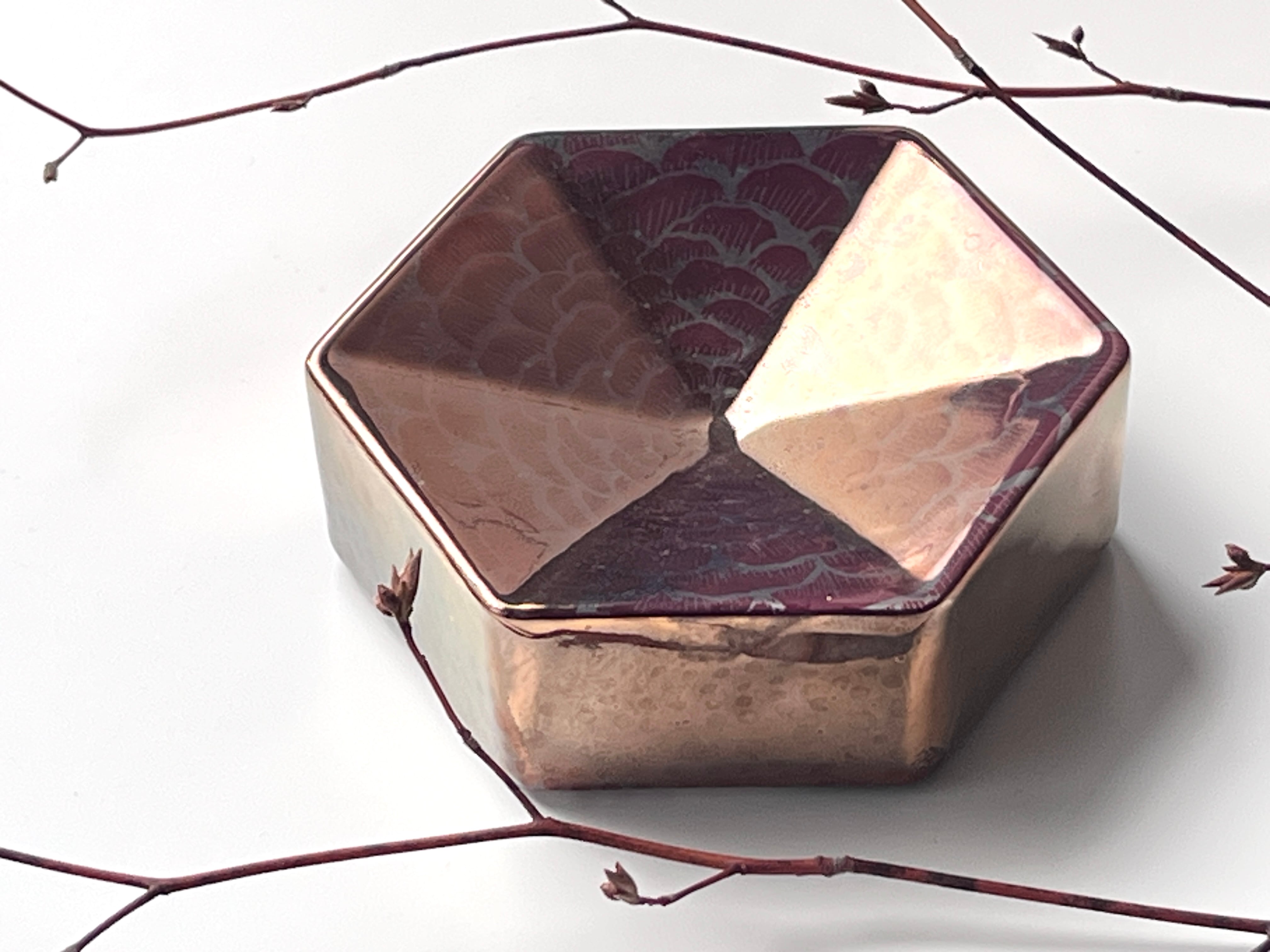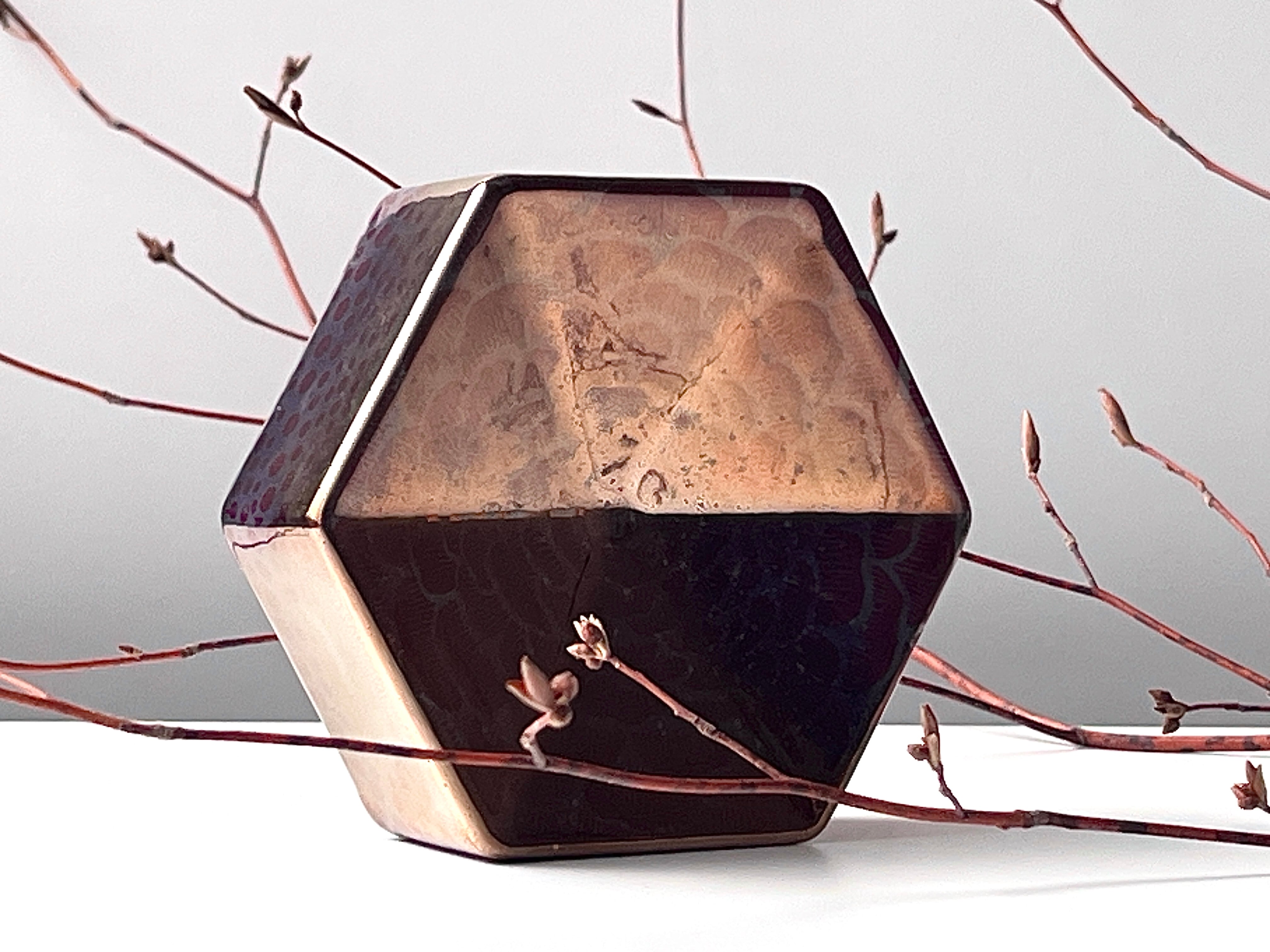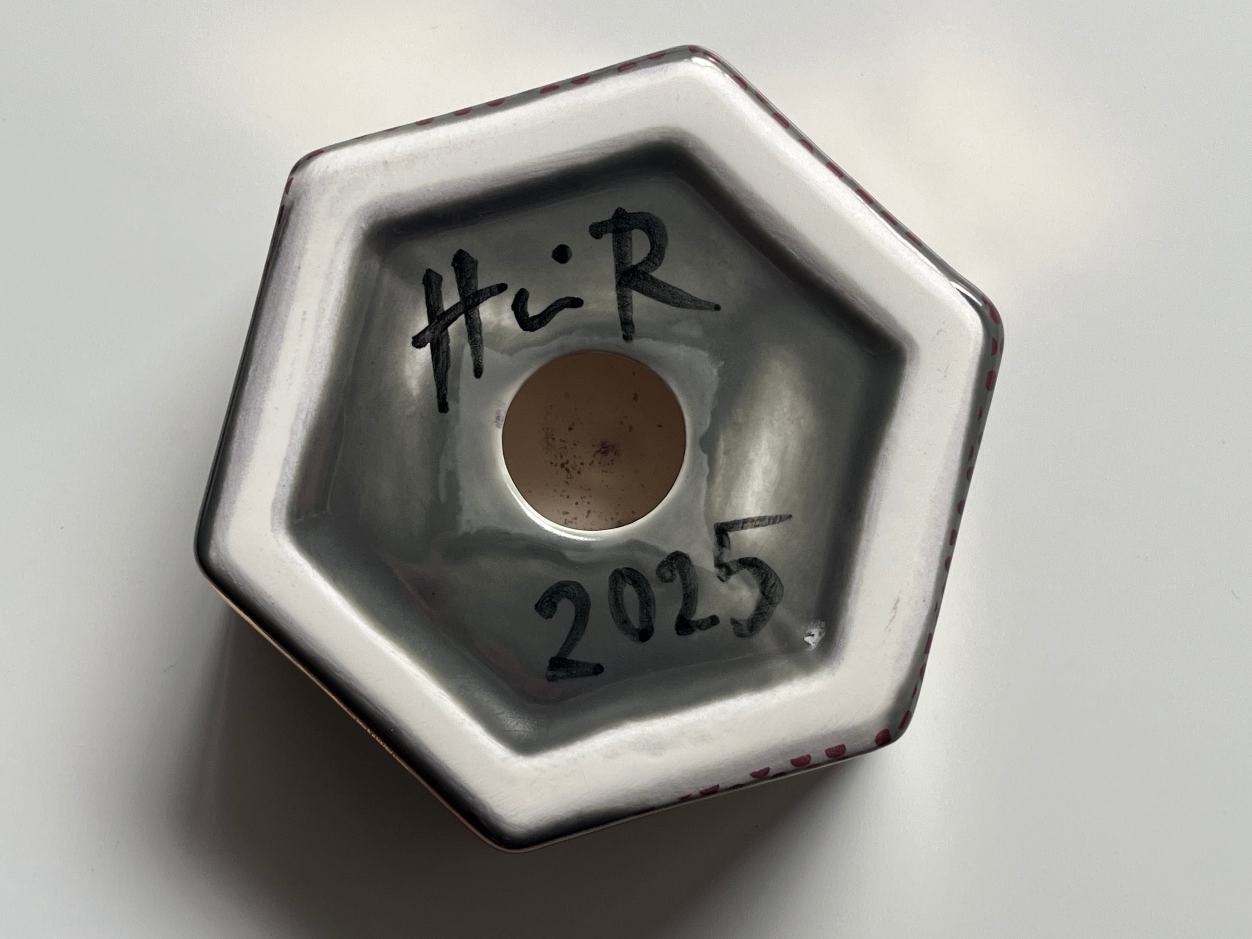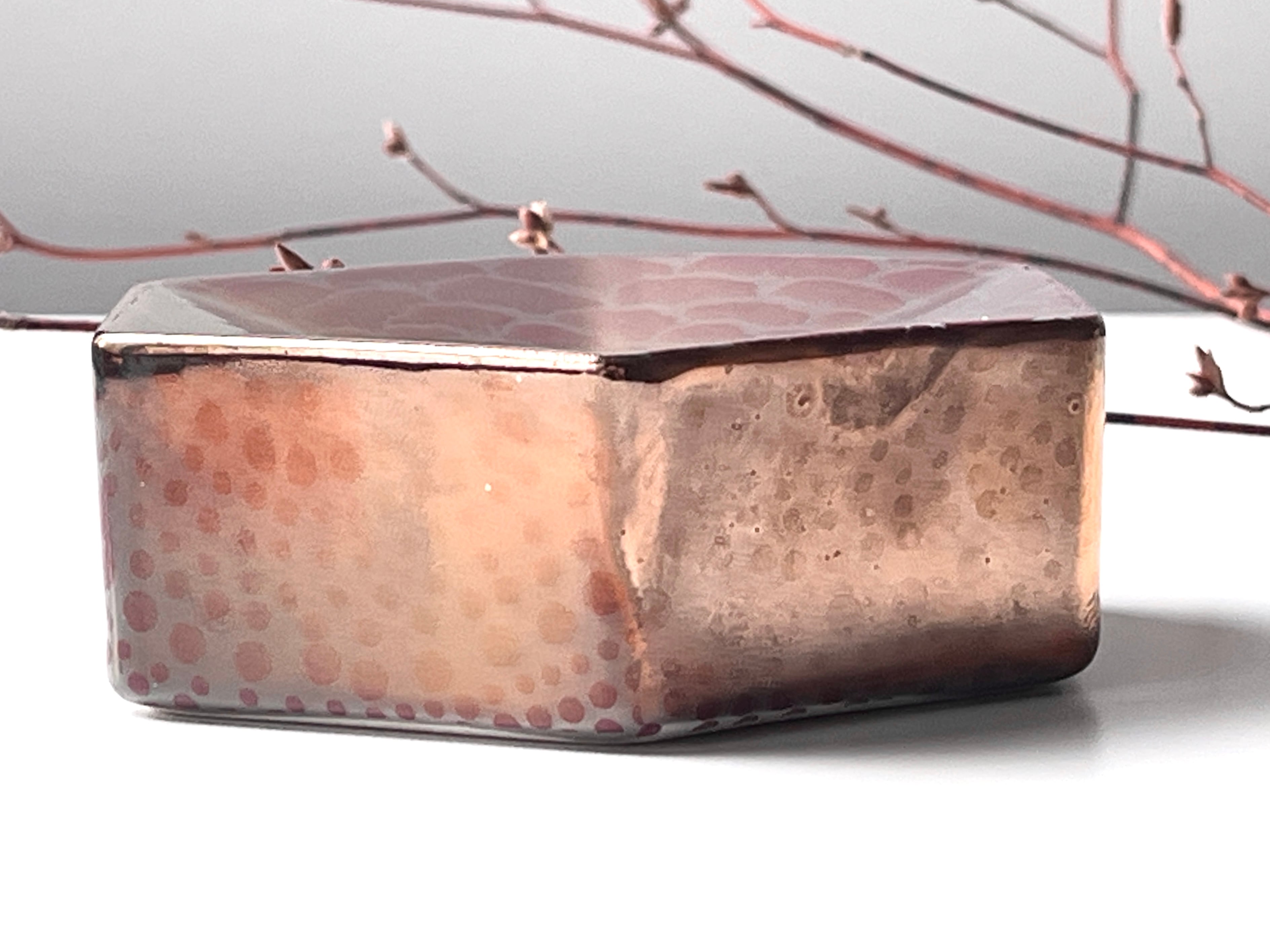 ベースにはグレー系の釉薬が掛けられ、六角形の天面には美しく大胆な構図の花が赤色で施されています。また、側面にはそれぞれ弧を描いたドットラインが同じく赤色で施されていおり、その上から本金を配合した金の彩色で塗りこめられています。