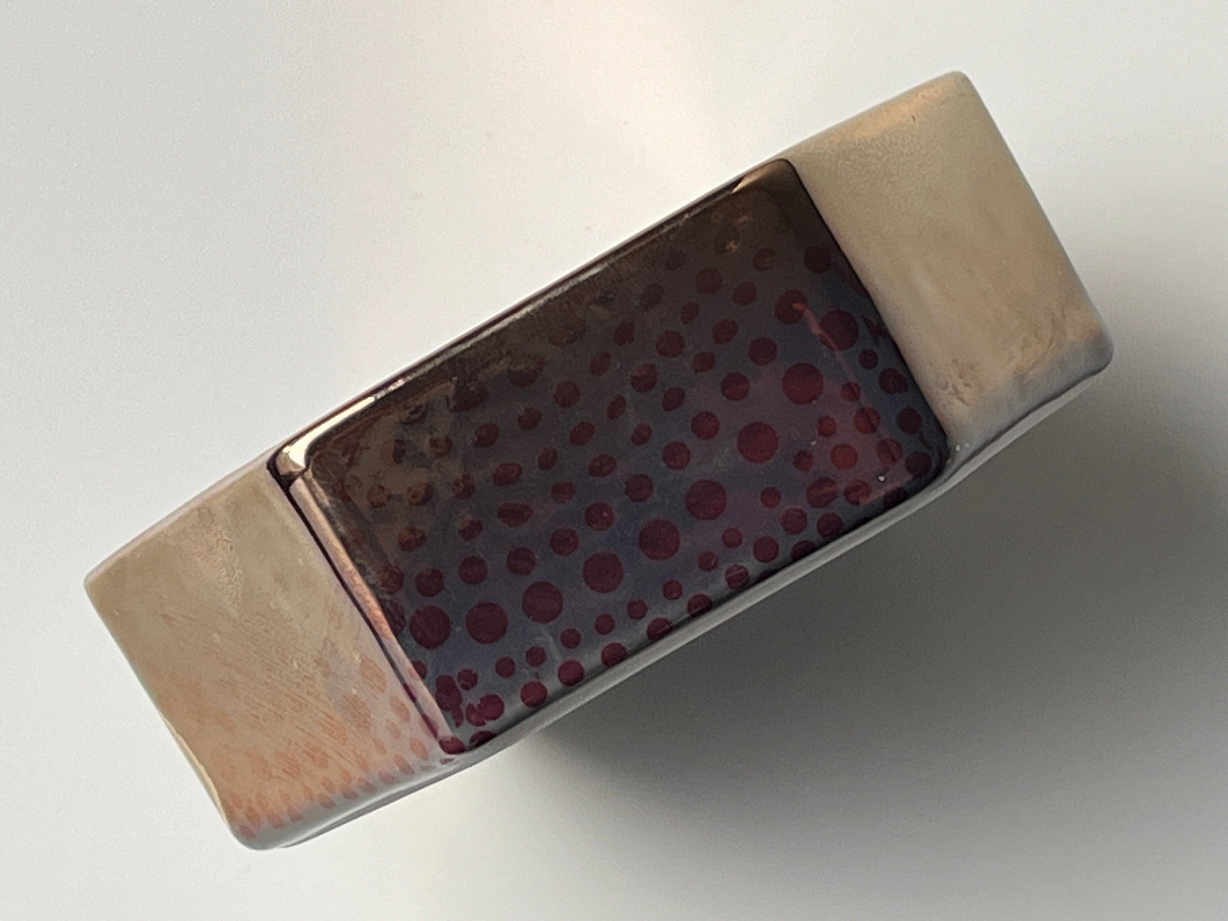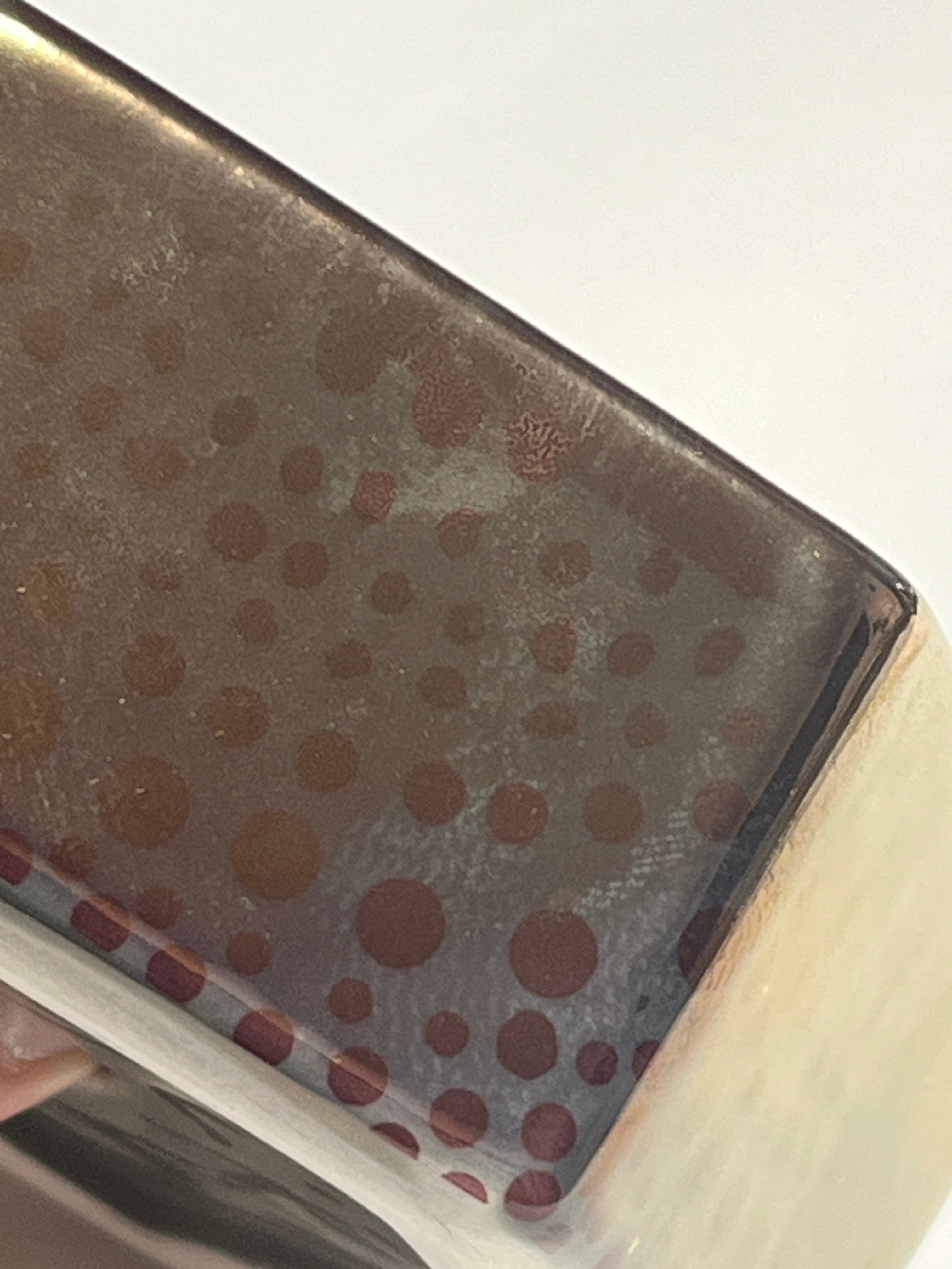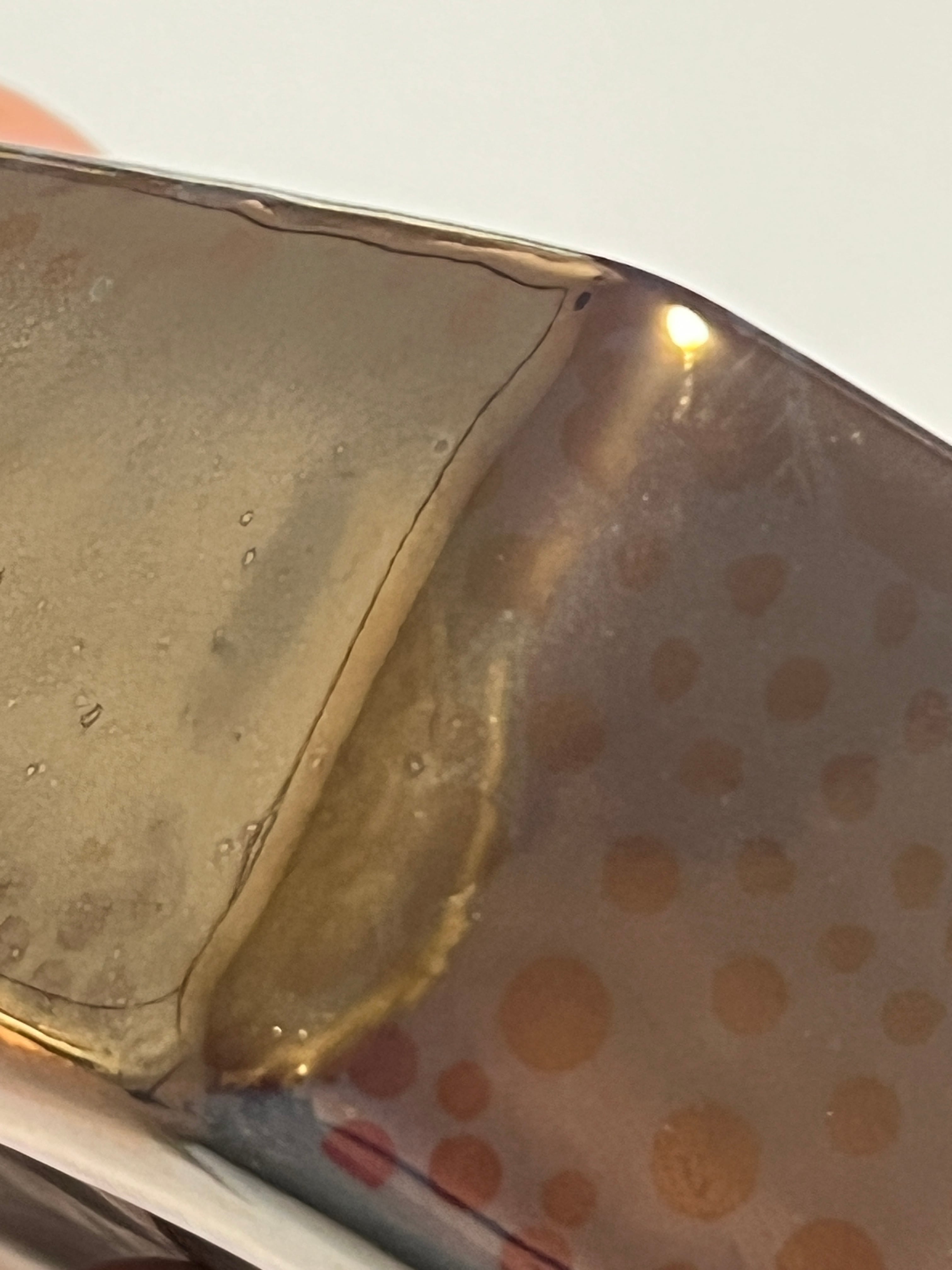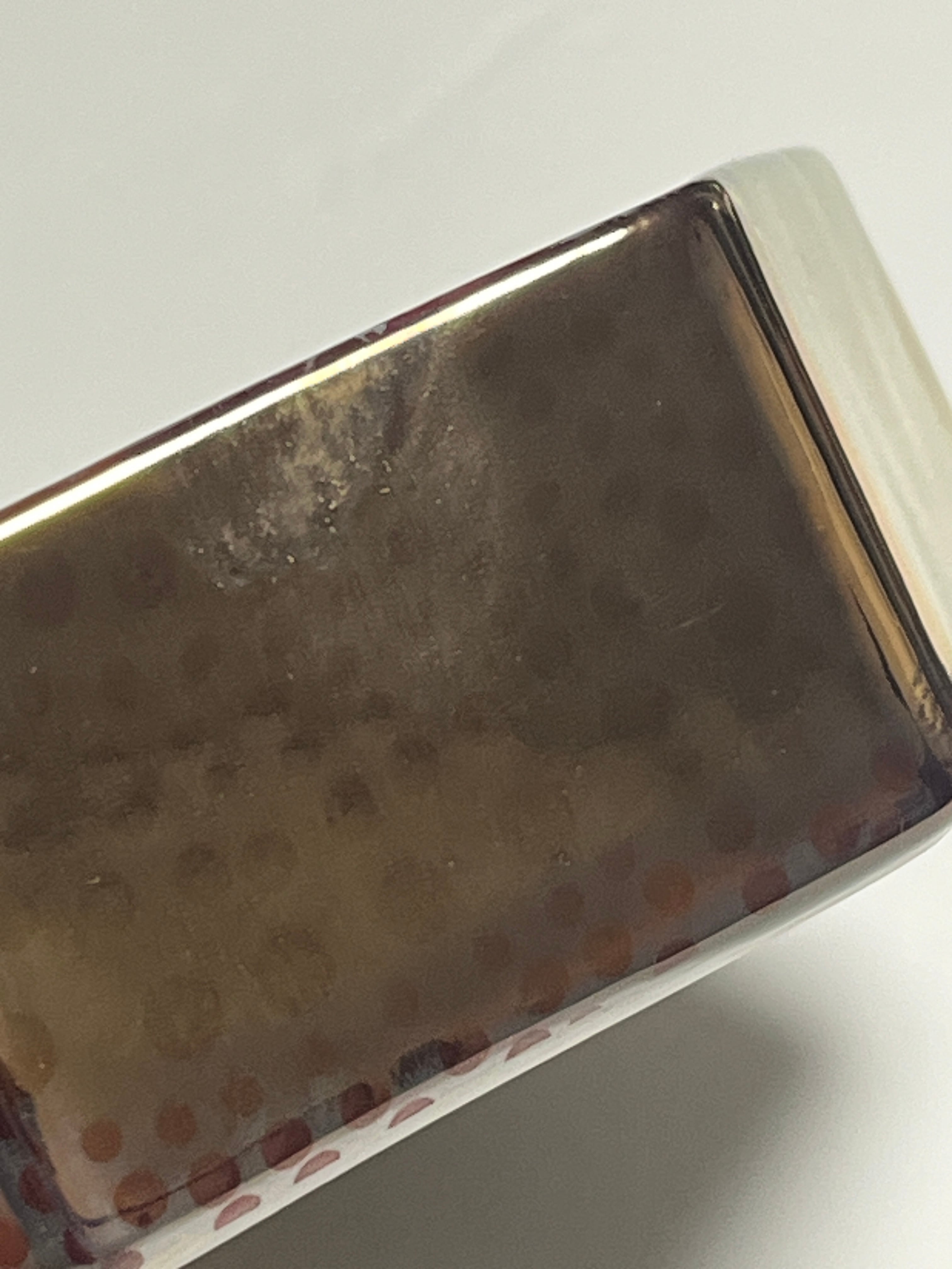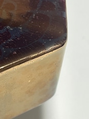 金彩には焼成段階でムラや変色が起きやすいそうです。また製作段階で付着した作者の指あとや、角がややざらついて感じるような箇所もございます。金彩作品にはいずれにもそうした部位が見られますので、画像で状態をしっかりとご確認いただき、ご理解ご了承のうえでご購入願います。目立つ部位は拡大していますので画像にてご確認ください。