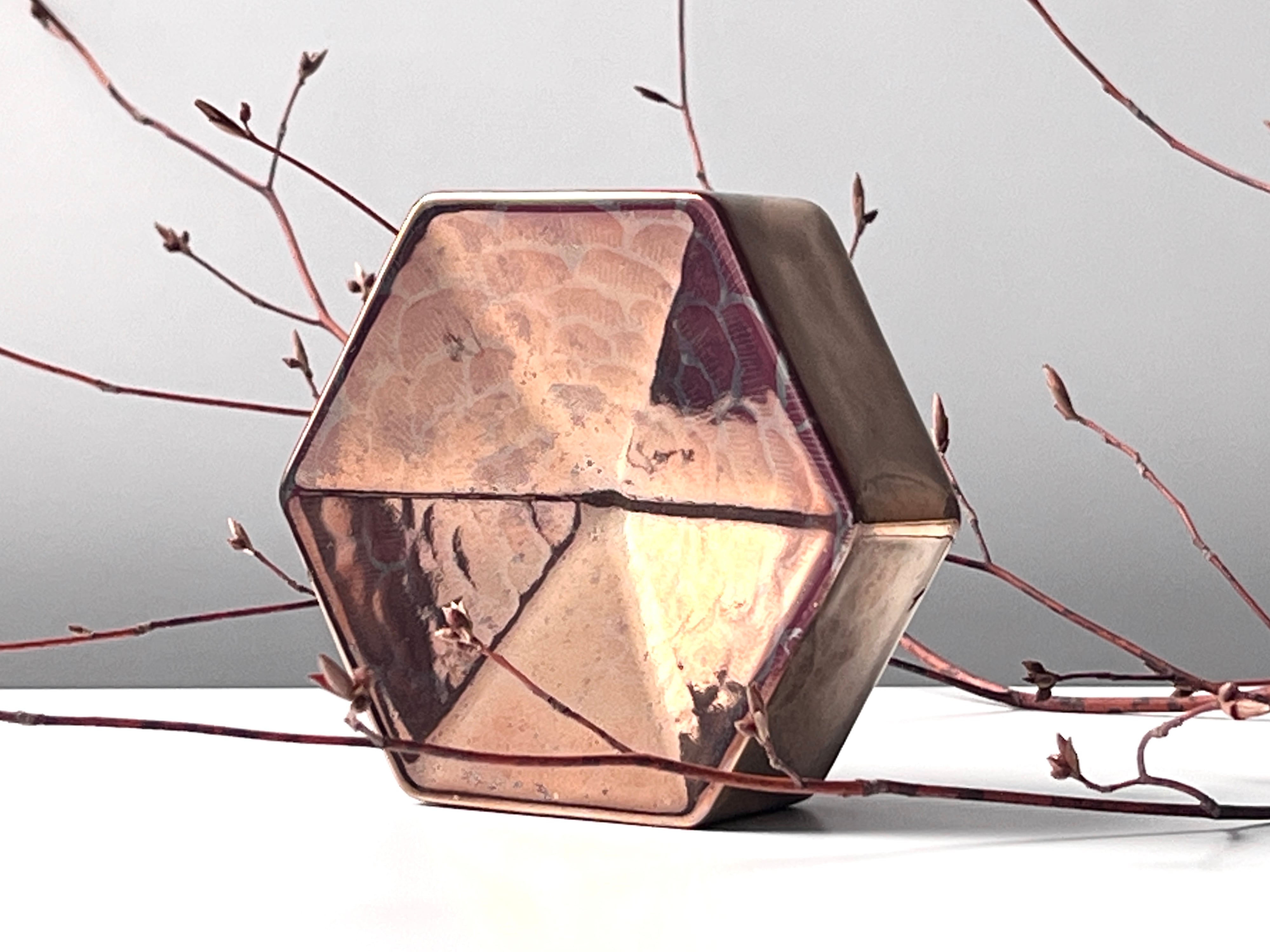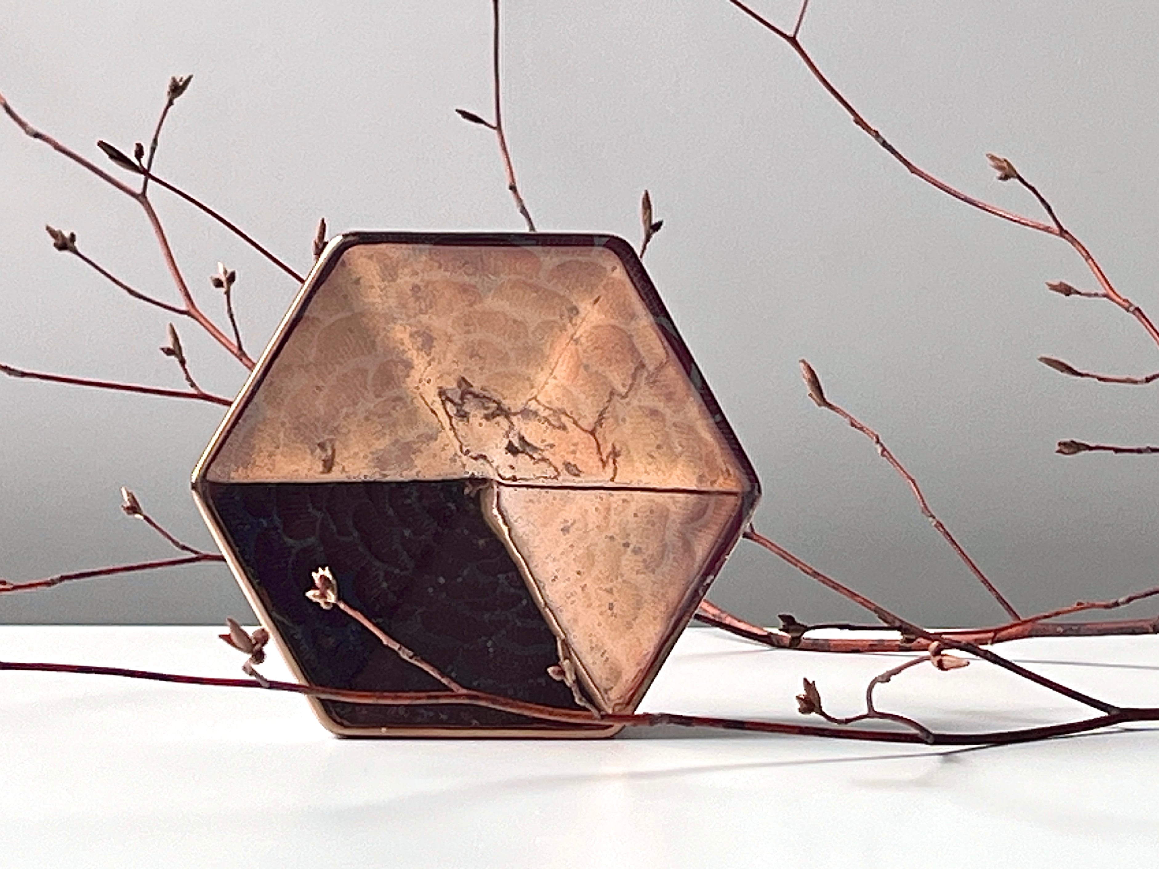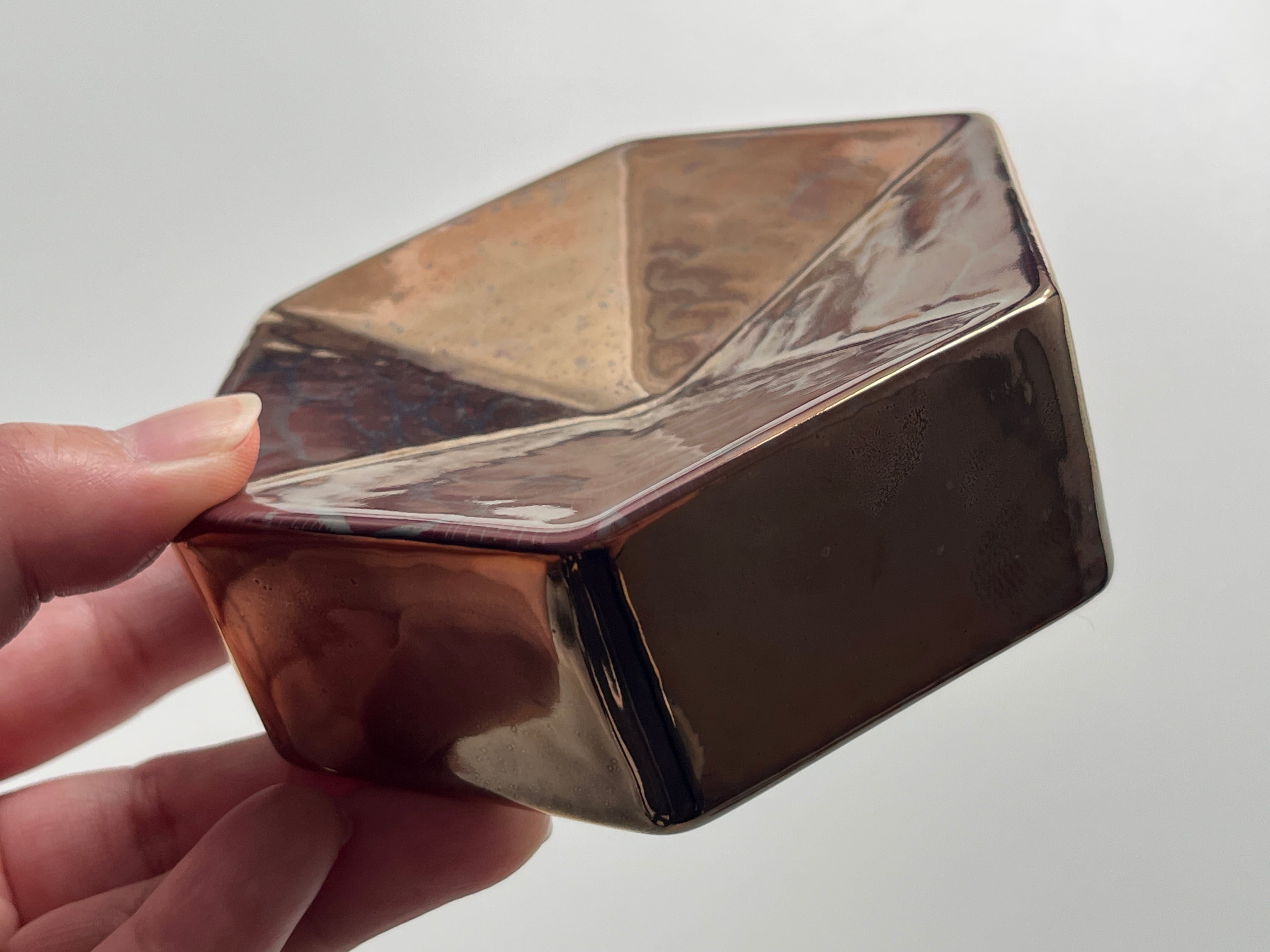 ヘキサゴンディッシュは六角形の立体構造で、中央に向かってやや傾斜した形状をしており、ちょっとした小物を置くこともできますし、このまま立てて飾ったり、後ろのホールを活かして壁飾りにすることもできます。