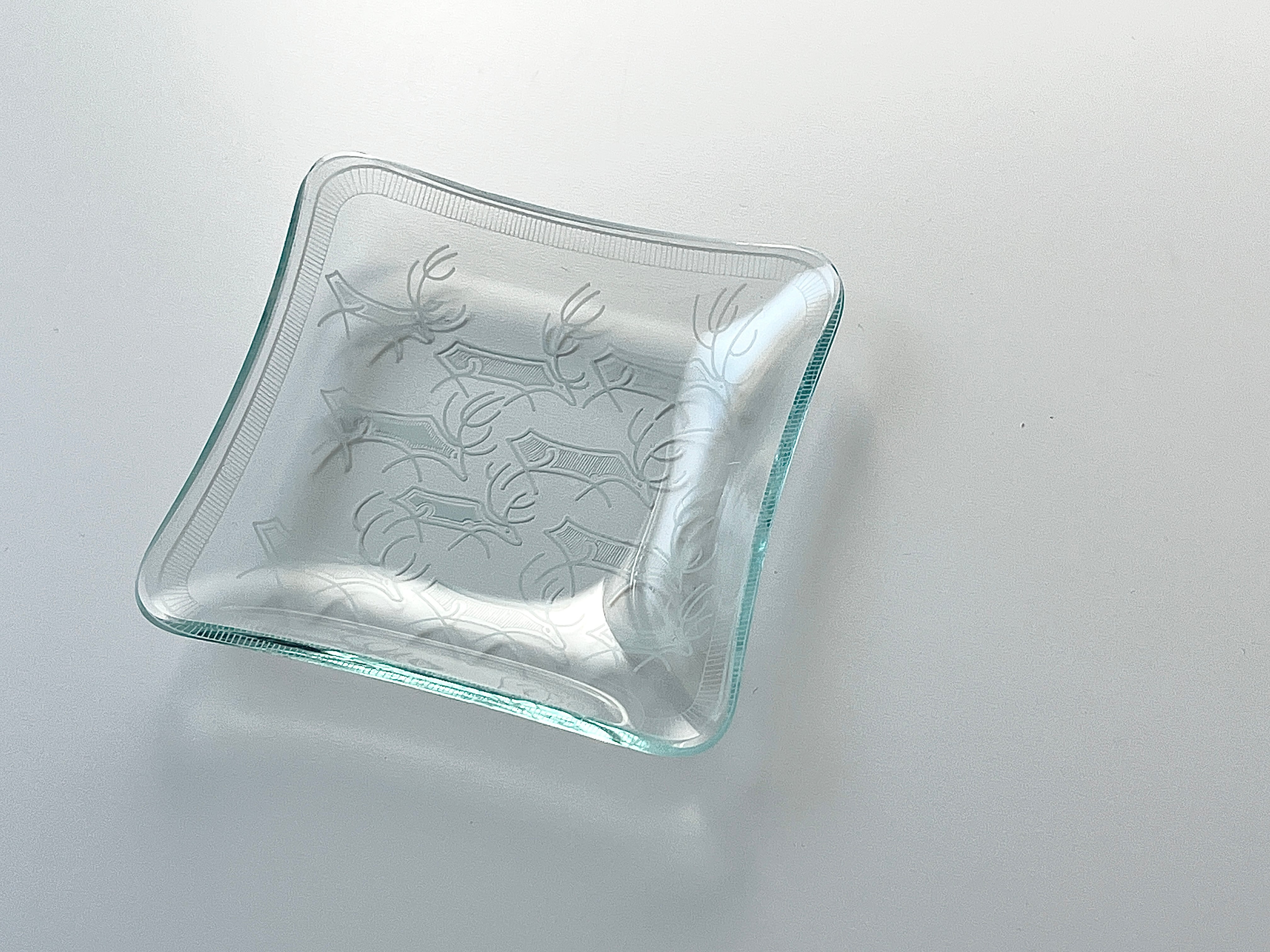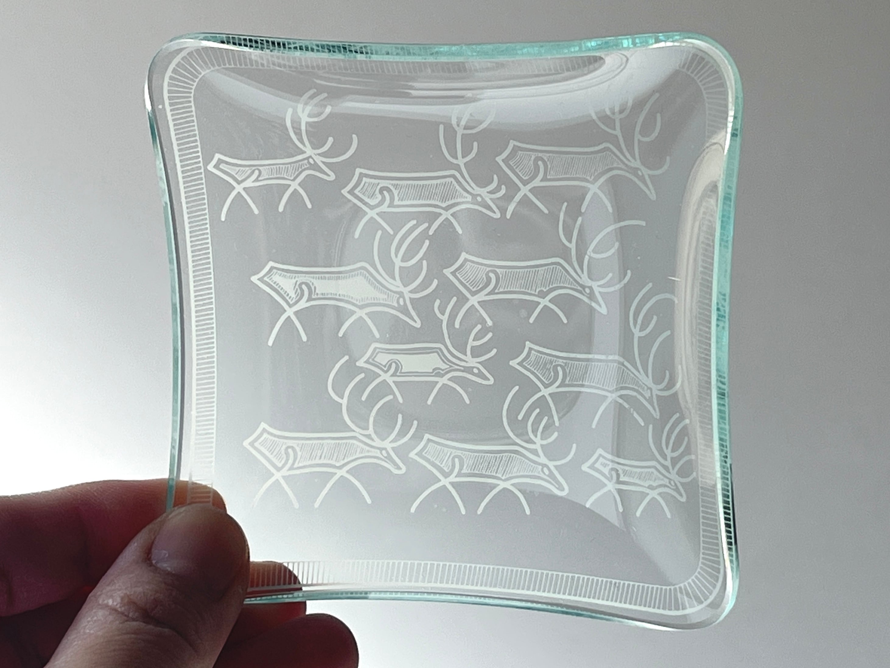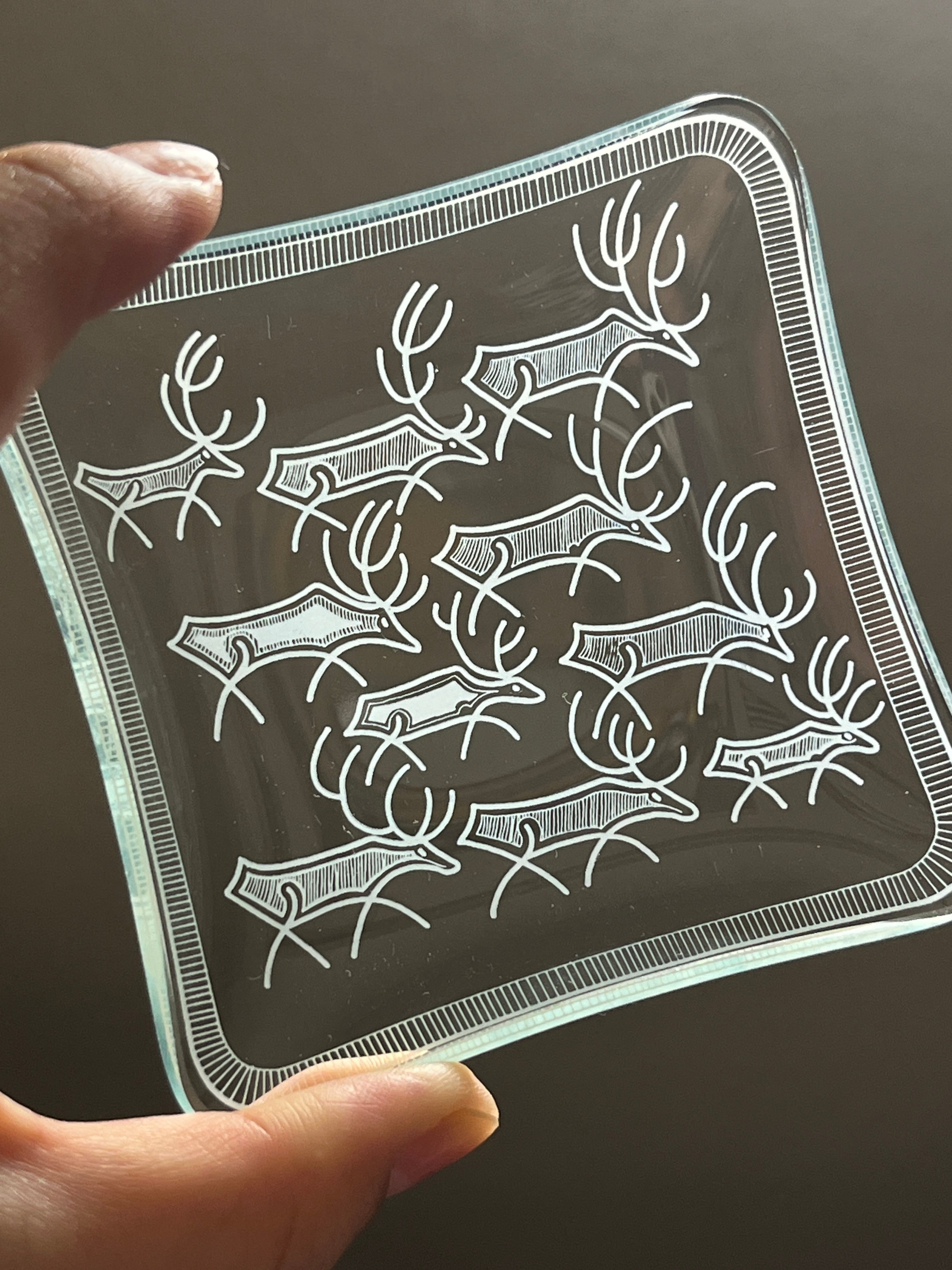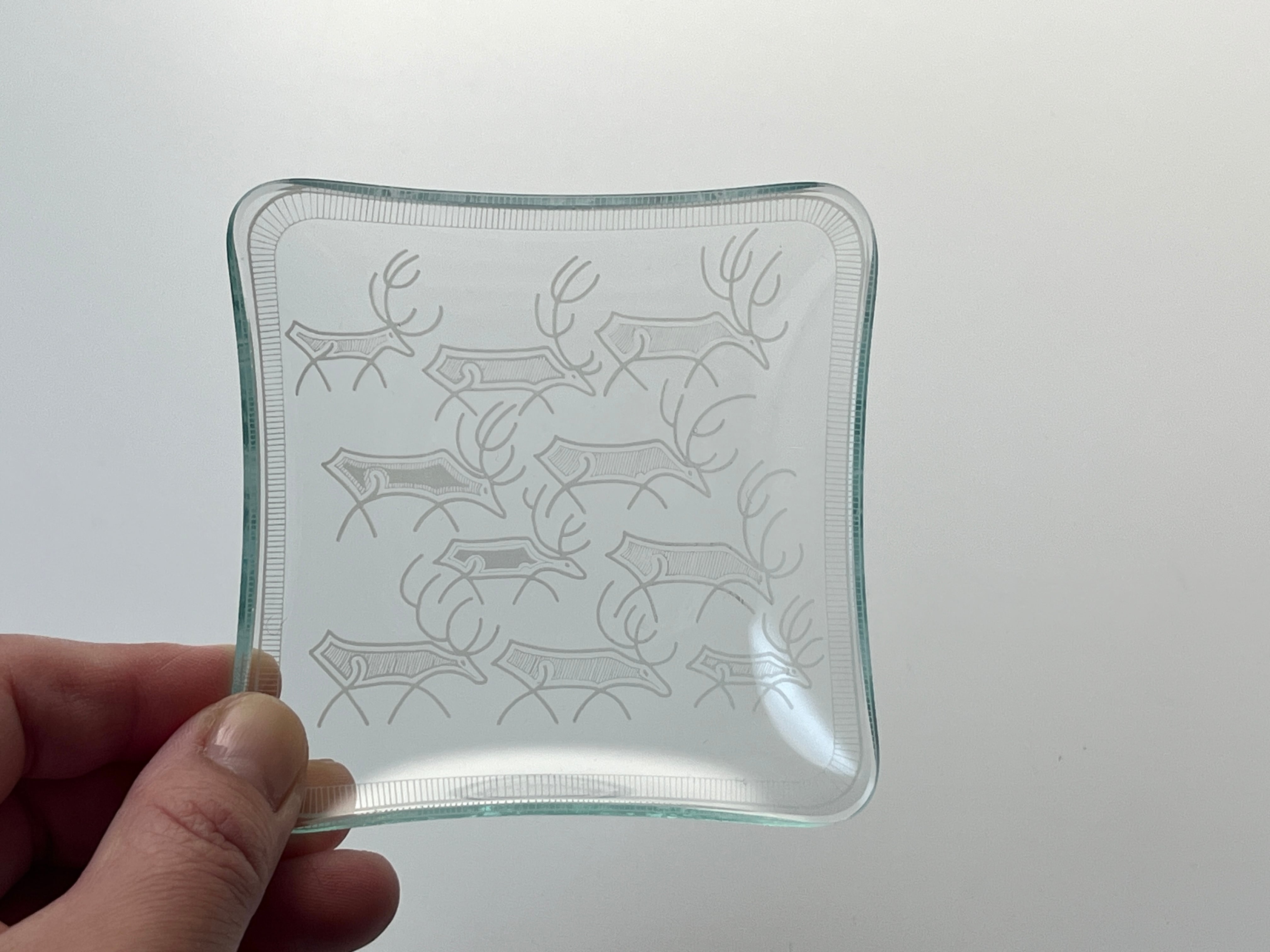 1952年にヘルシンキで開催されたオリンピックの記念品として作られた物なのだそうで、グリーンがかった色味のあるガラスに、フィンランドの先住民族であるサーミの暮らしをテーマとしてトナカイが描かれています。