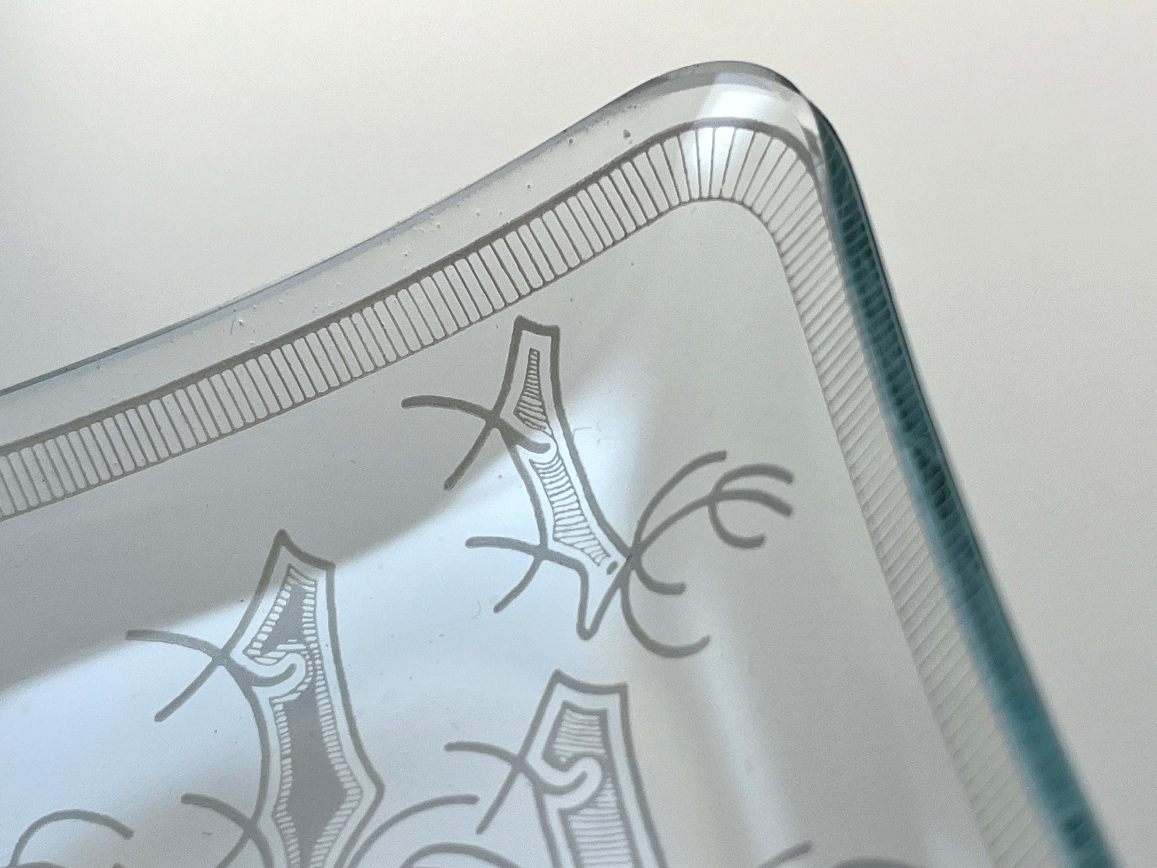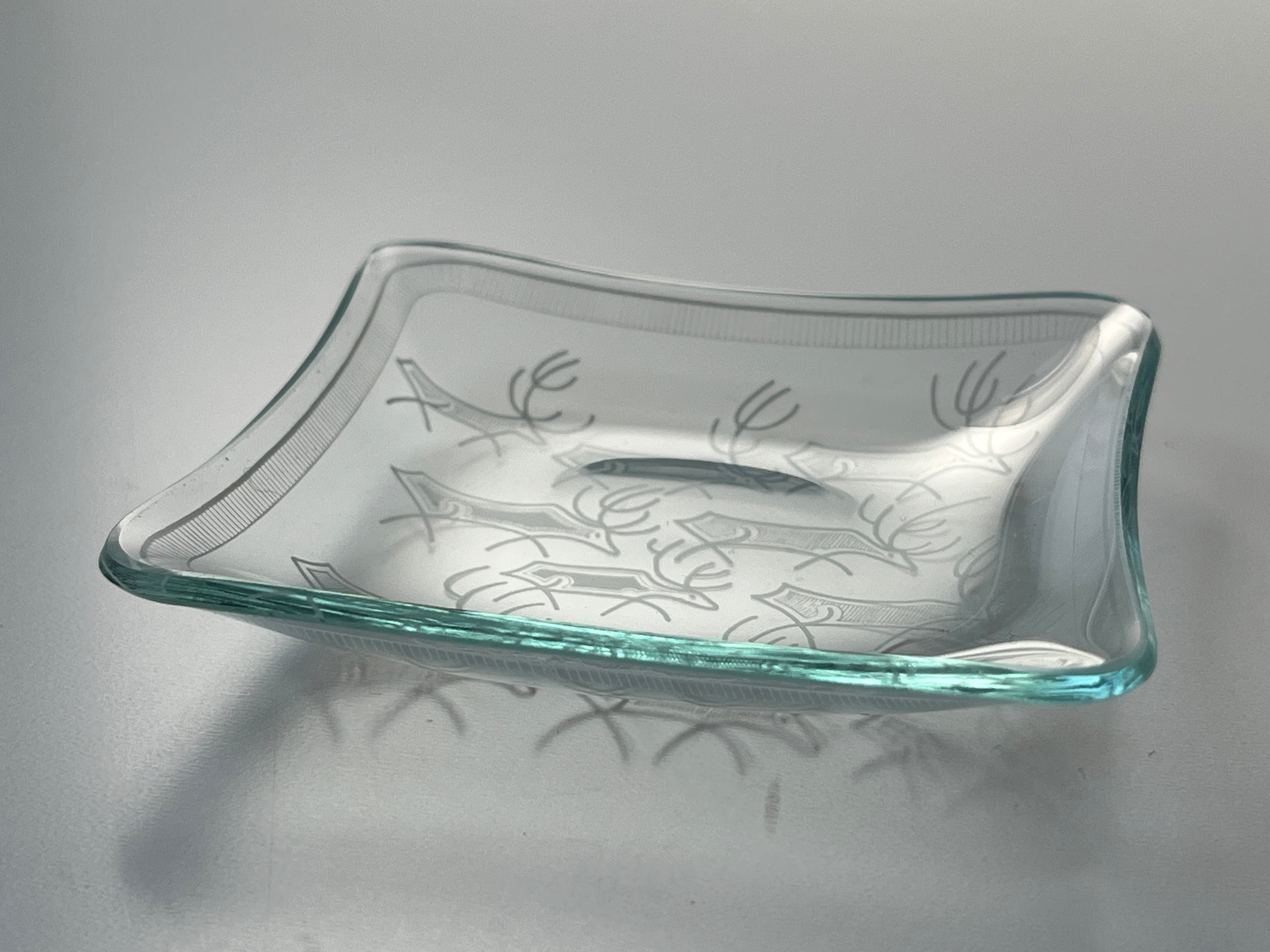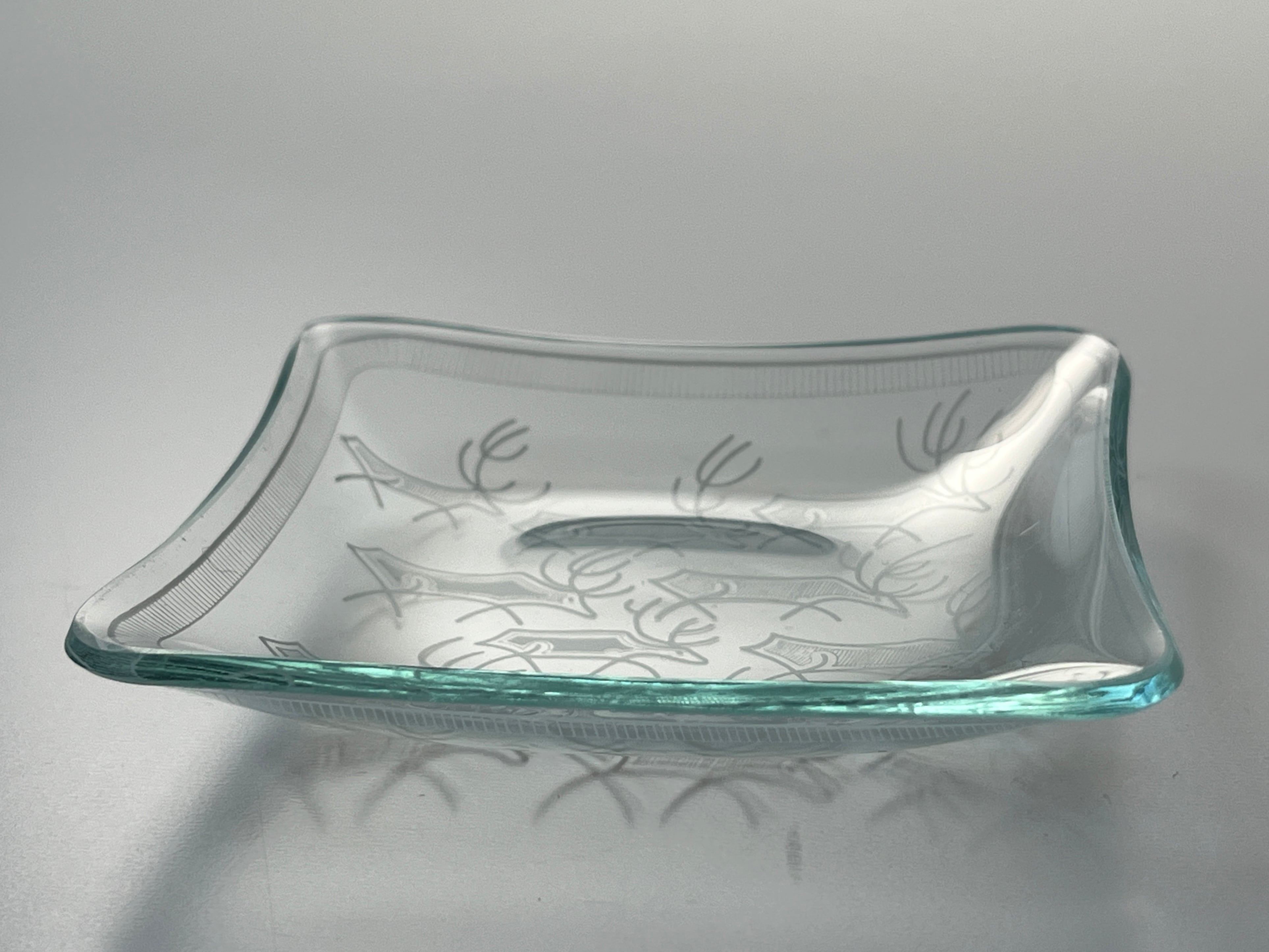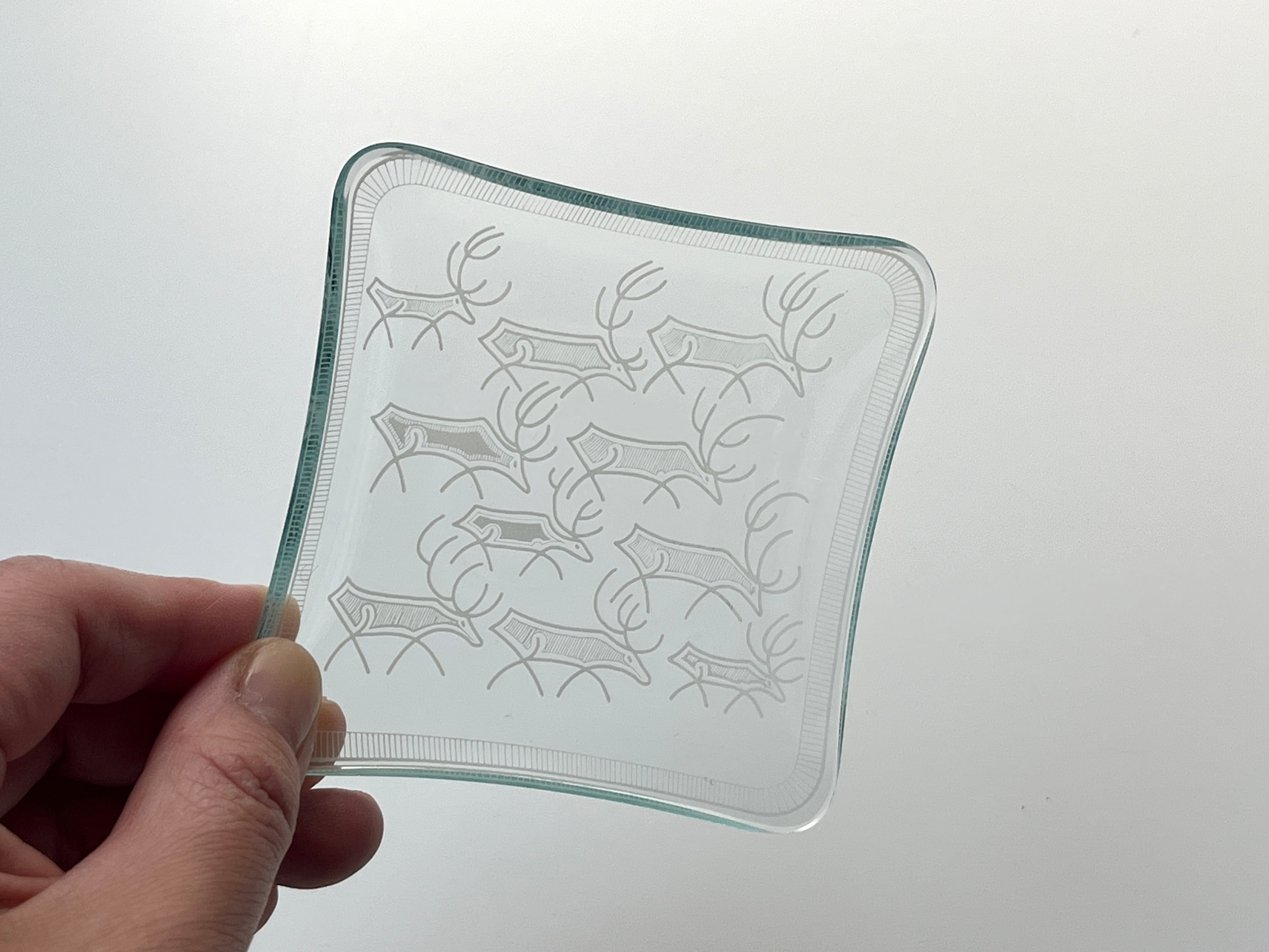 1952年にヘルシンキで開催されたオリンピックの記念品として作られた物なのだそうで、グリーンがかった色味のあるガラスに、フィンランドの先住民族であるサーミの暮らしをテーマとしてトナカイが描かれています。