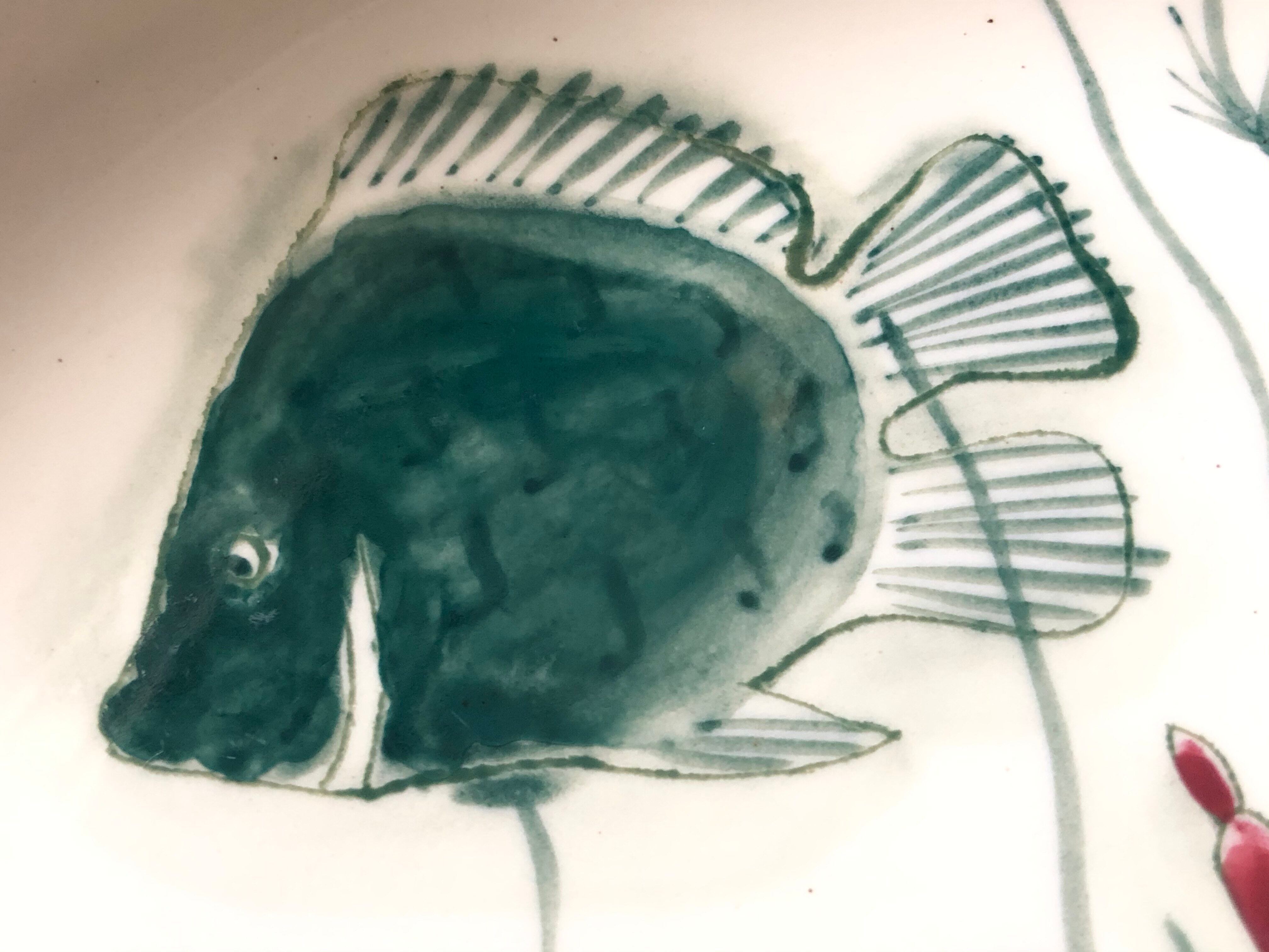 図案はすべて手描きで絵付けされており、海をテーマにカラフルかつコミカルなタッチで魚やカニ、クラゲなどが書かれています。同じ図案であっても一つ一つに個性があり、二つとして同じものが存在しないのも手描きの面白さです。