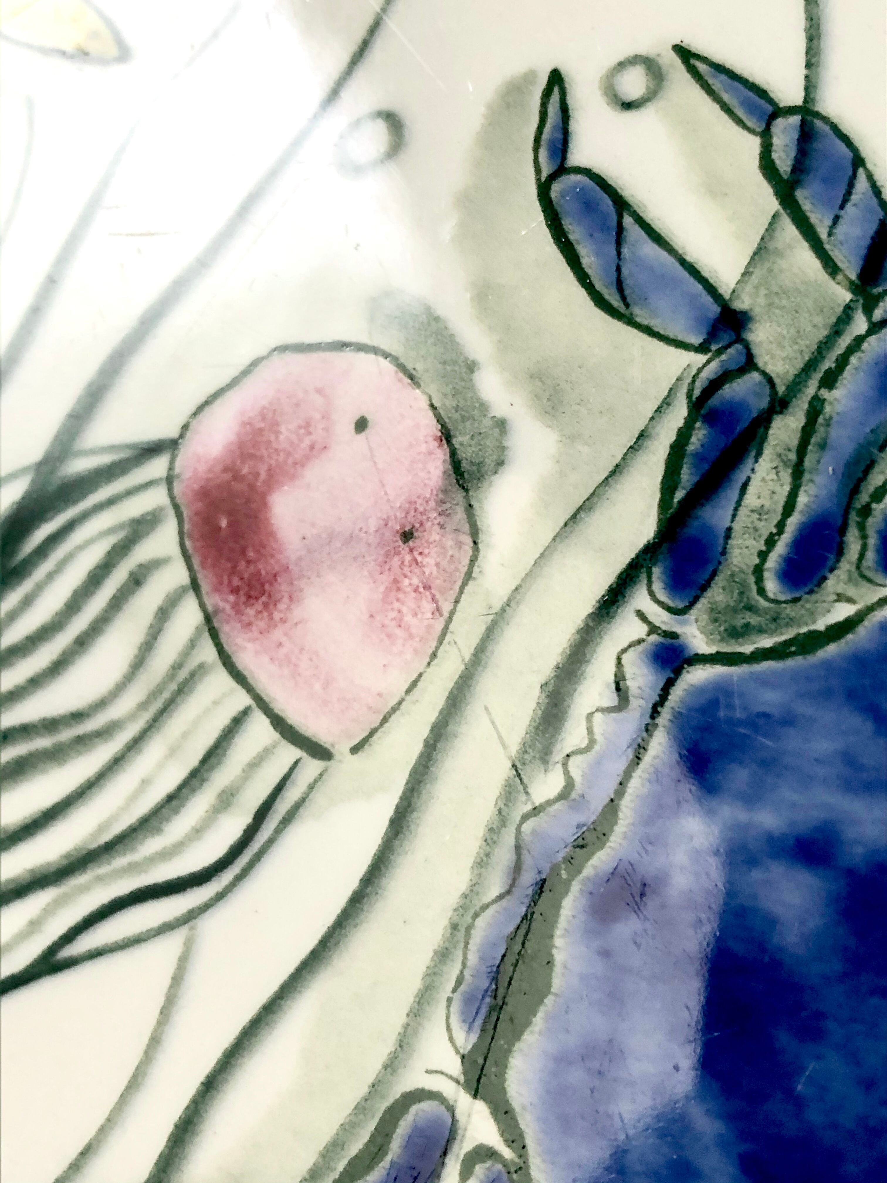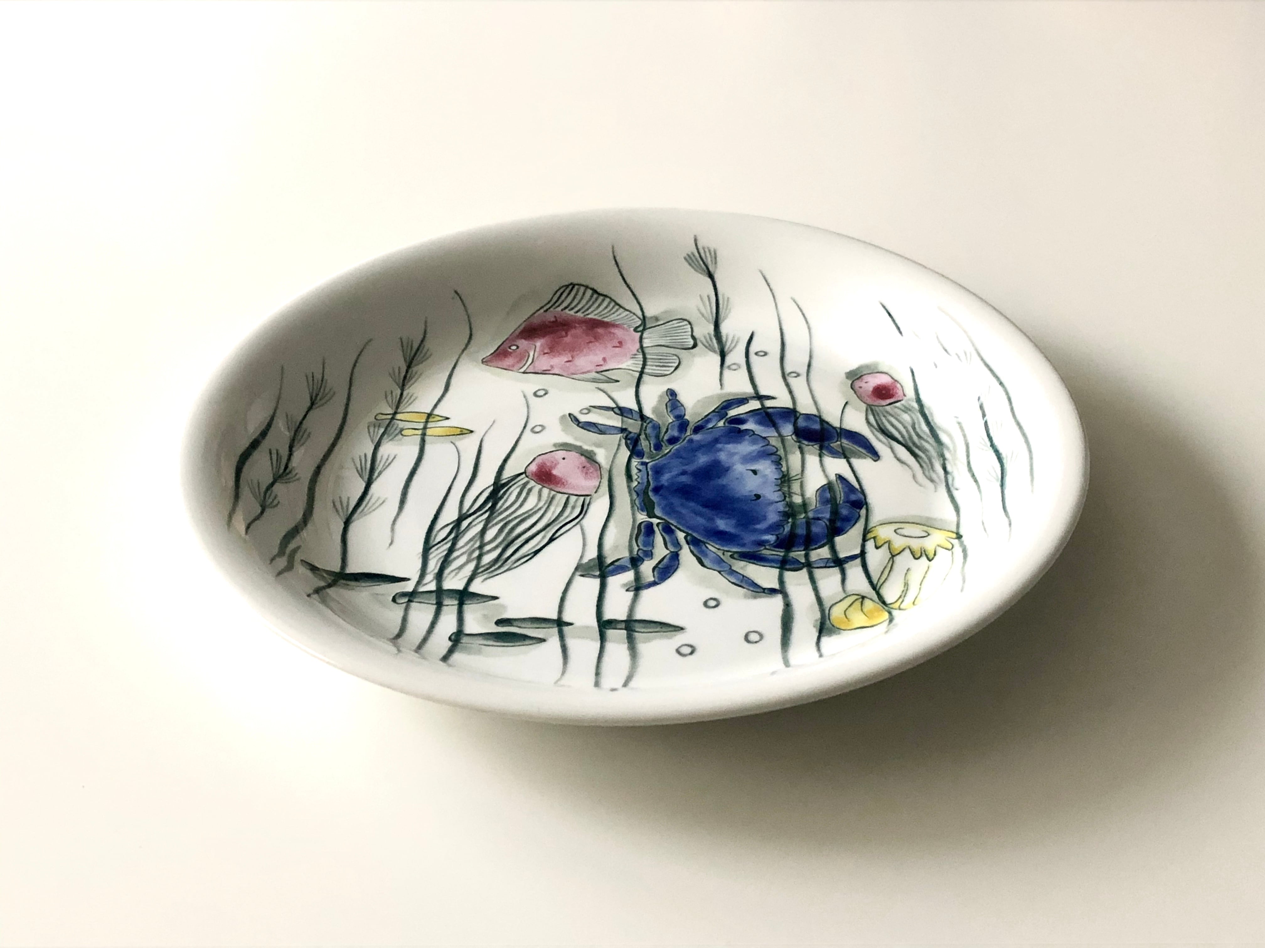 図案はすべて手描きで絵付けされており、海をテーマにカラフルかつコミカルなタッチで魚やカニ、クラゲなどが書かれています。同じ図案であっても一つ一つに個性があり、二つとして同じものが存在しないのも手描きの面白さです。
