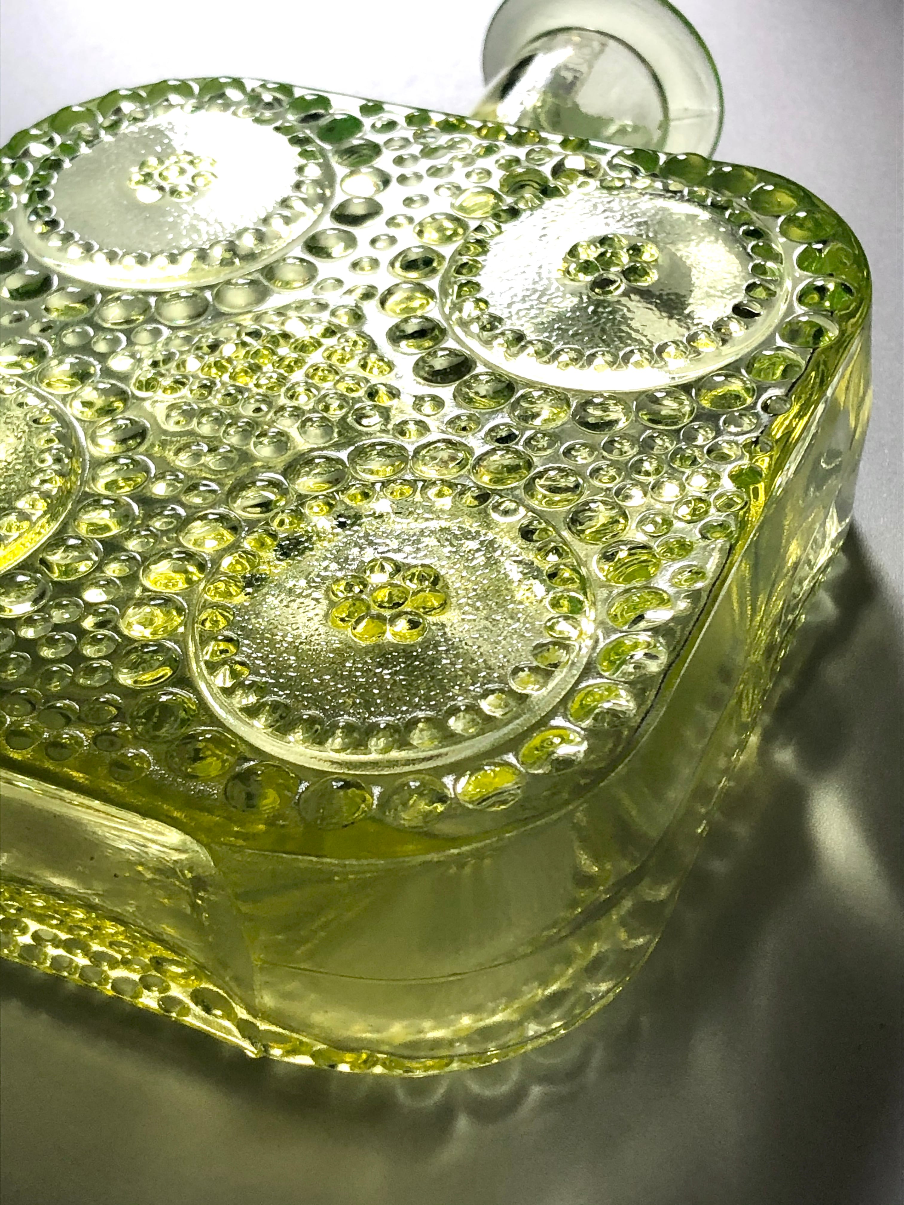 ウランガラスを用いた製品は現在、ごく限られた生産者でしか製造されていないため、ガラスそのものに希少性があり、世界中にウランガラスのコレクターがいるほどです。(日本でもウランガラスの専門店があります)コレクターたちはUVライトをもって、蛍光色に輝くガラスを探して各地のスリフトや古道具屋巡りをしているようです。