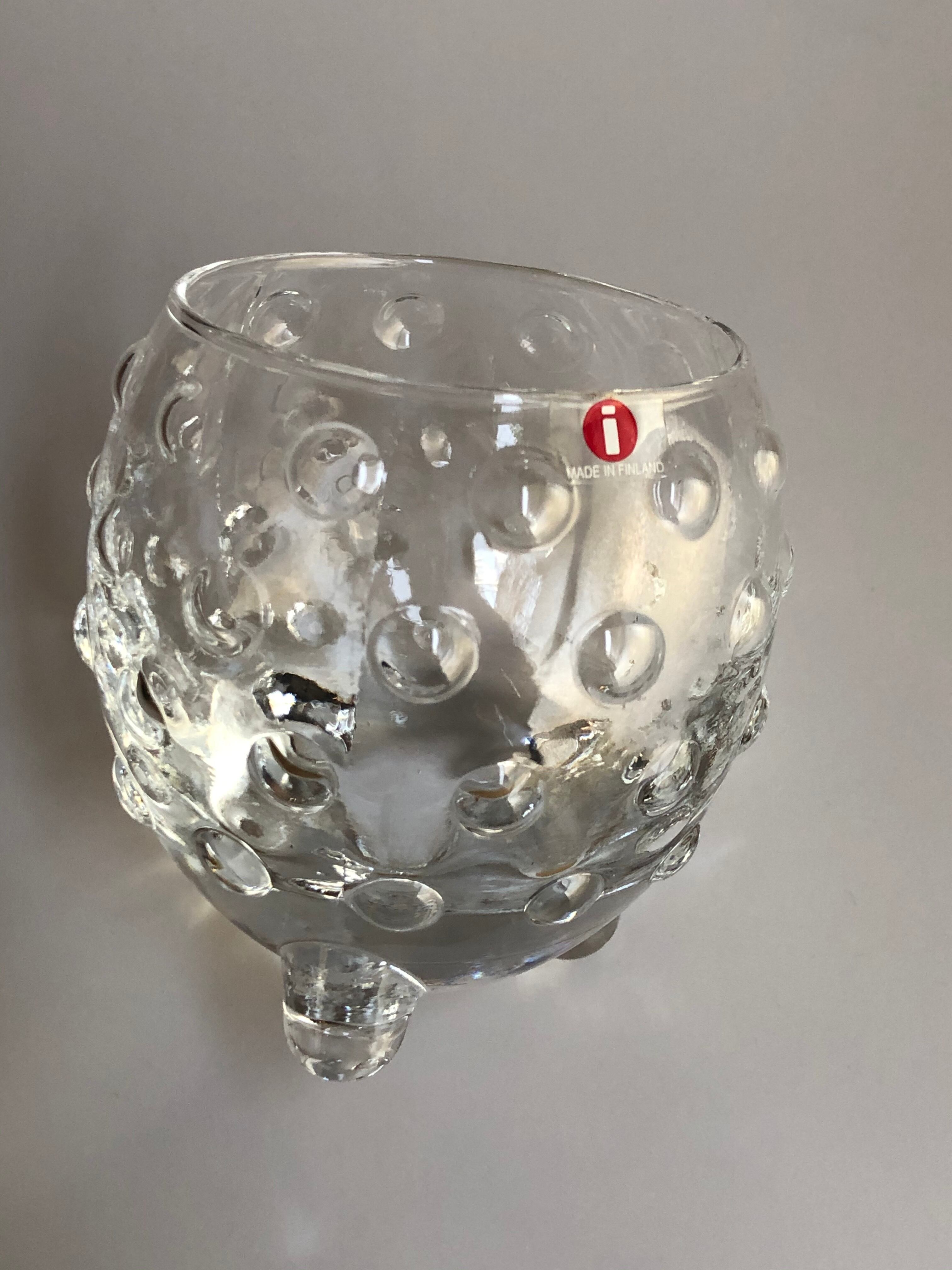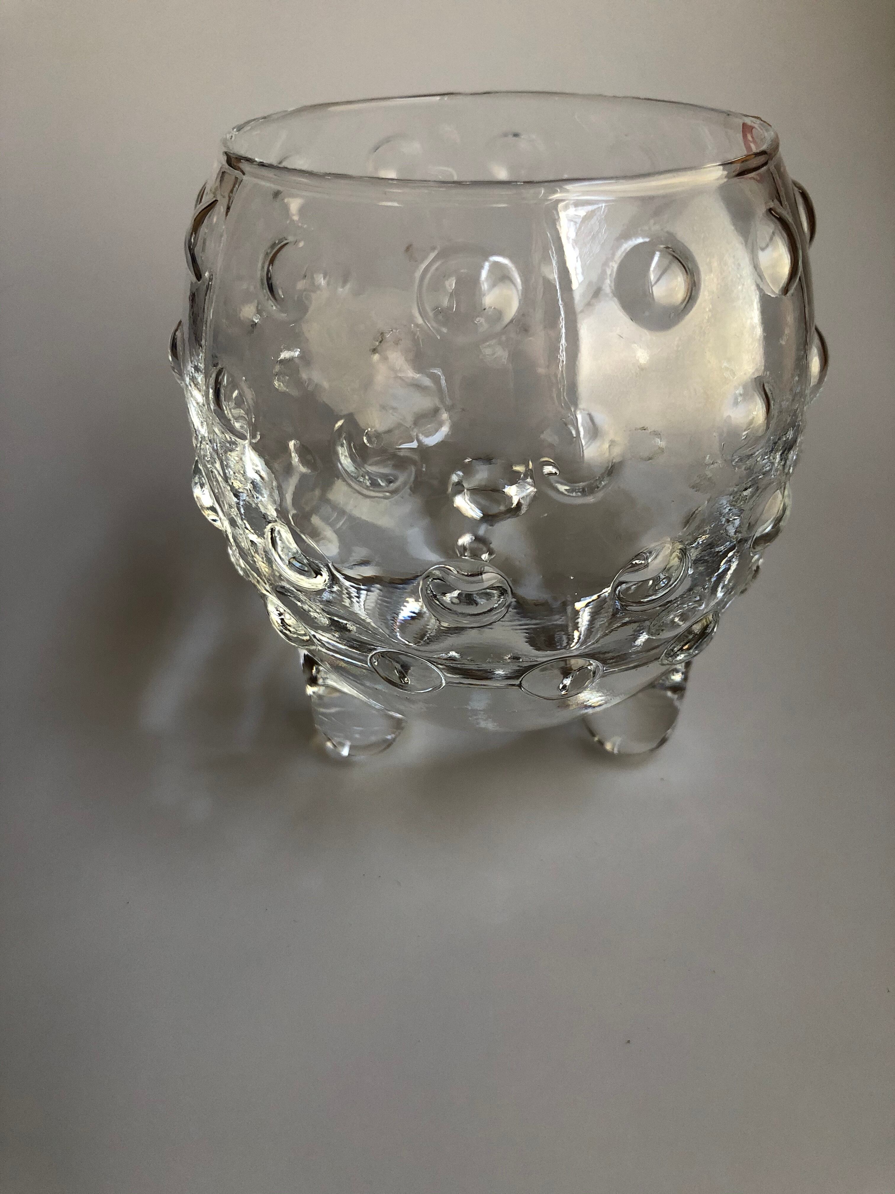 ガラスの表面にドット状の突起があしらわれており、丸くて短い三本の脚が面白いとてもユニークなアイテムです。