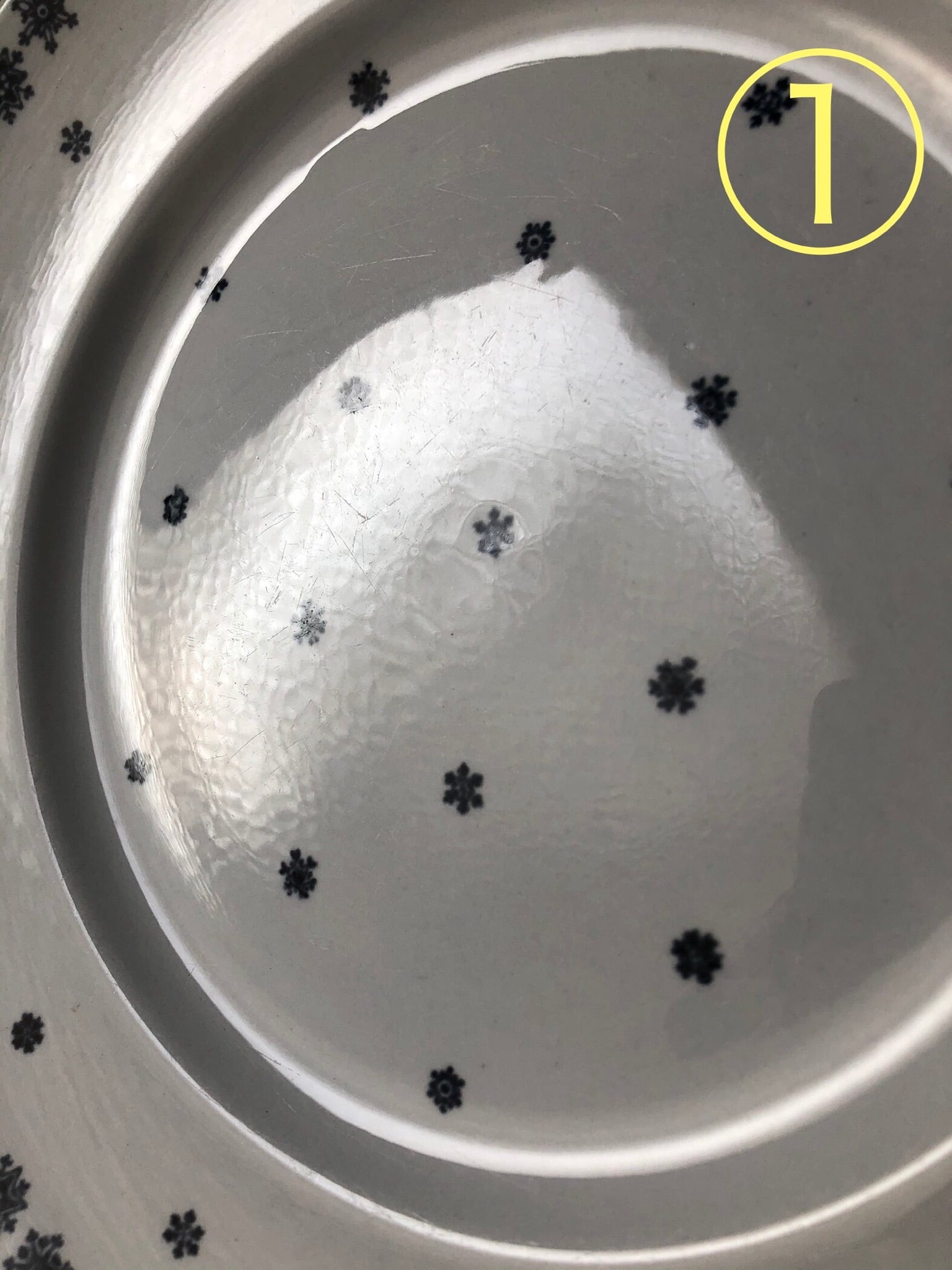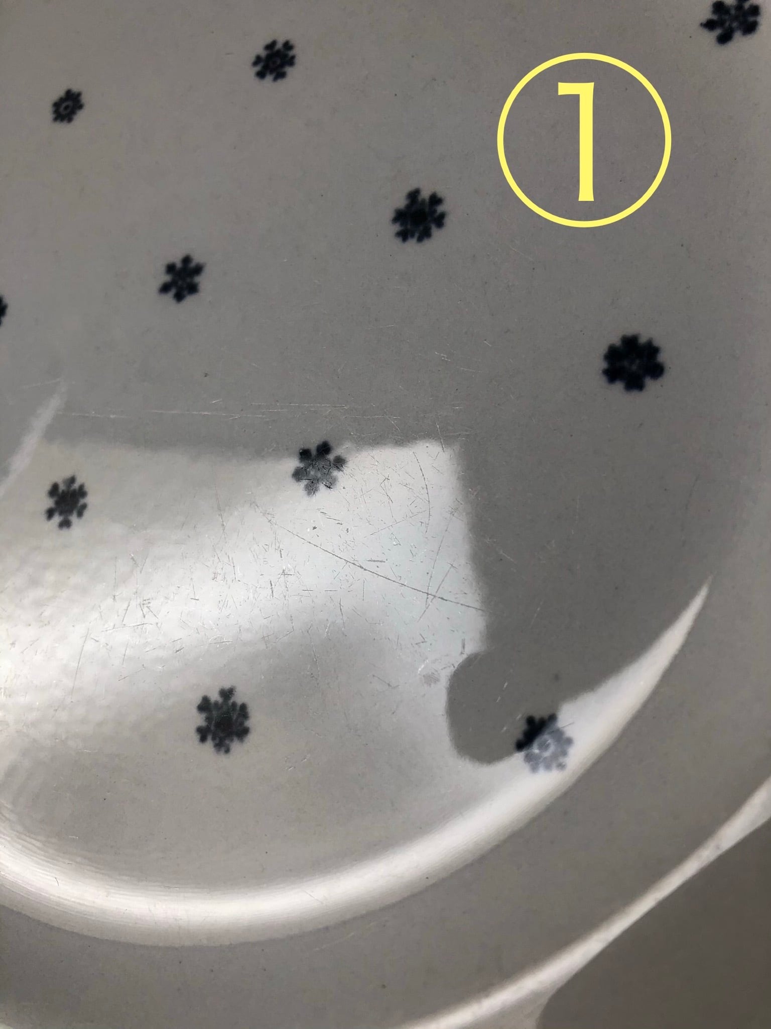 製造段階でできるプリントの滲みや色飛びや、釉薬のよれによる凹凸が見受けられます。マークアップ②の画像と拡大画像でご確認ください。