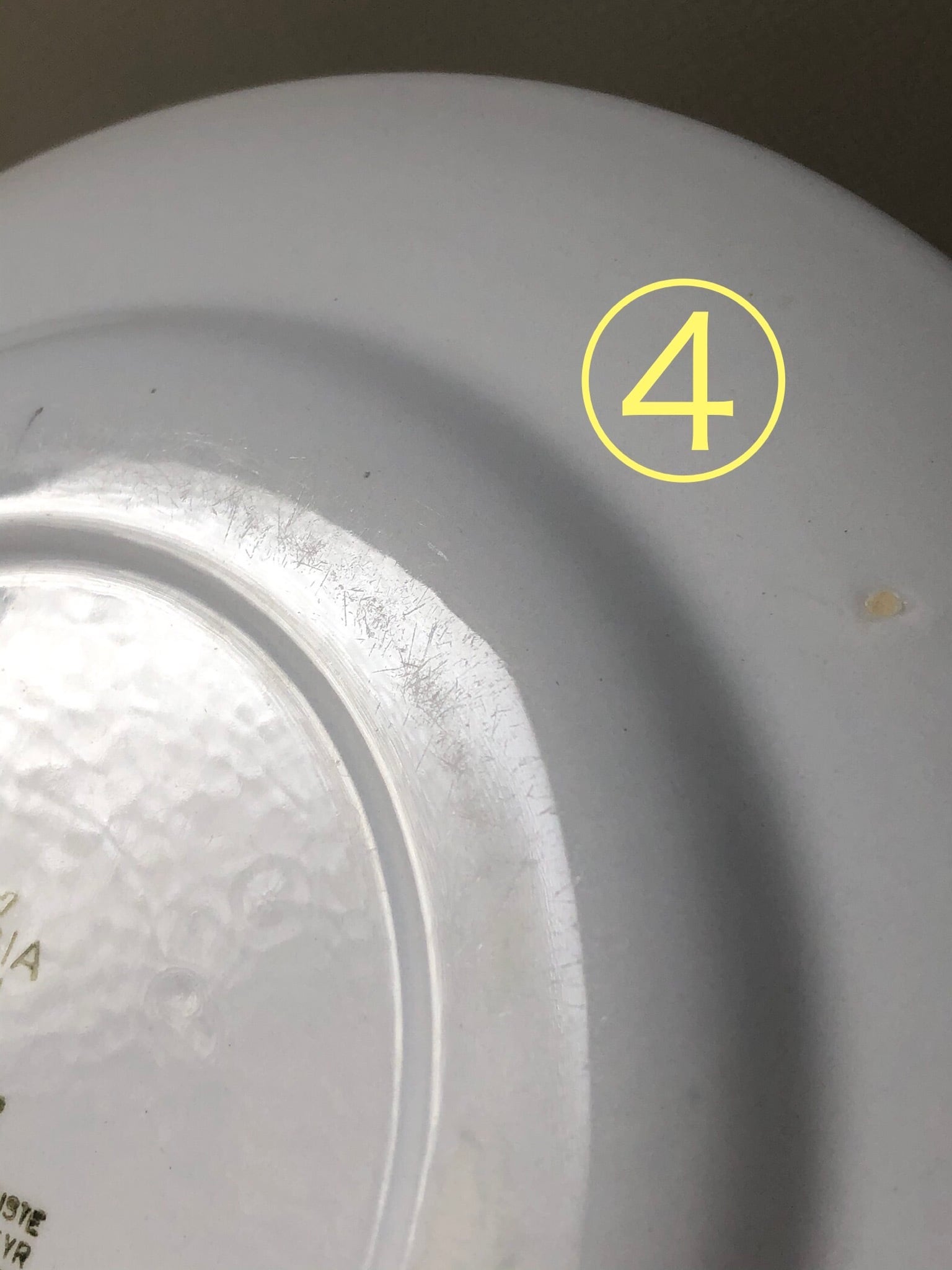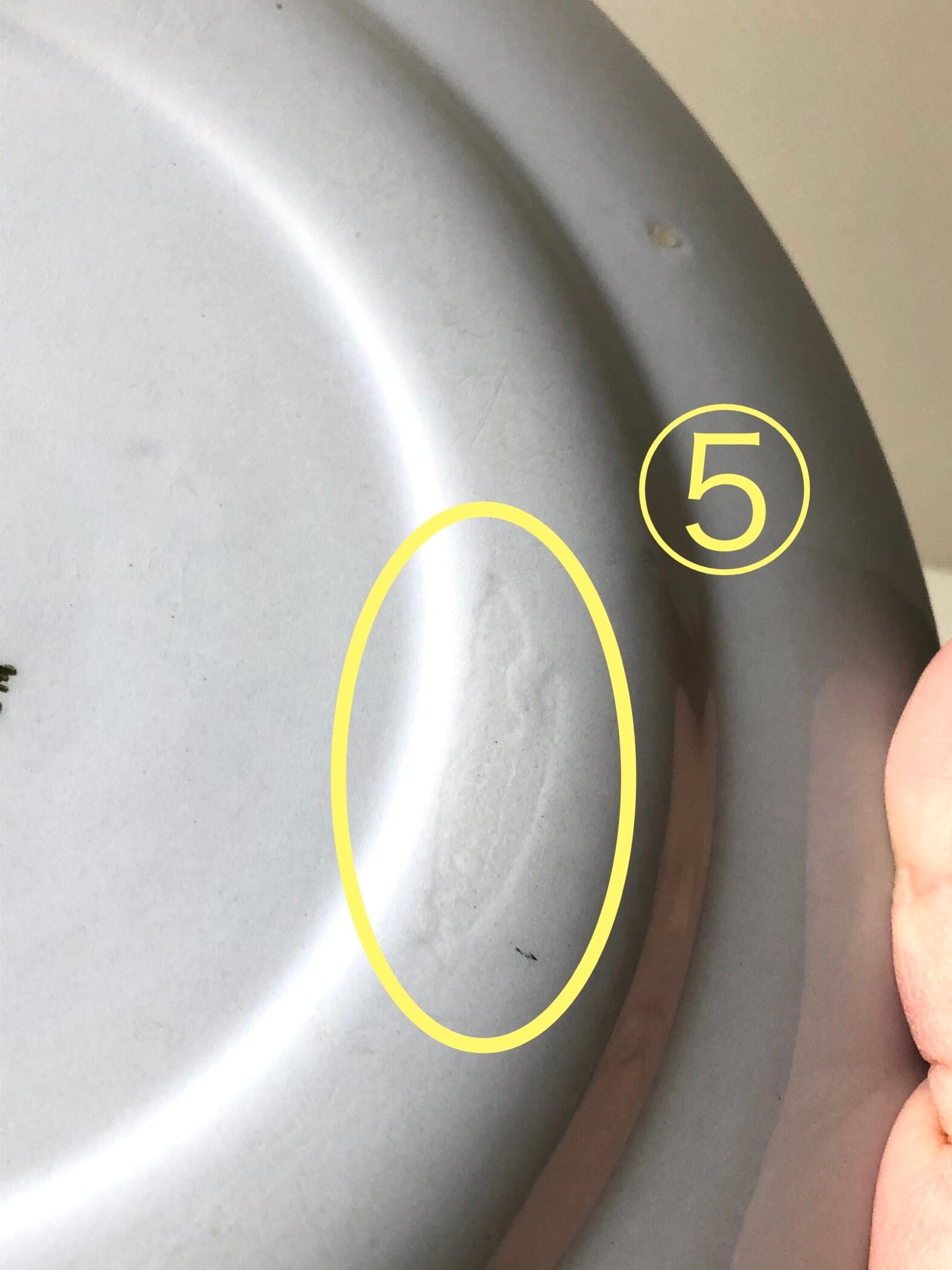 裏側に支柱痕(焼き物がくっつかないように支える丸めた土「支柱」を外した痕)と釉薬のよれたような部分があります。マークアップ③の画像でご確認ください。