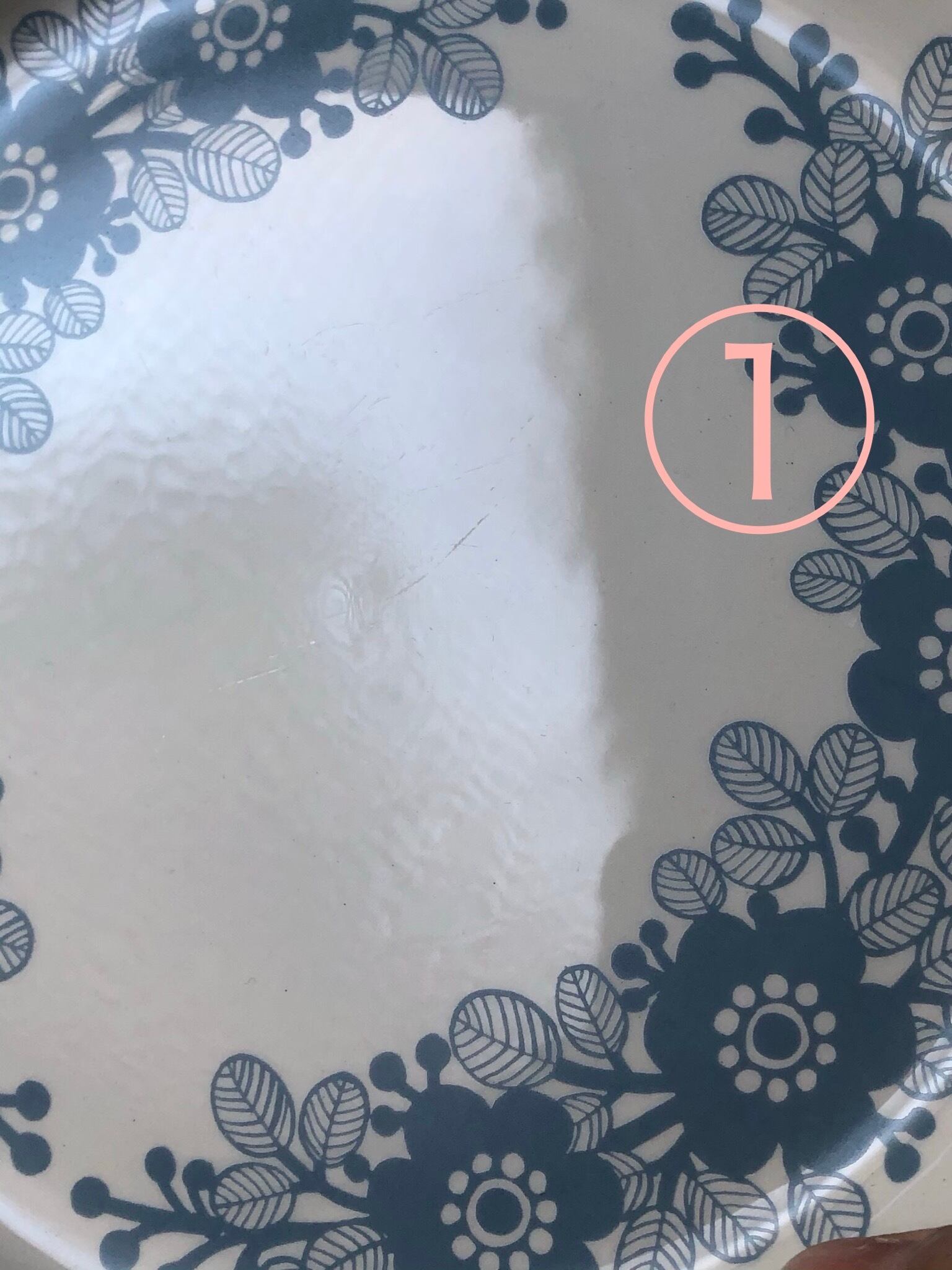 表面の真ん中に少し目立つスクラッチがみられ、リムの付近にわずかな擦れがありますが、表面にはそれ以外の傷が殆どないほどきれいです。裏面の高台には軽い擦れ傷が見受けられます。