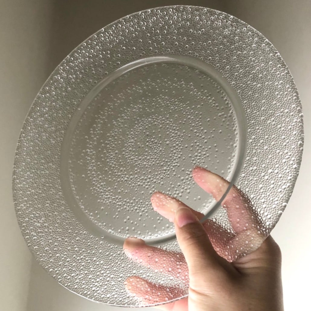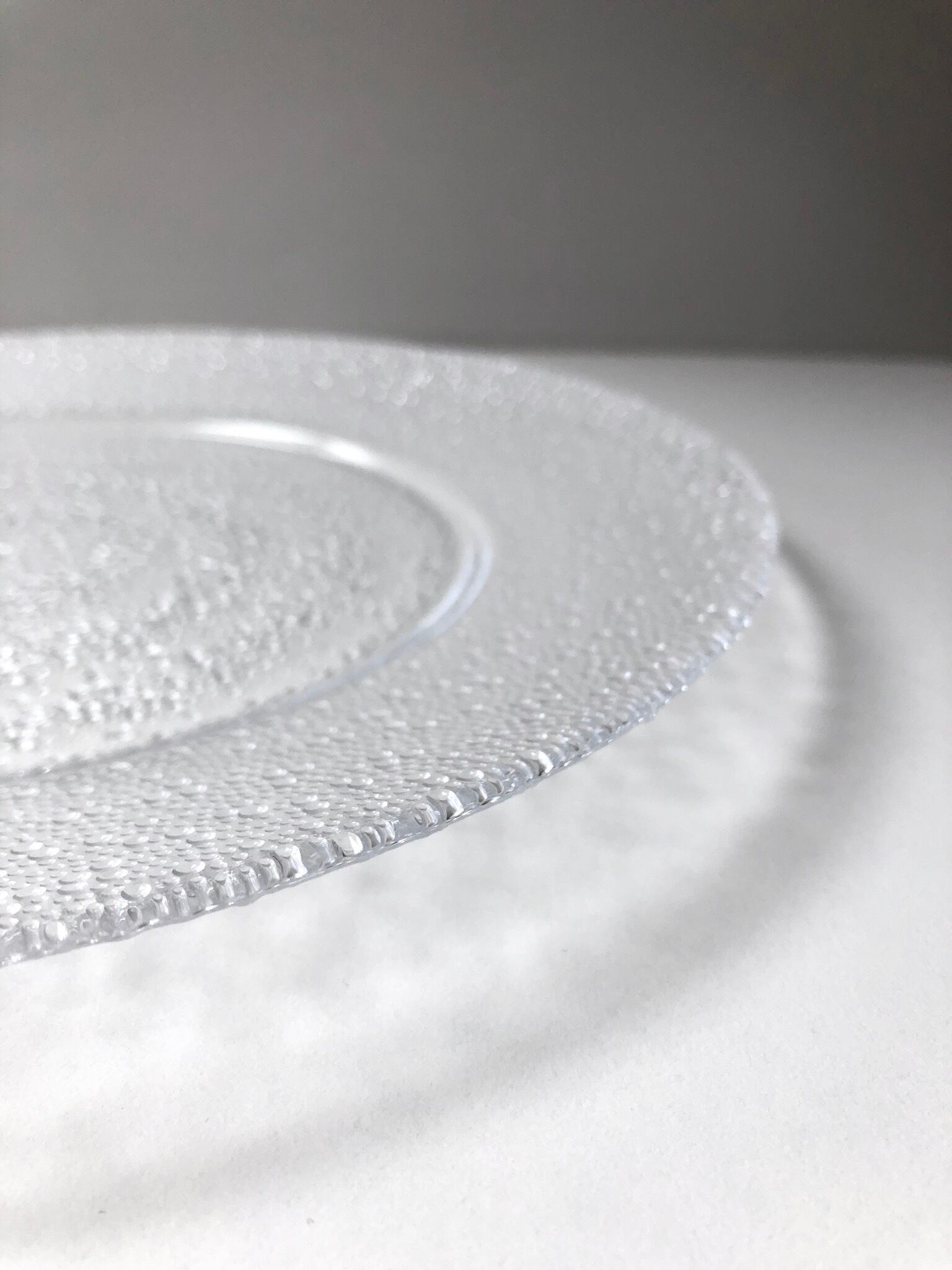 ウルティマツーレの作者としても有名なタピオ・ウィルカラによるデザインで、おそらく1960年代ないし70年代に頃に製造されていた、Auraシリーズのガラスディナープレート25cmです。