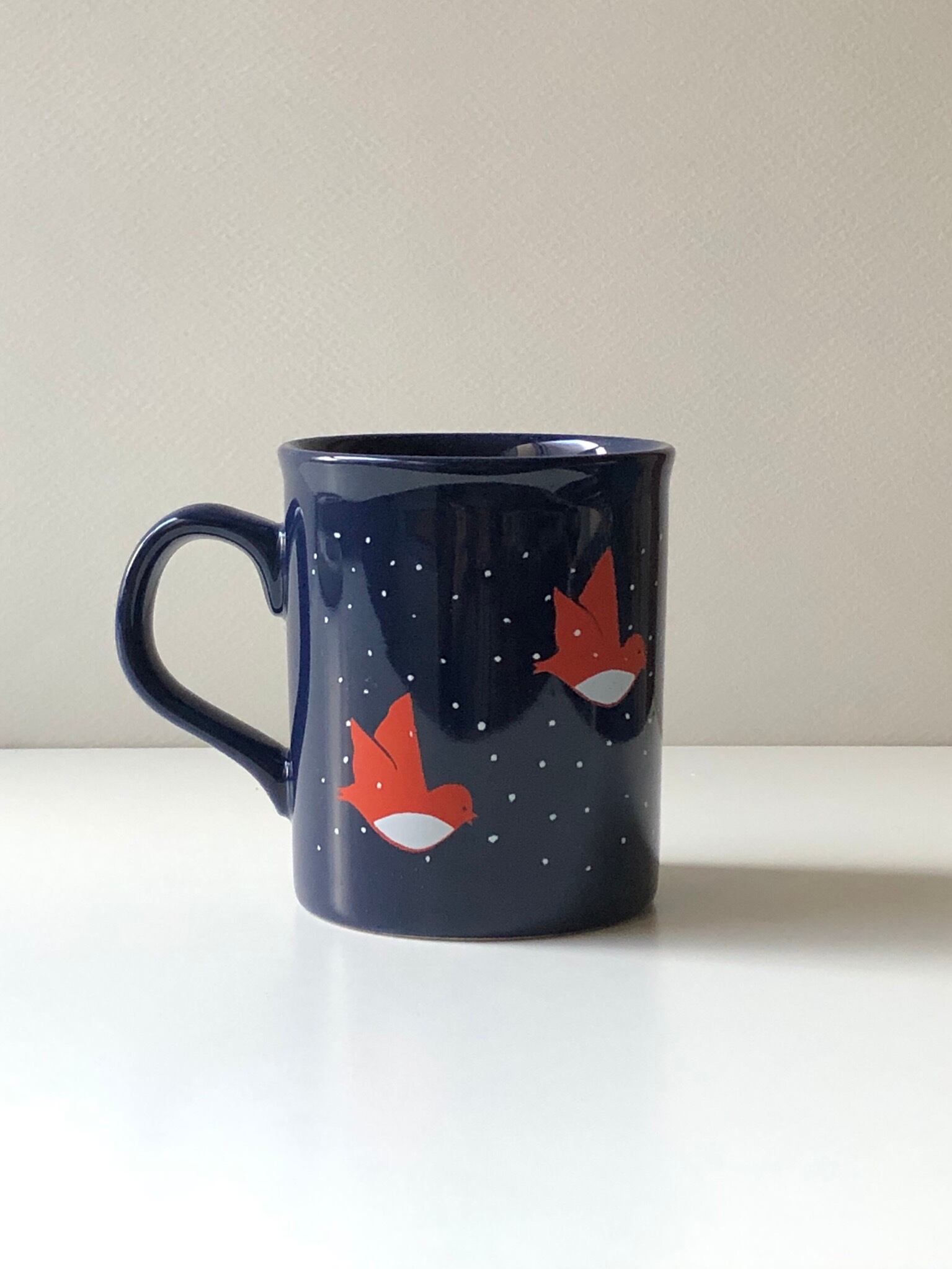 どこか懐かしいネイビーのマグにちらつく雪と、フィンランドの冬の鳥「PUNATULKKU・プナトゥルック」が描かれています。