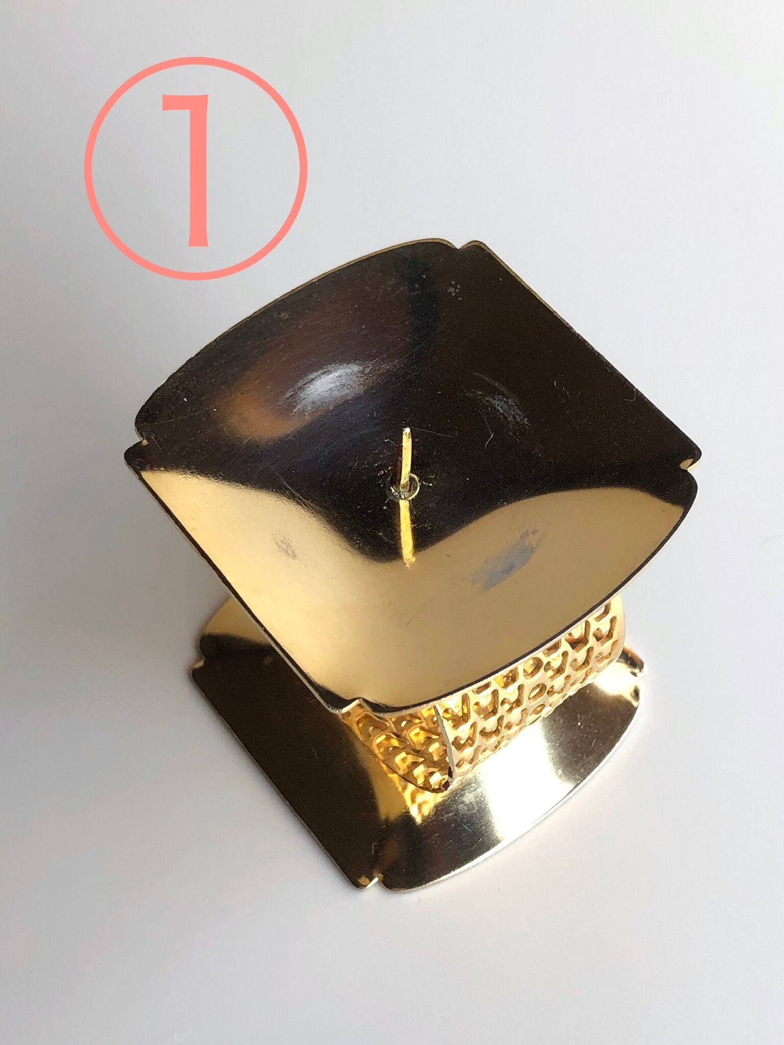 キャンドルを置く燭台の部分に細かい擦れがあり、金色が擦れて銀色になっている部分があります。おそらくキャンドルの蝋をとるときに何かで擦ってできたものではないかと思われます。