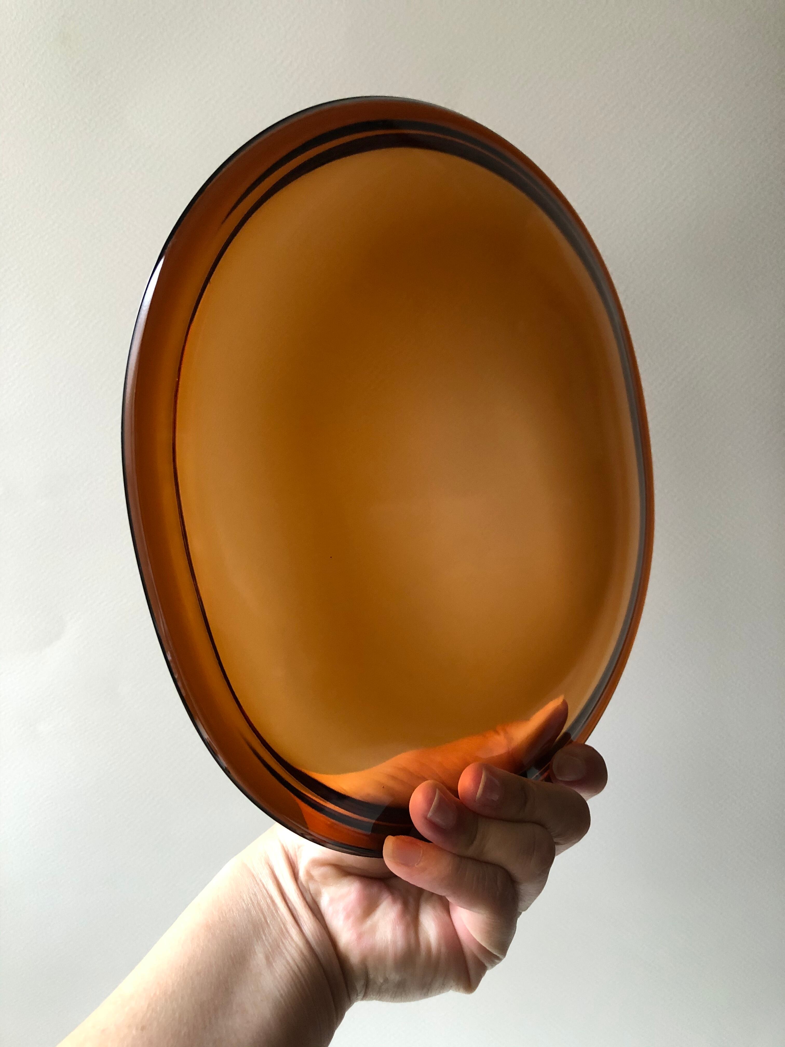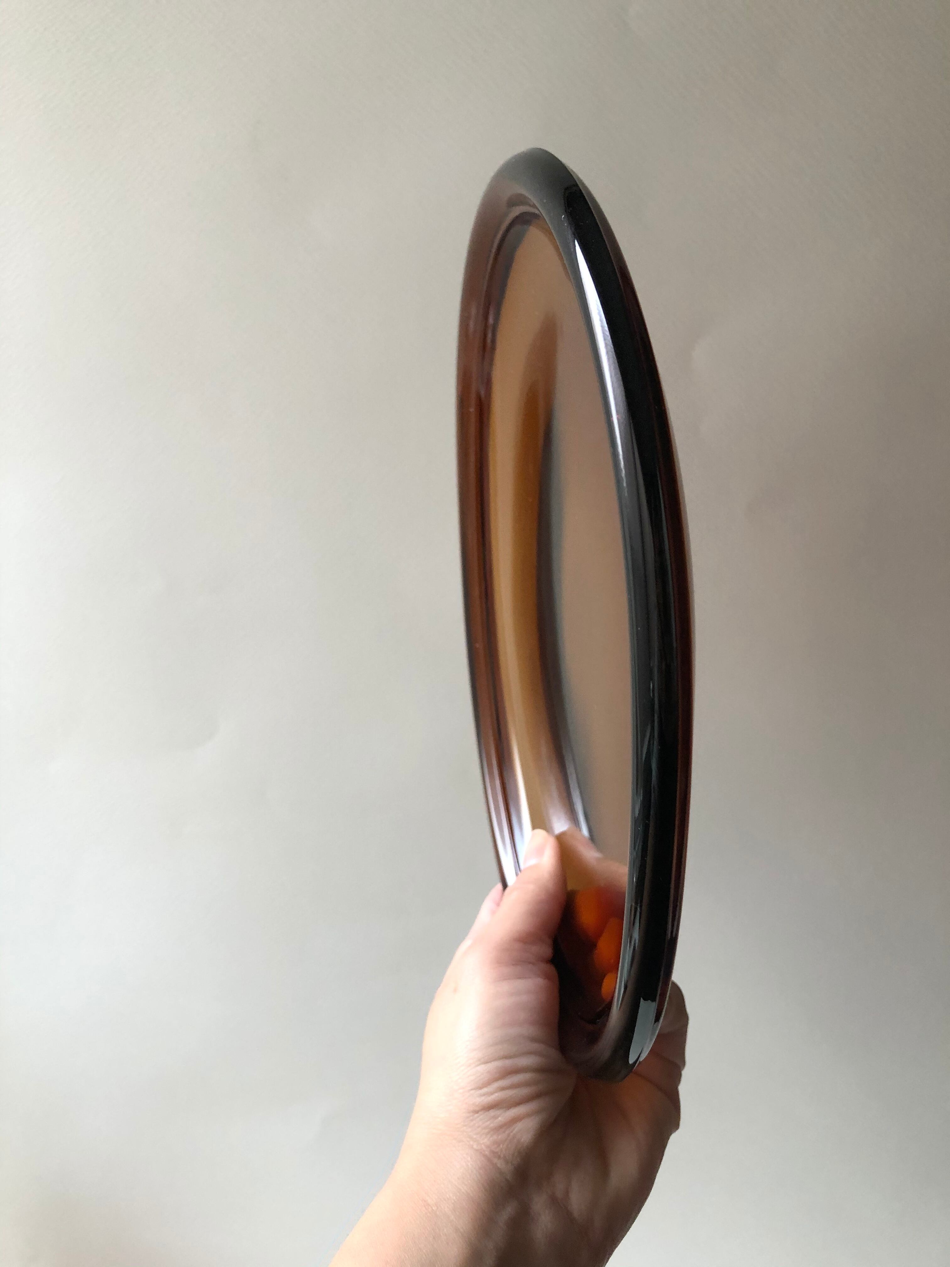 プレートの表面の真ん中あたりを中心にドーナツ状の薄いモヤのような部分がありますが、この状態はイッタラやヌータヤルヴィの古いガラスで特にプレーンなものに多く見られる状態です。製造段階で出来てしまうもので、光に透かさなければ分からない程度であり美観を損ねるようなものではありません。