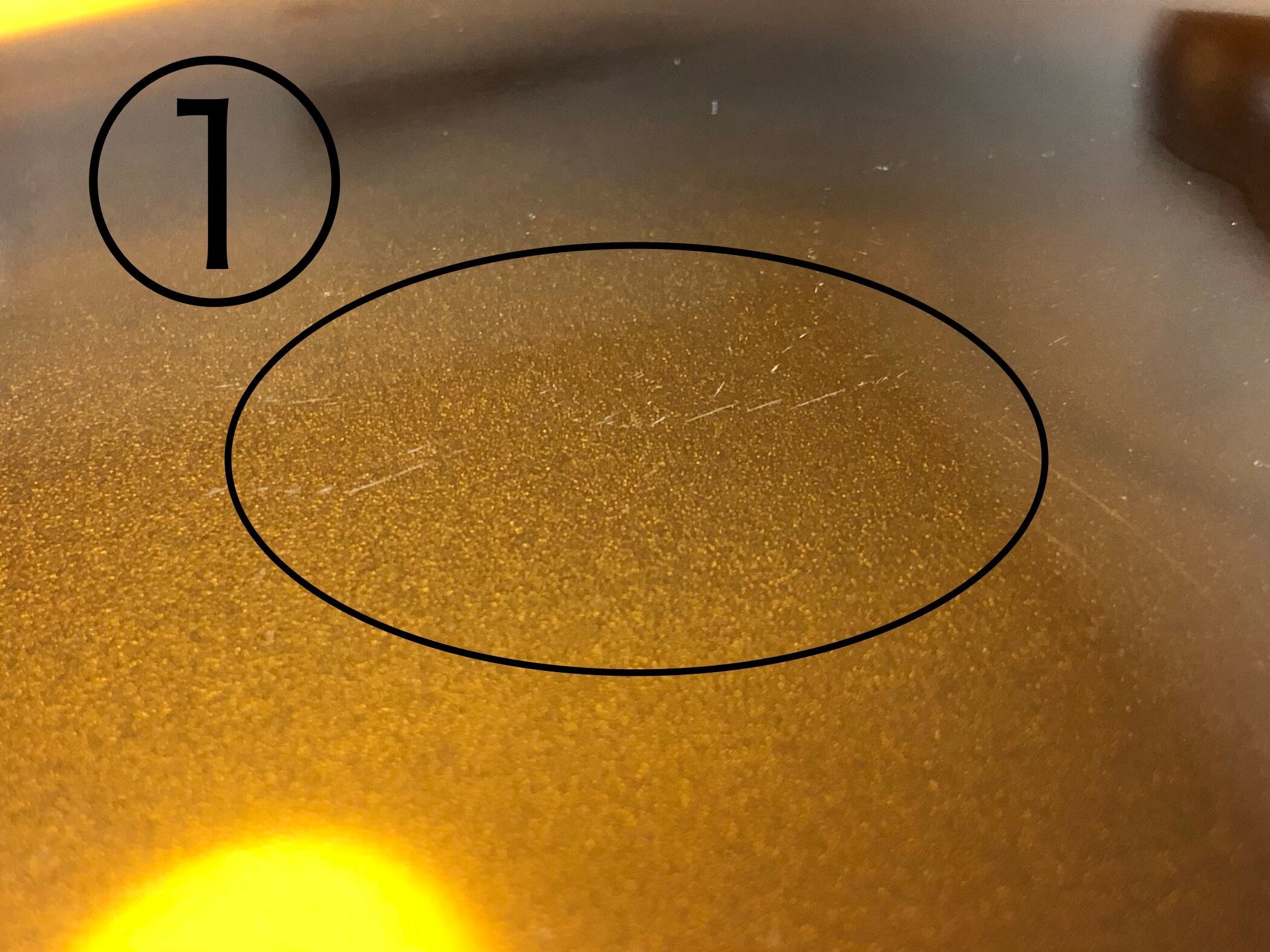 プレートの表面に浅いスクラッチが数か所みられます。光にかざすとわかる程度の物が殆どで、それらはカトラリー傷という感じではなさそうなので、保管で付いてしまったもののように思います。