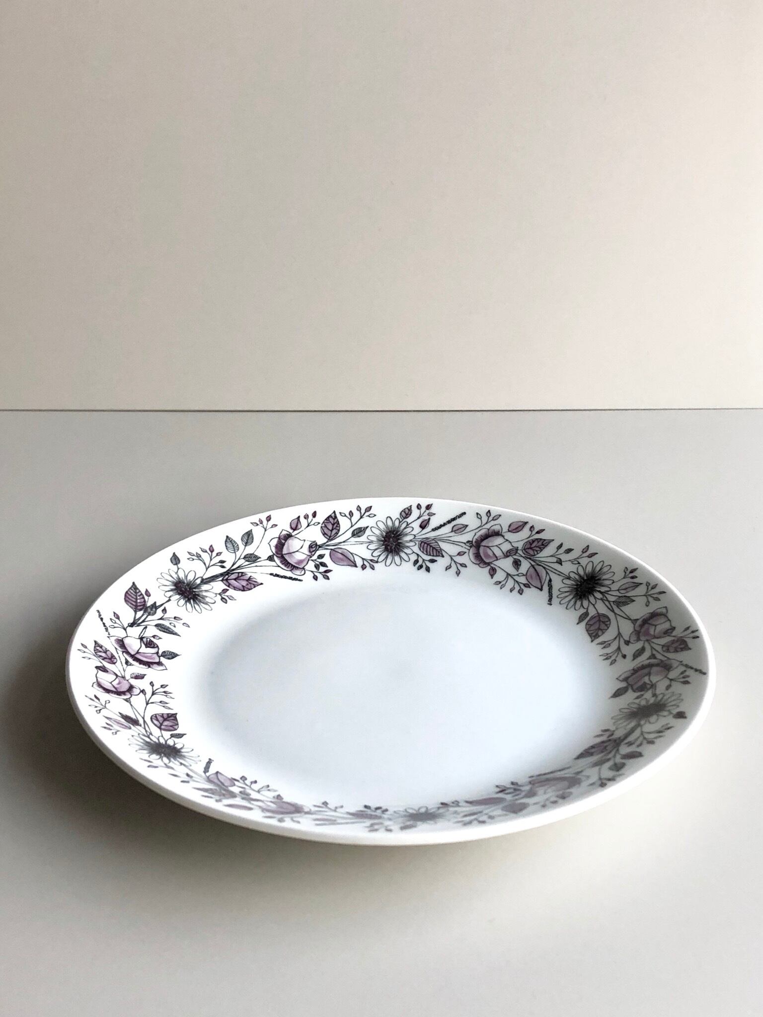 白地にモノトーンでバラやデイジーの華奢なアウトラインプリントが描かれ、その上に上品なパープルの濃淡を手彩色で絵付けしたロマンティックな仕上がりです。