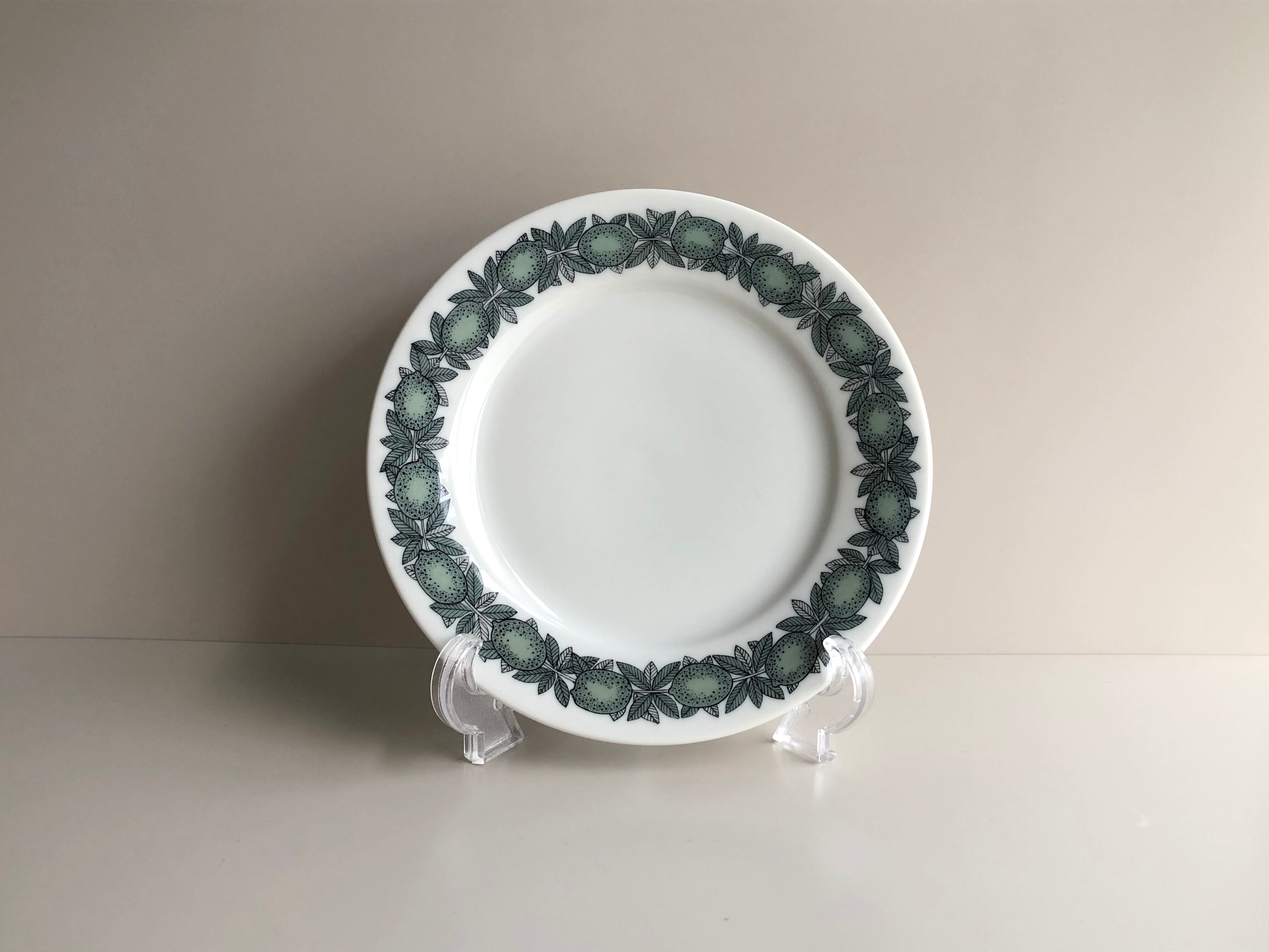 ぐるりとリース状に配置したレモンのような柑橘の図案に、モスグリーンの落ち着いた色味一色で色付けられたデザインは、一見クラシカルなようでとてもモダンな仕上がりです。