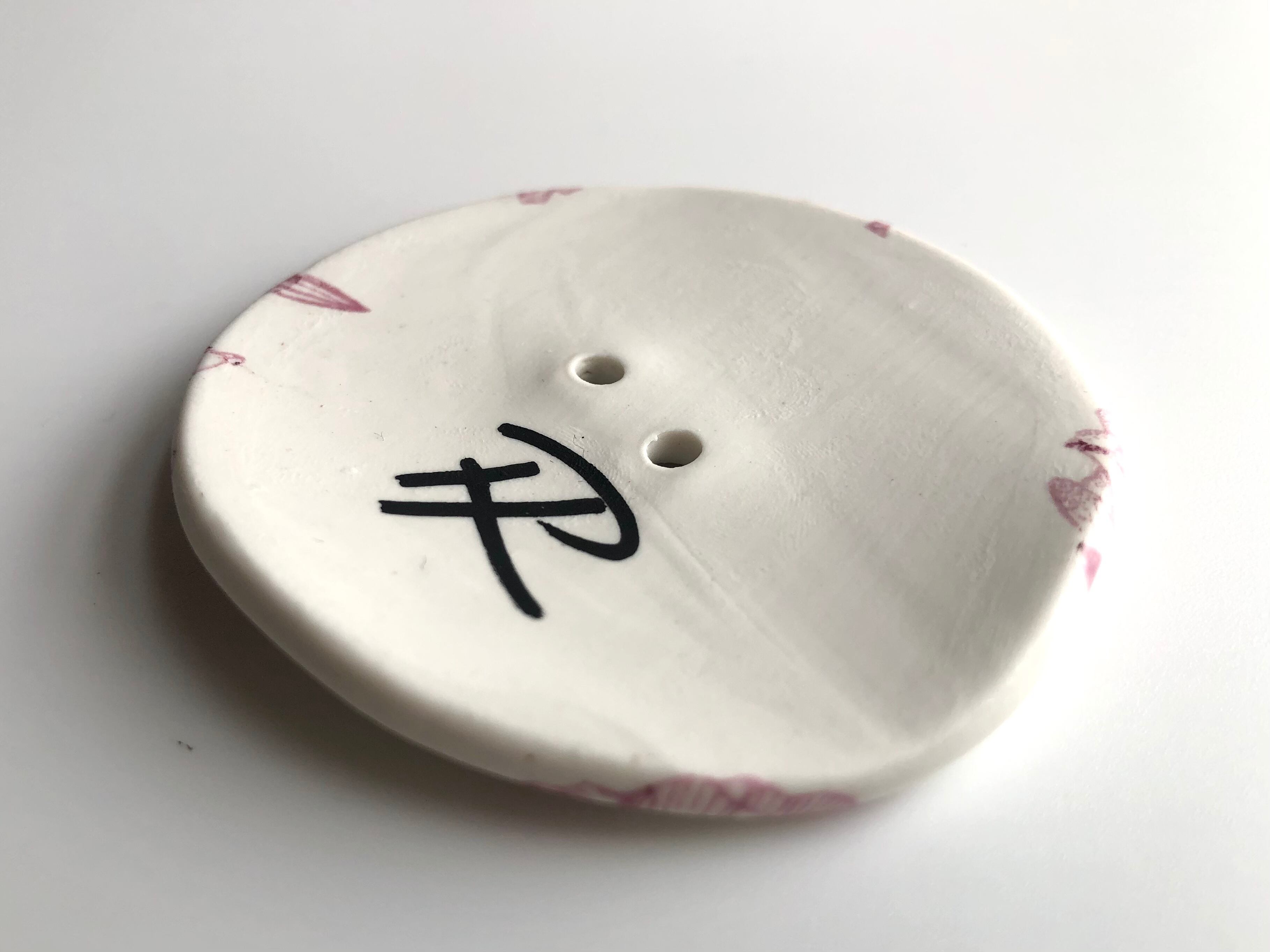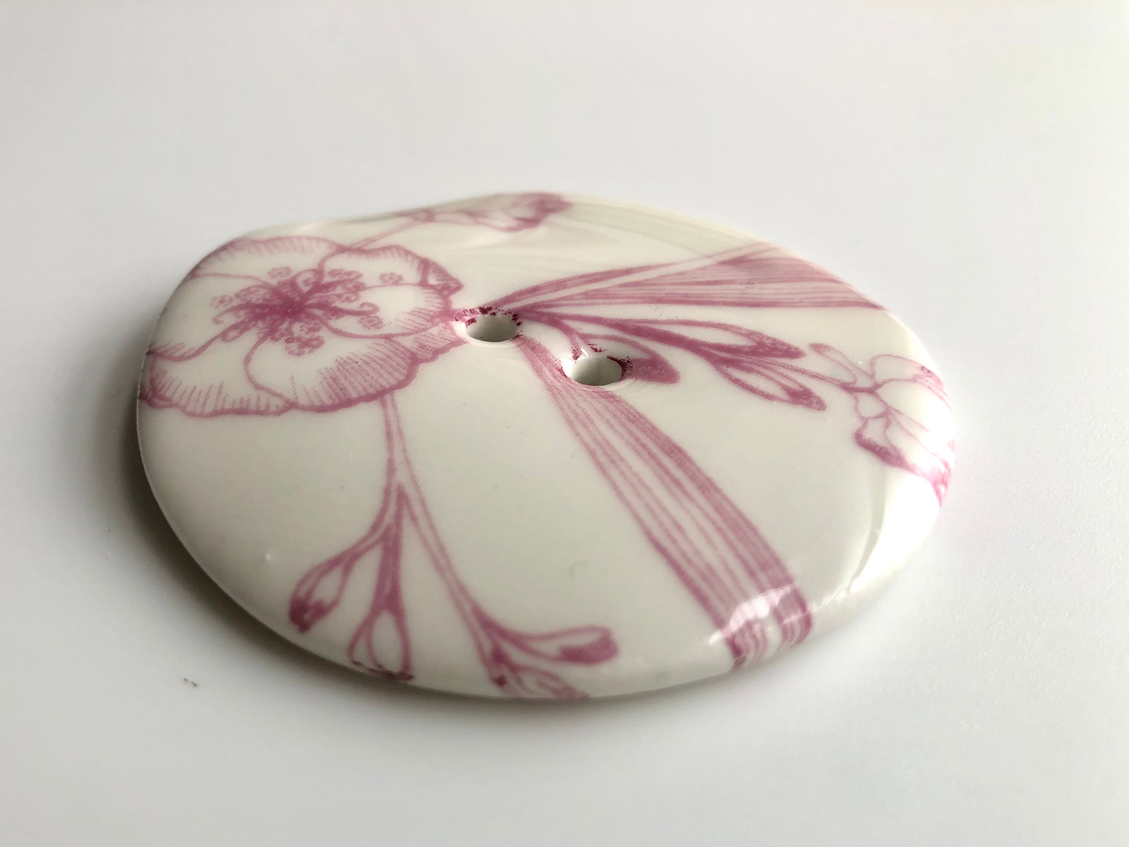 陶器製の大きなボタンに、ヘイニらしい個性的なデザインが施されているオリジナリティにあふれたアイテムです。