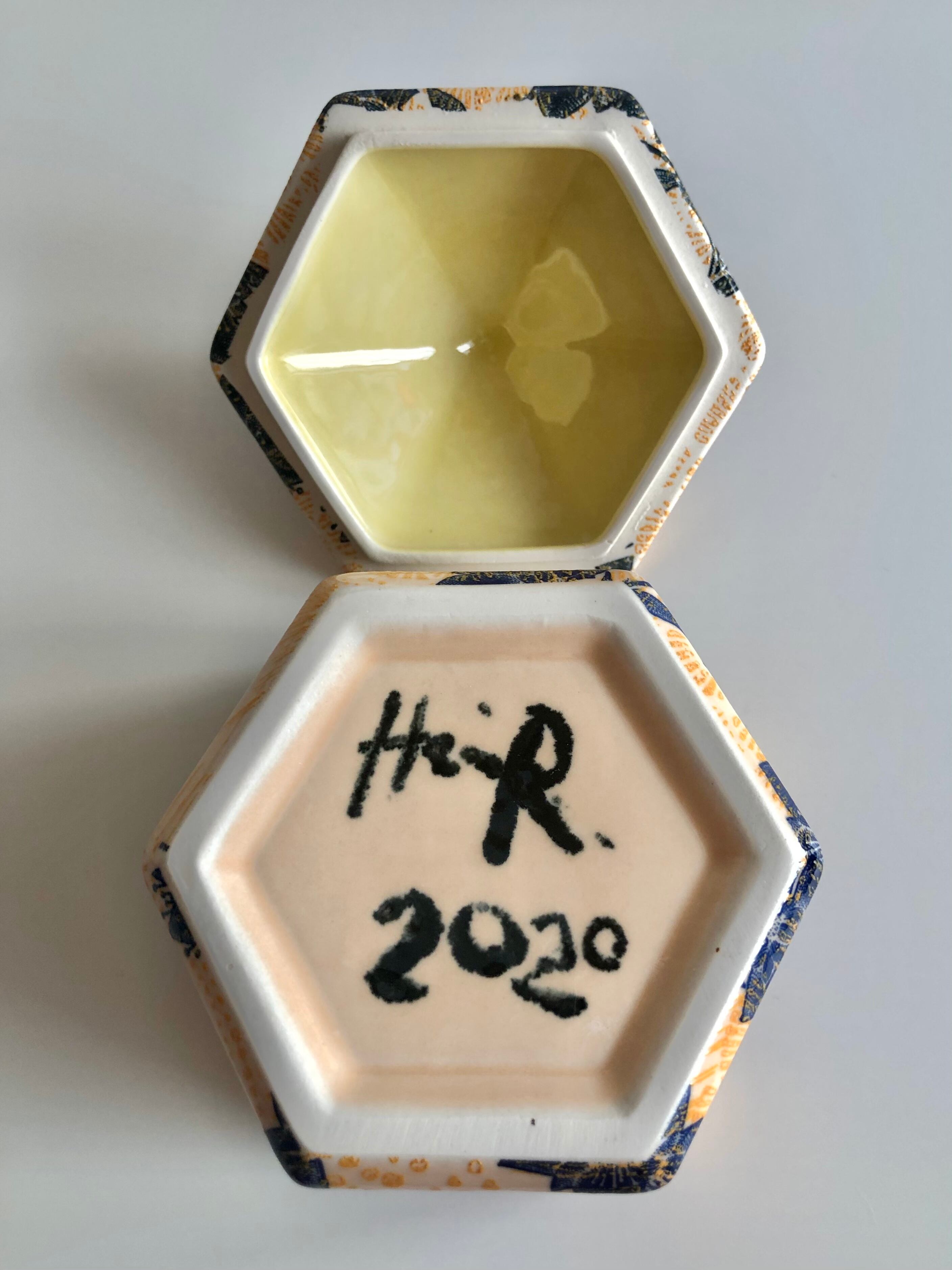 アラビアの人気デザイン、RunoやHuvilaのデザイナー、Heini Riitahuhta / ヘイニ・リータフフタ のハンドメイドによる、一点物のアート作品 『Hexagon /ヘキサゴン』のジャー(蓋物)です。