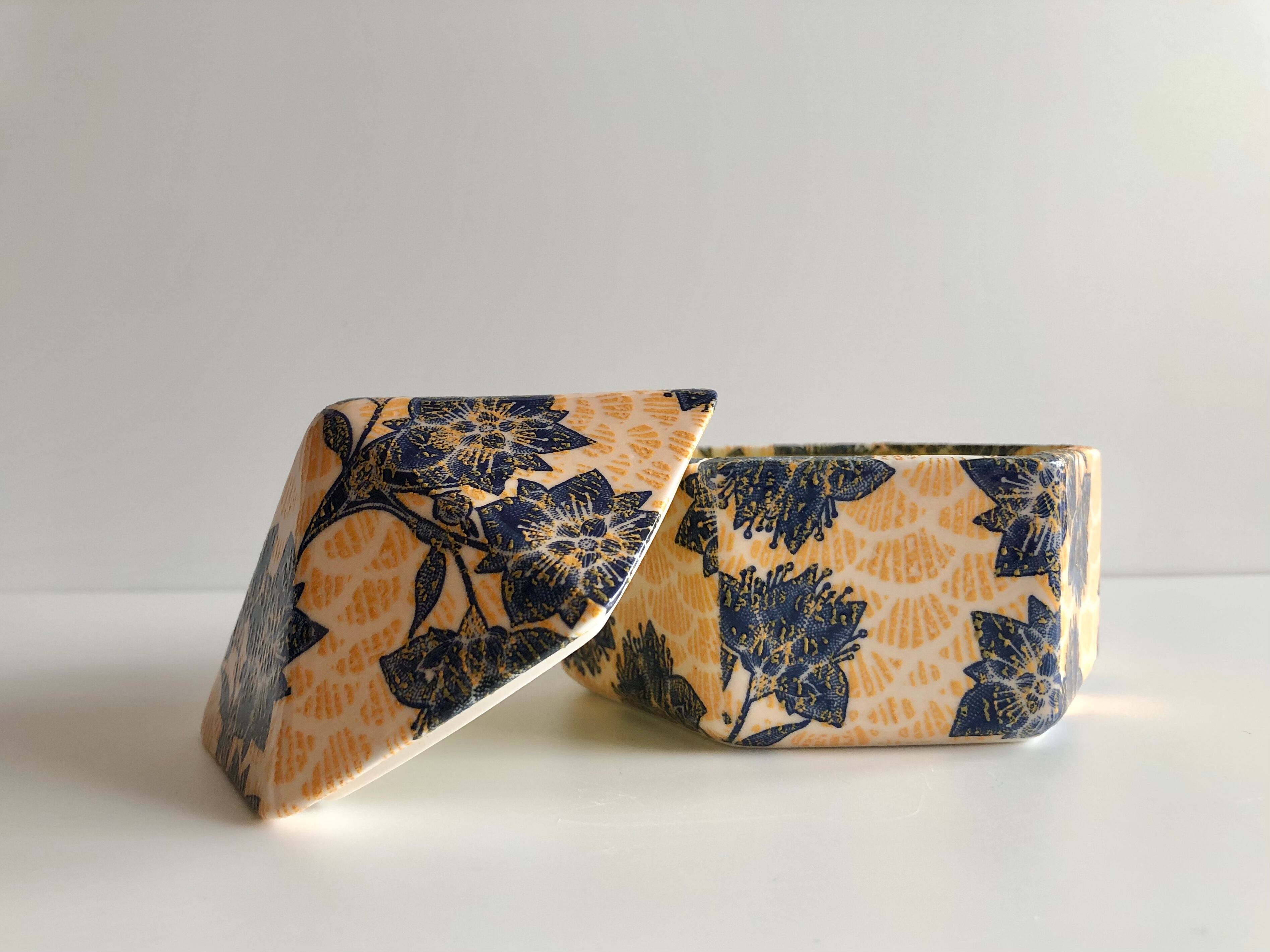 【Heini Riitahuhta】ヘイニ・リータフフタ Hexagon jar/ヘキサゴン ジャー(蓋物) サーモンピンク/ネイビーの花模様・アラビア Arabia Art Department