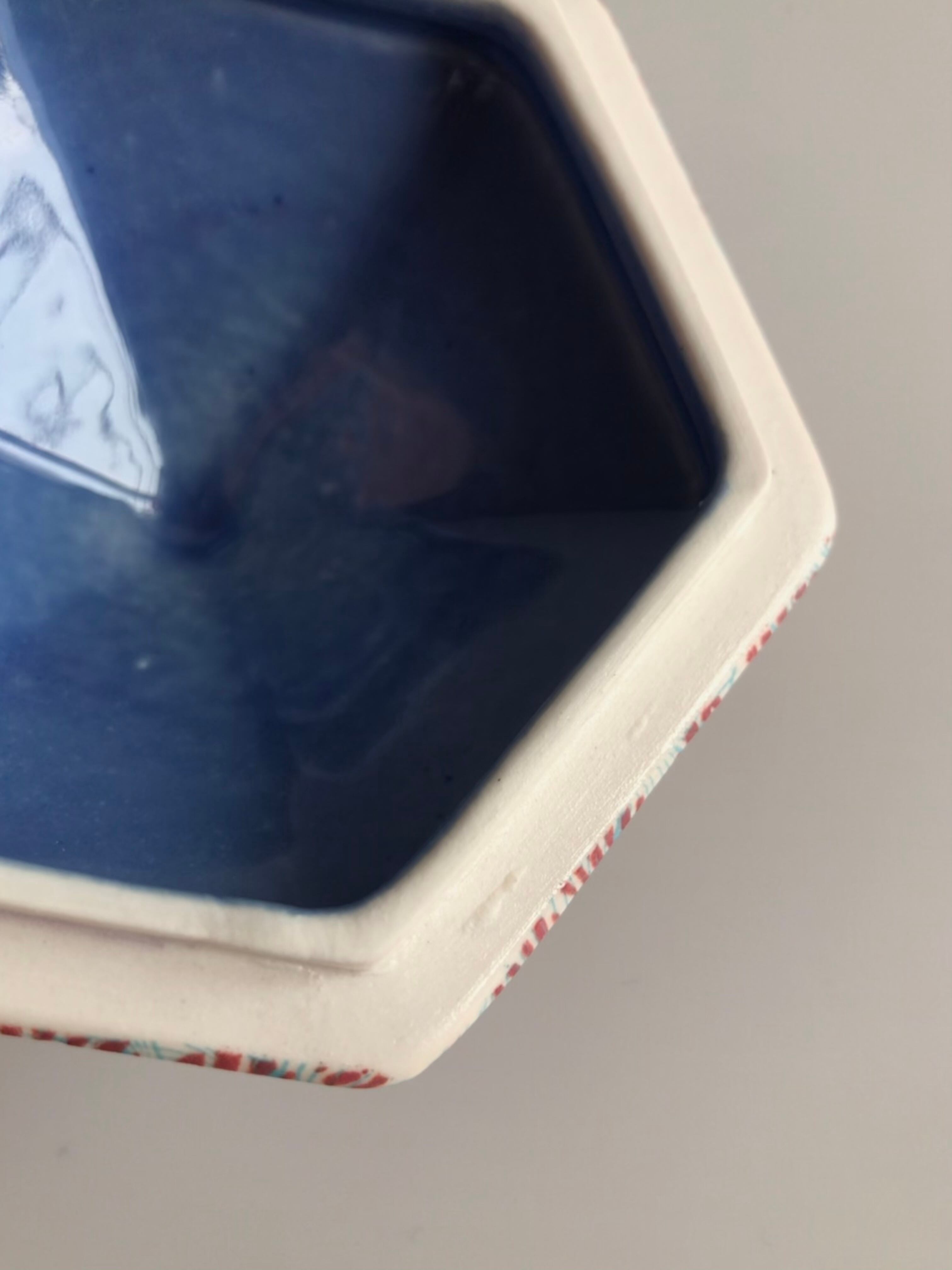 こちらは白地にライトブルーでうねった波のような模様、その上に朱赤の洋館屋根のような模様が朱赤で施されたデザインです。内側にはネイビー、裏にはピンクの釉薬がそれぞれ掛けられています。