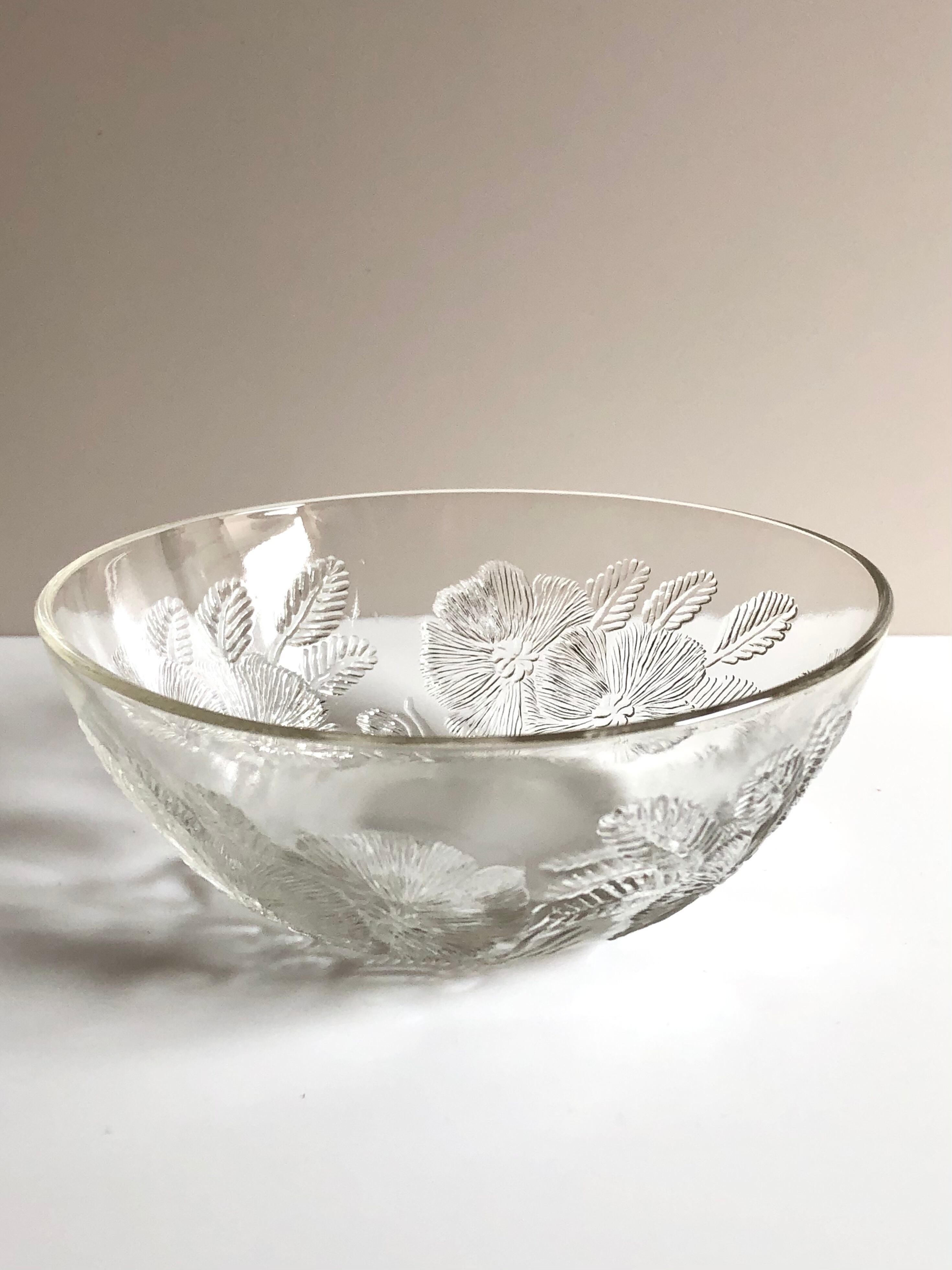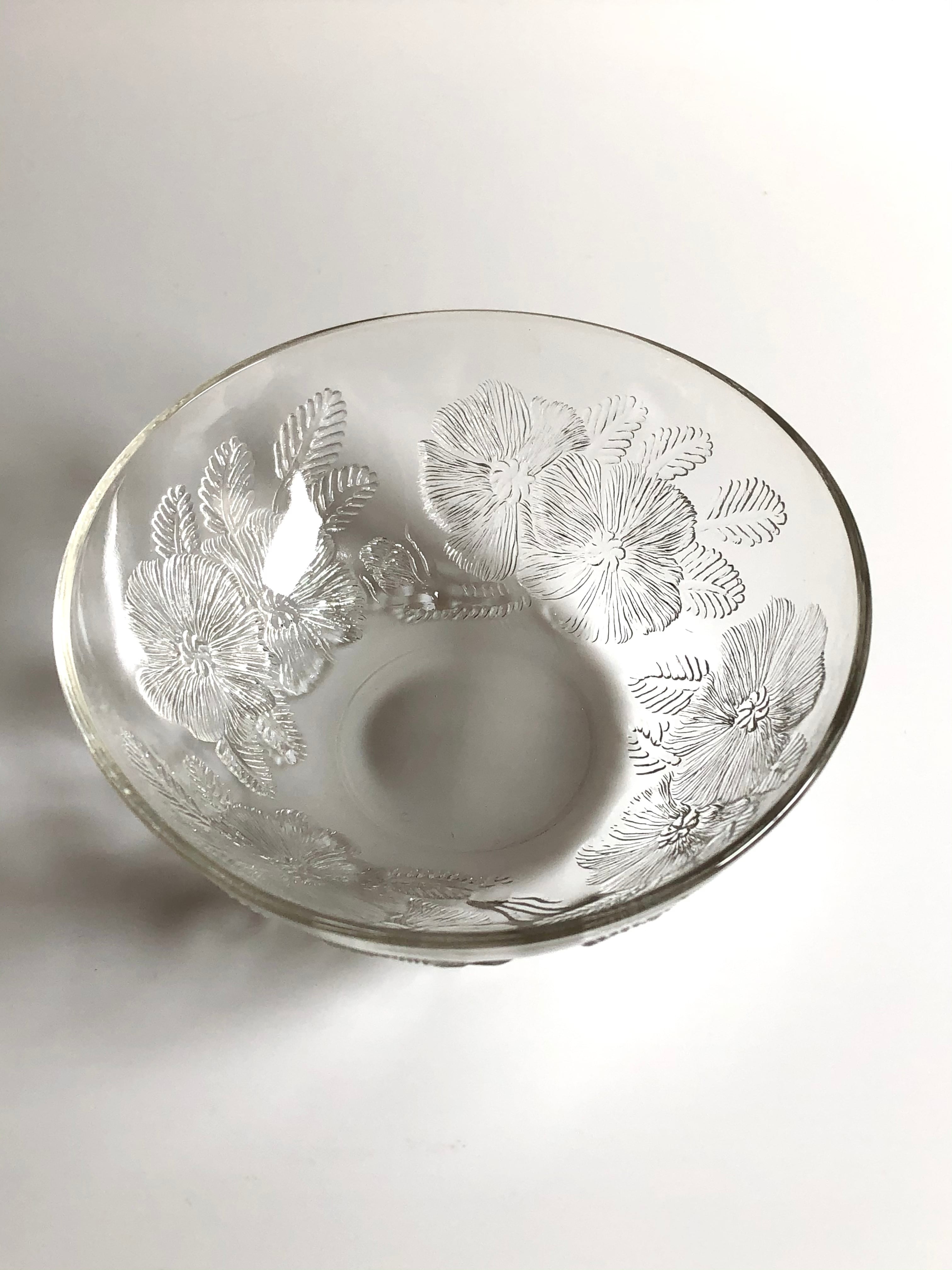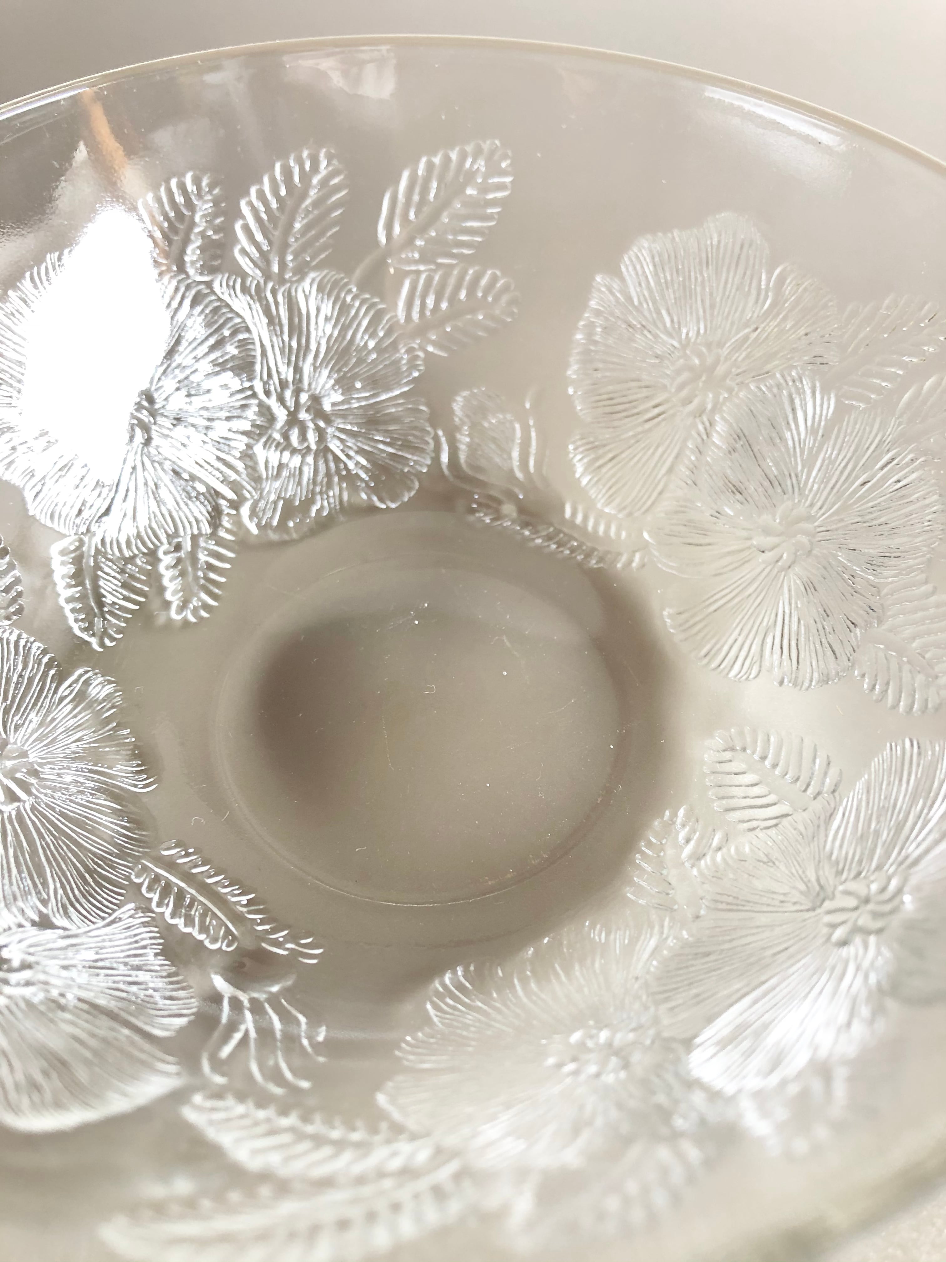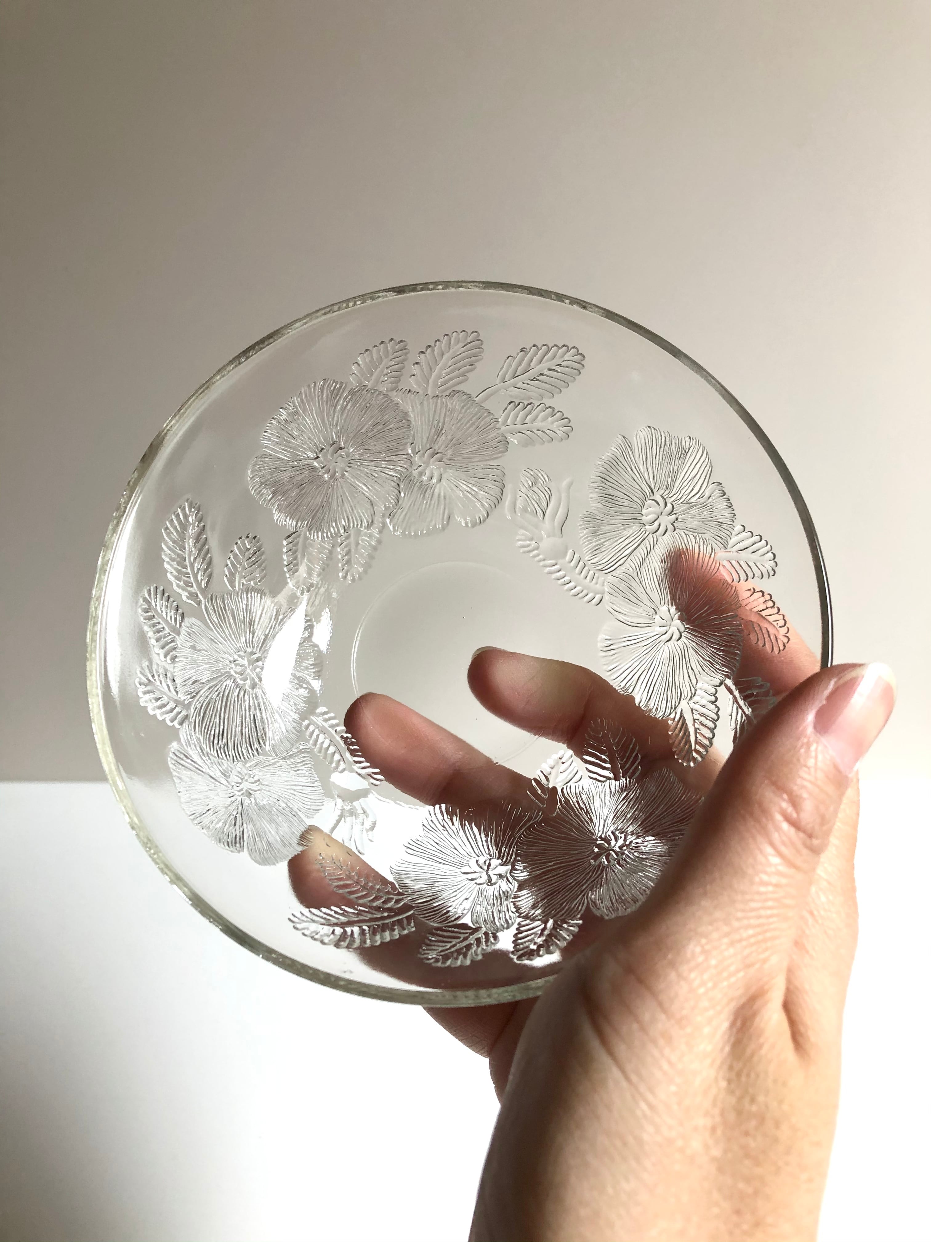 ピオニのボウルは厚めのガラスに一輪の大胆なシャクヤクを大きく配置していますが、対してロジータは丸いフォルムの薄手のガラスに野に咲くような可憐な花が円を描くように配置されています。
