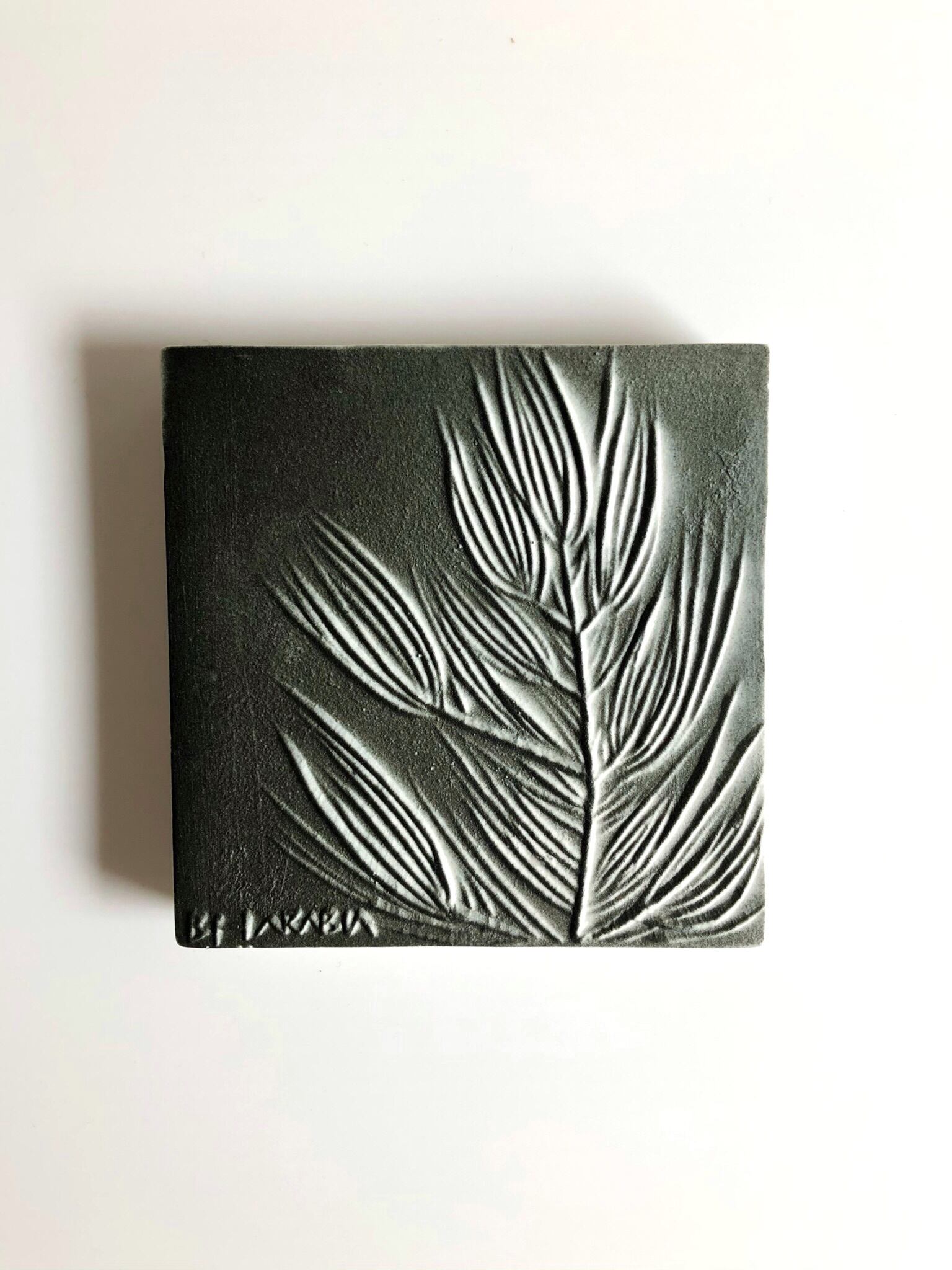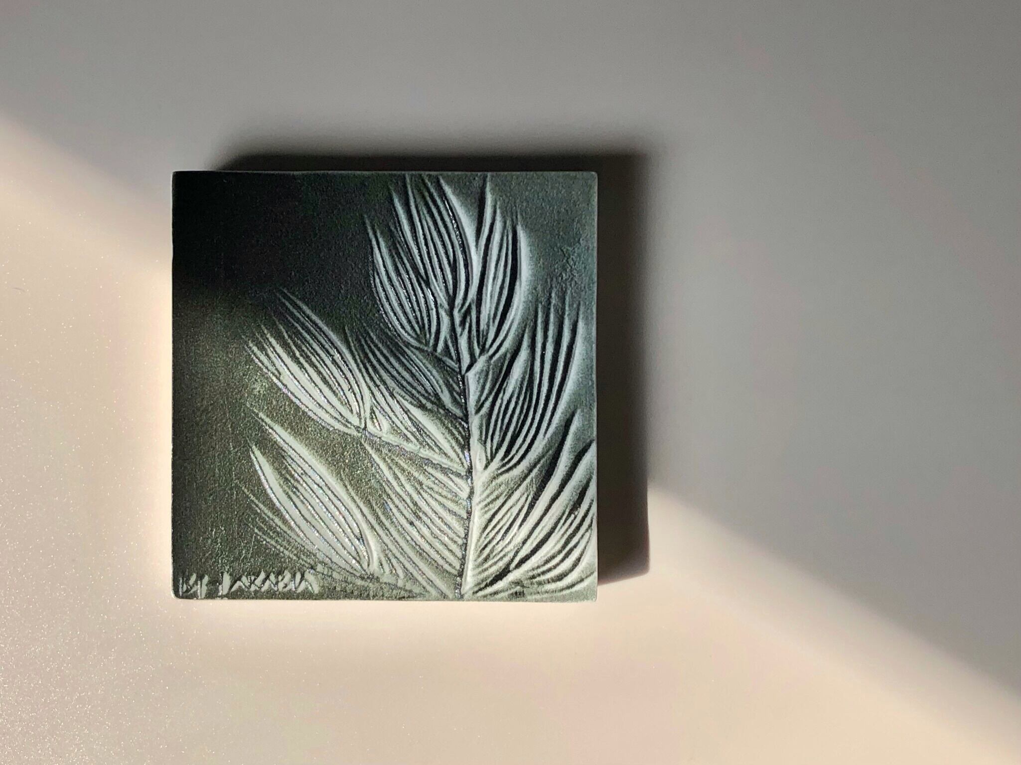 厚地の陶板に、Havunoksa(針葉樹の枝)がエンボスで表現されており、その上からモノトーンの釉薬がグラデーションで施され、作品にニュアンスを与えています。
