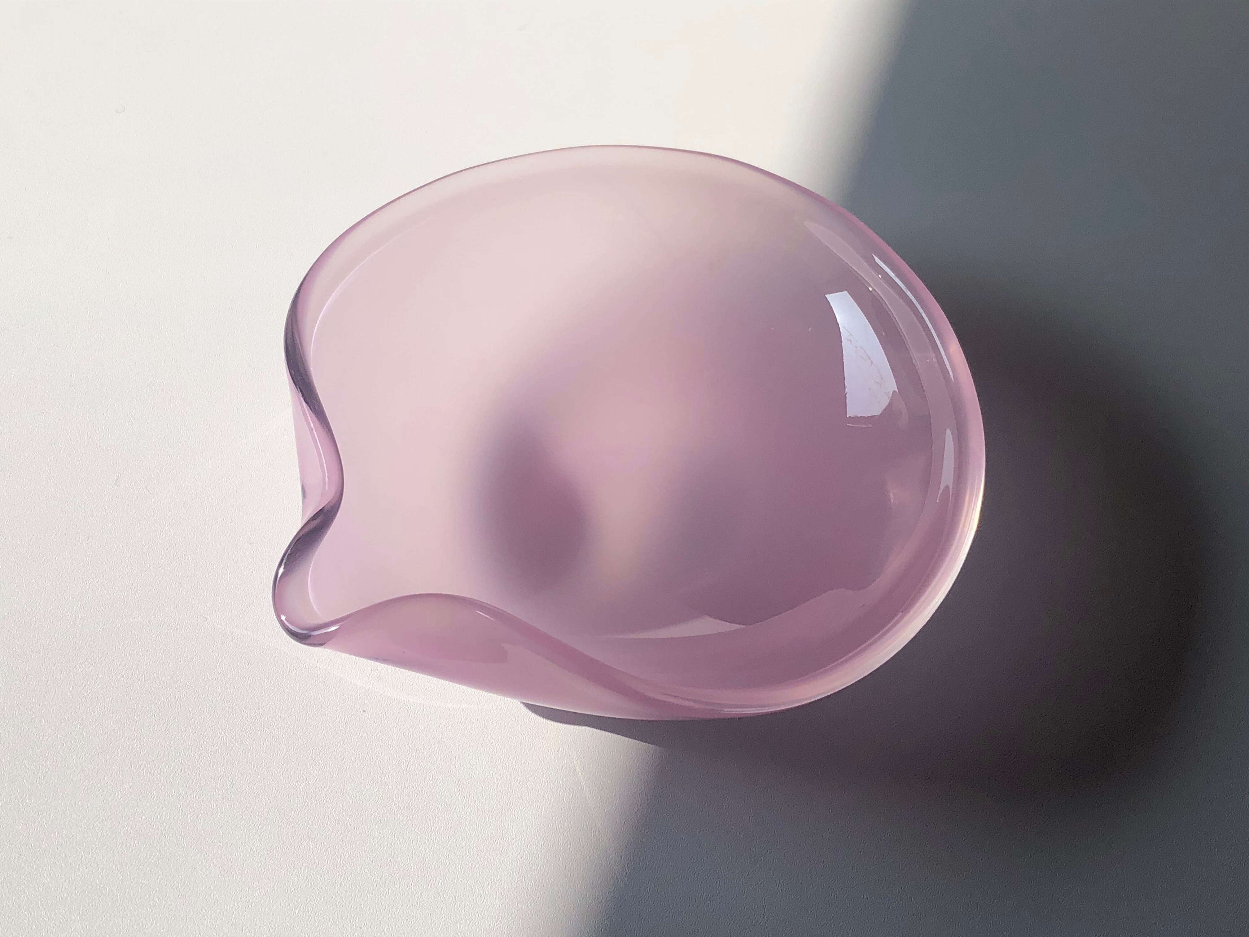 ピンクのガラスに、クリアガラスを被せる技法で表現された貝のオブジェは、とろりとしたテクスチャがなんとも幻想的で、見るものを夢の世界へ誘い込んでしまいそうな艶やかさがあります。