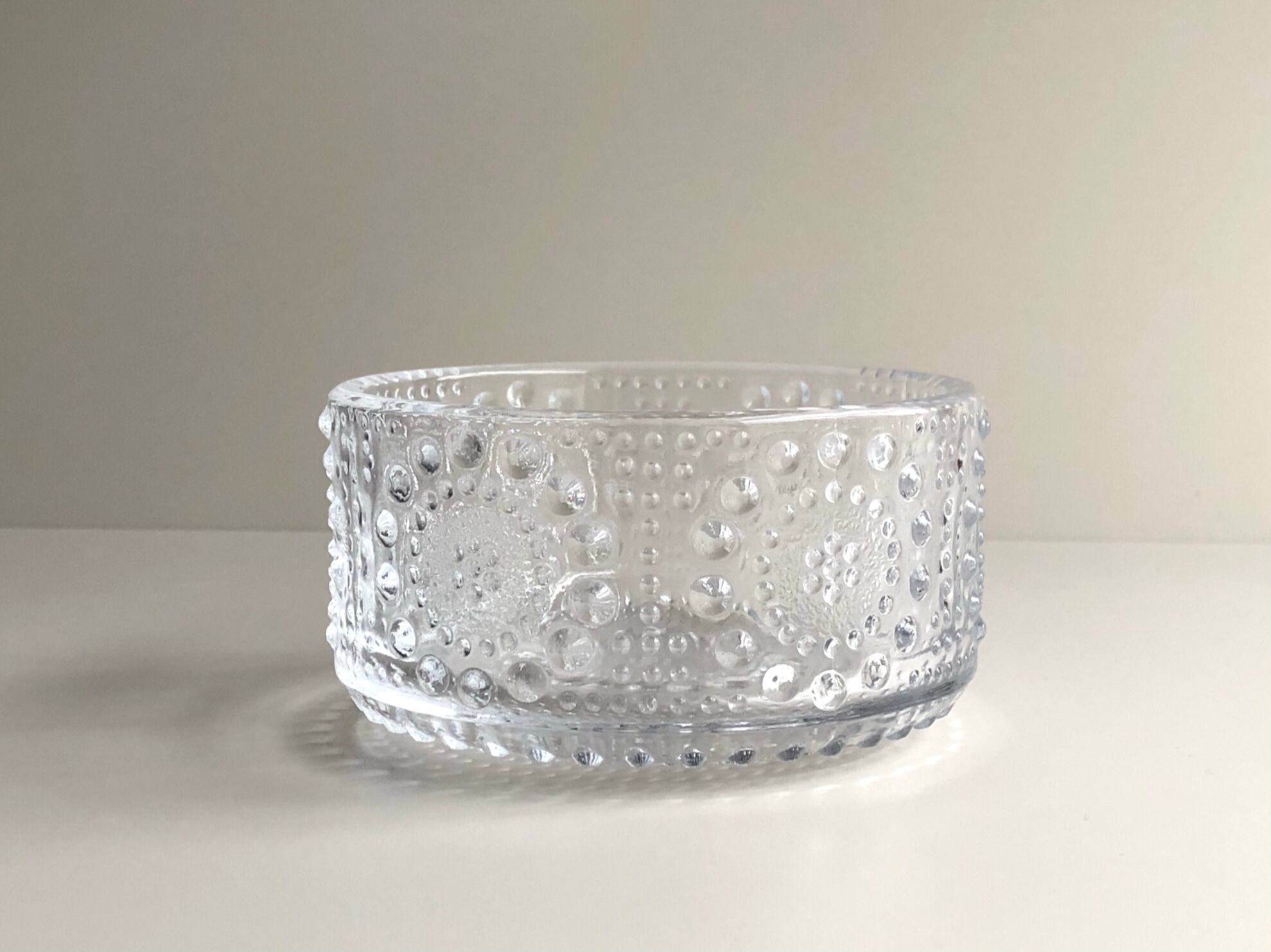粒で花を表したと言われる円状の配置はデコラティブで、シンプルなガラスデザインの多いイッタラやヌータヤルヴィのアイテムに比べると、装飾的できらびやかな印象です。