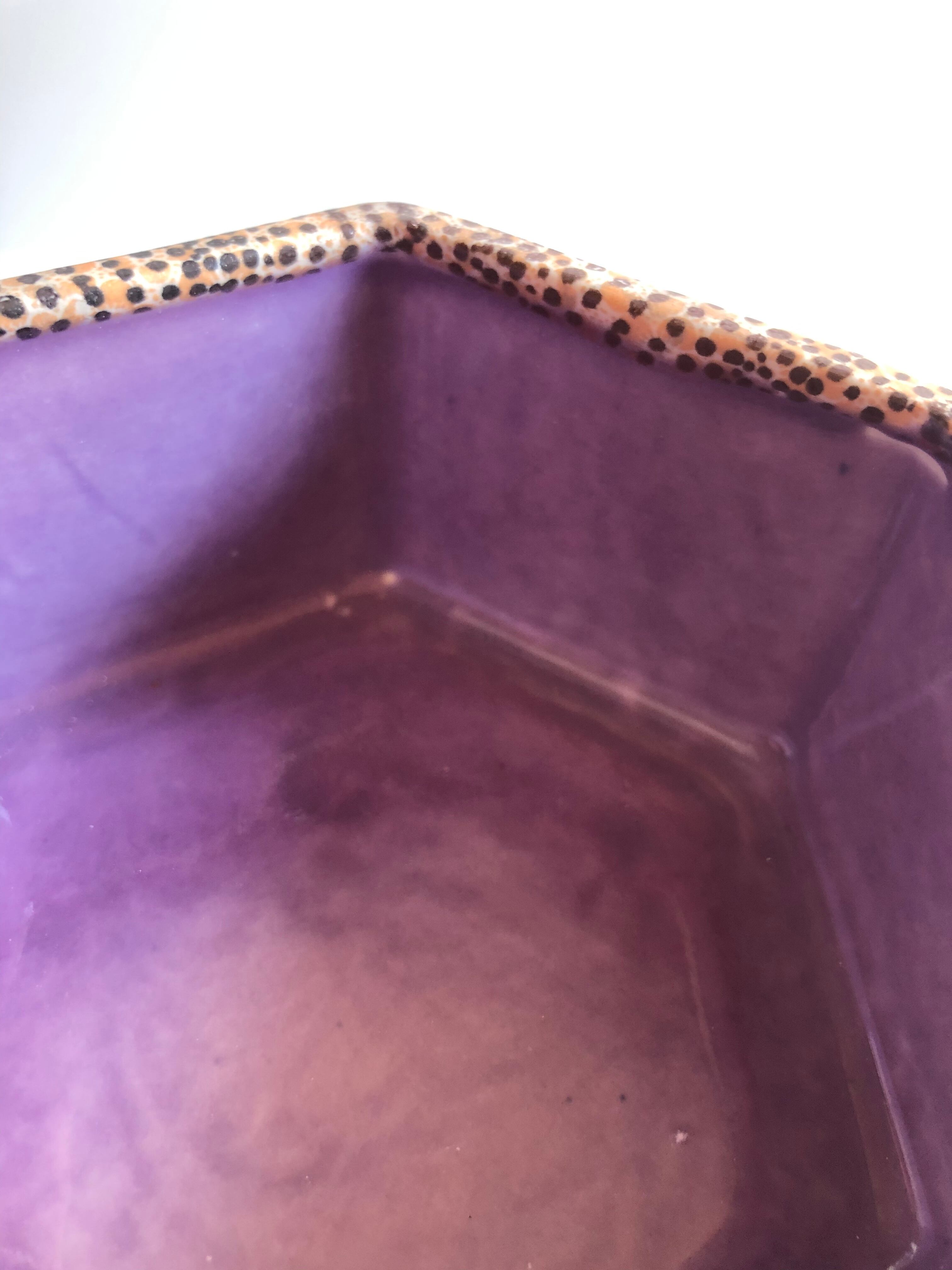 こちらは白地にピンクの桜の様な小花柄と、パープルのドットラインの二つのパターンが重ねられたデザインです。内側にはパープルの釉薬がかけられています。