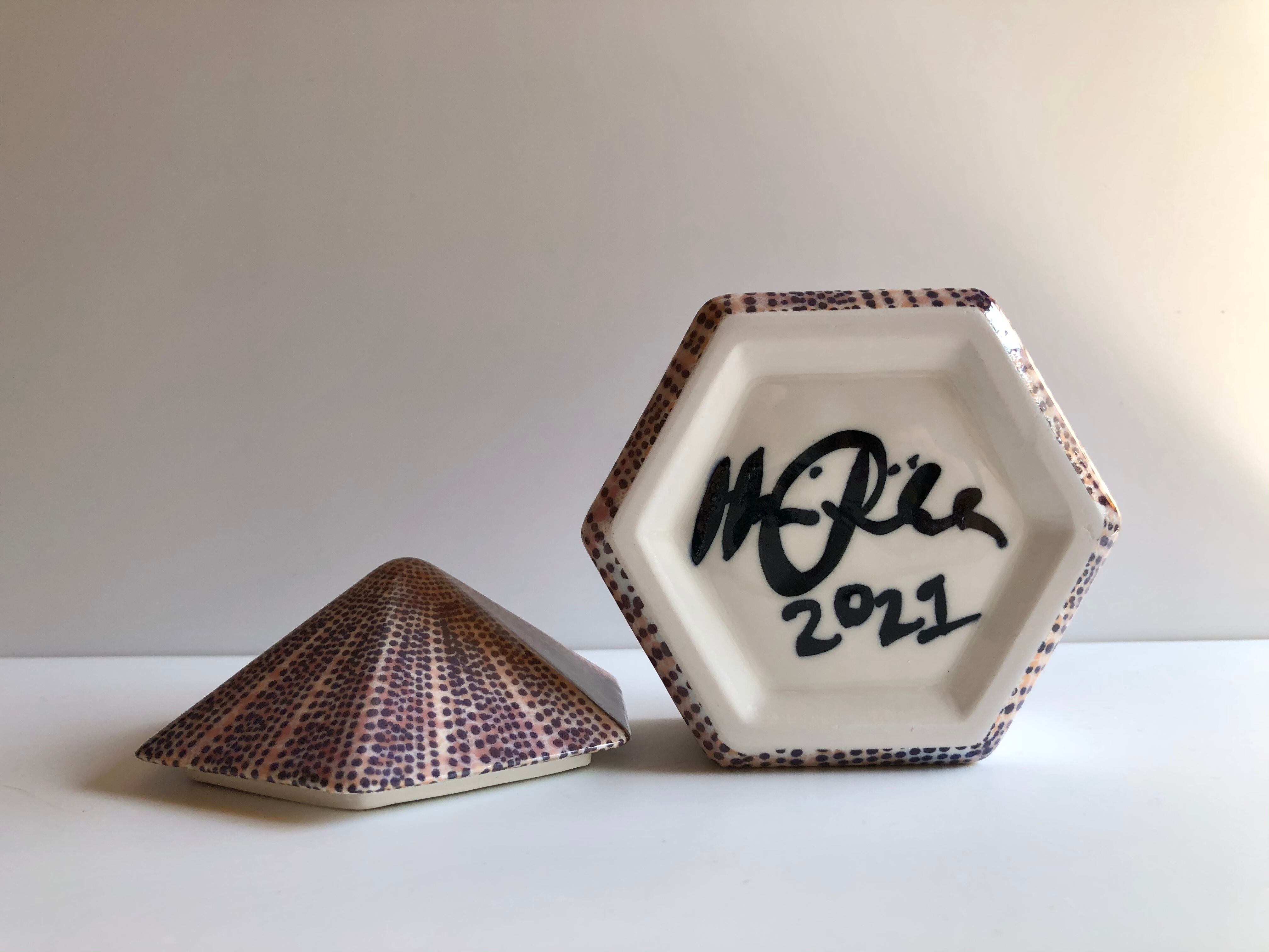 アラビアの人気デザイン、RunoやHuvilaのデザイナー、Heini Riitahuhta / ヘイニ・リータフフタ のハンドメイドによる、一点物のアート作品 『Hexagon /ヘキサゴン』のジャー(蓋物)です。
