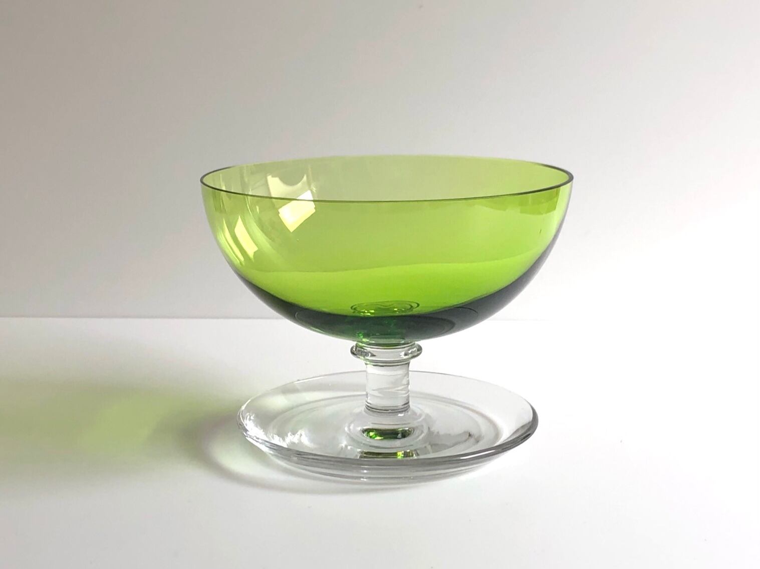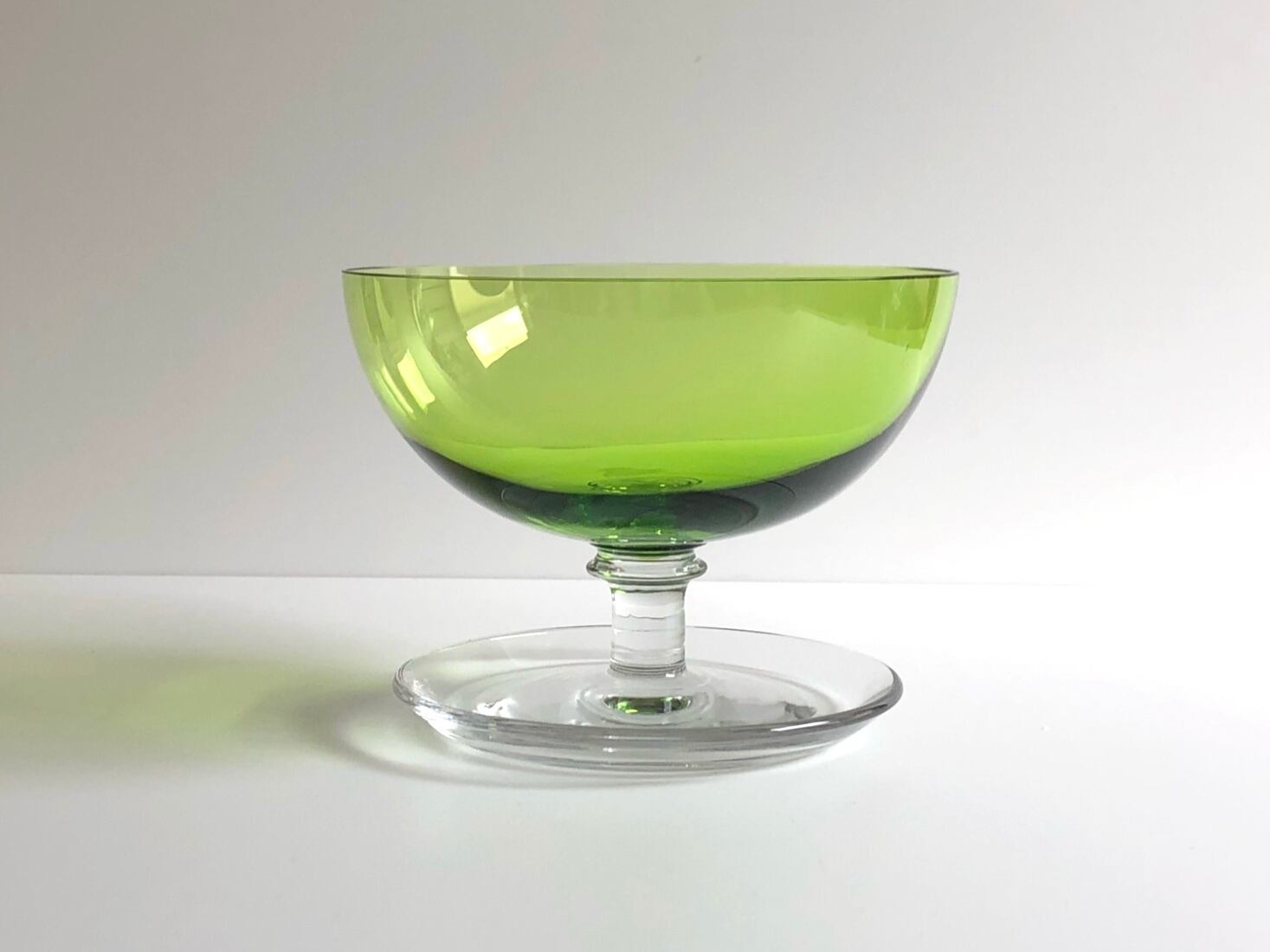 このボウルはステムとフットがクリアガラス、ボウル部が色ガラスのツートンカラーで構成されているもので、ブルーやパープル、グレー等いくつかの色違いも存在するのですが、今回ご紹介のお品は鮮やかな黄緑色をしています。この黄緑色の色ガラスはかなり珍しく、同シリーズの中でも特に希少性が高いと言えます。