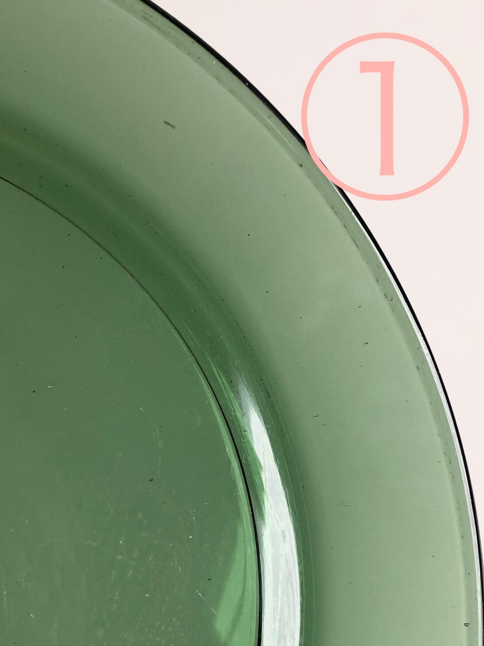 ユーズドかつシンプルで色の濃いガラス器なので、擦れやカトラリーでついた小傷が細かい物であっても目立ちます。またガラスの表面には製造時からの皺や揺らぎがあります。撫でると緩やかに波うっているのがわかります。