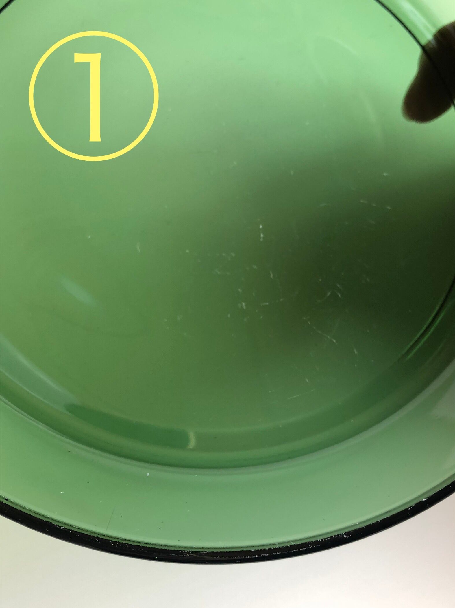 ユーズドかつシンプルで色の濃いガラス器なので、ちょっとした擦れやカトラリーでついた小傷が細かい物であっても目立ちます。また深くはありませんが、少し長めのカトラリースクラッチが見られます。
