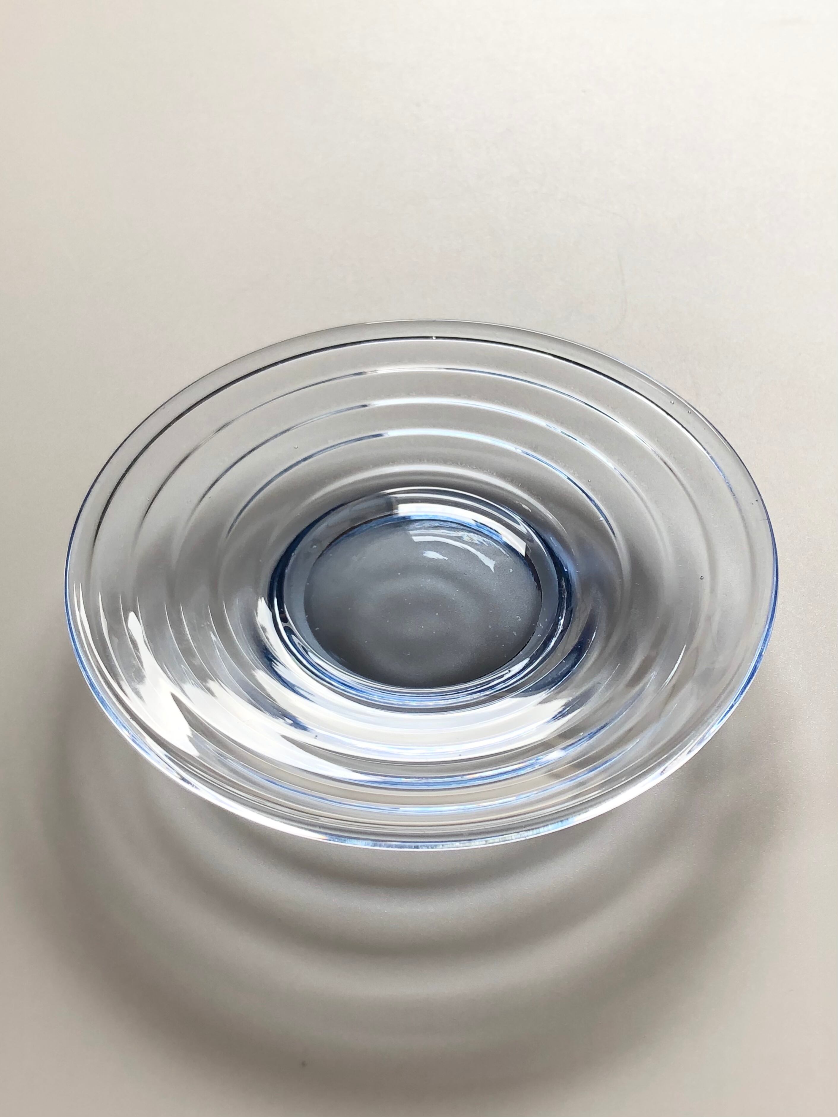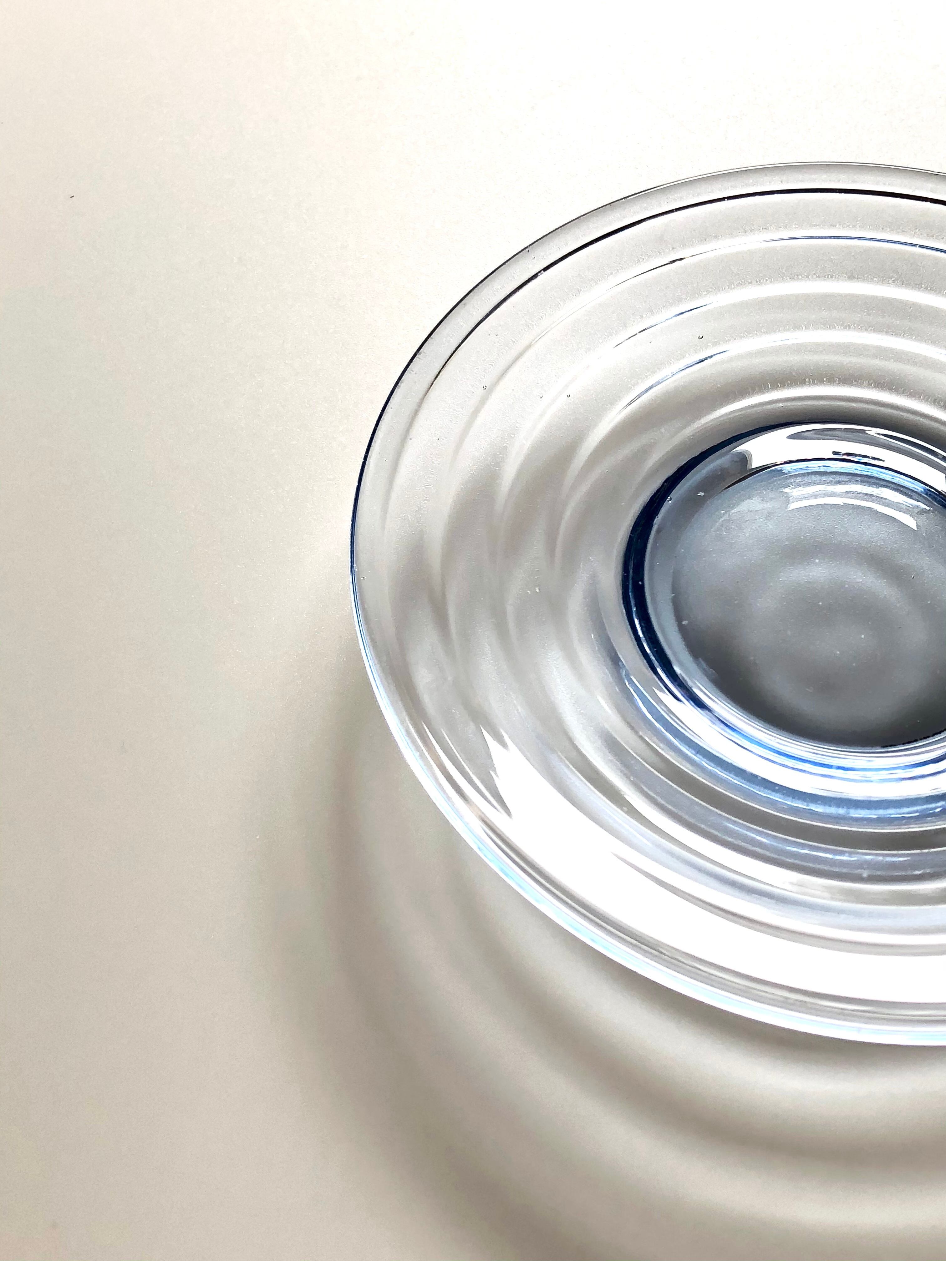 非常に薄いブルーの色ガラスが、プレスで表現された波紋の重なりで柔らかに深みを増します。その波紋の姿は幻想的な美しさです。