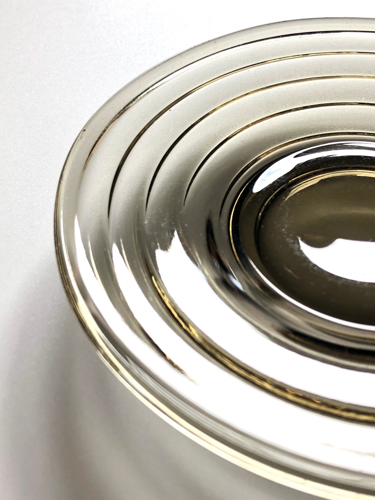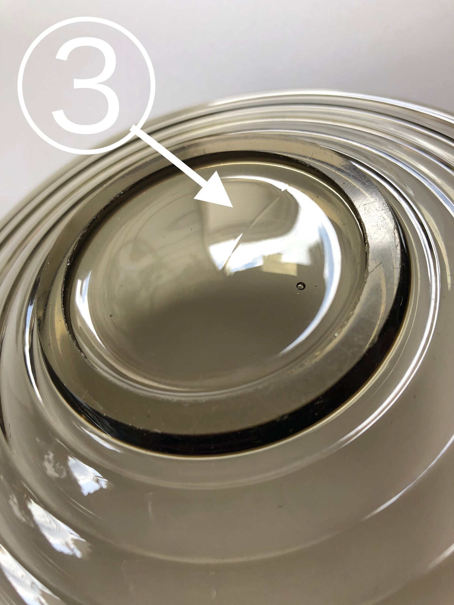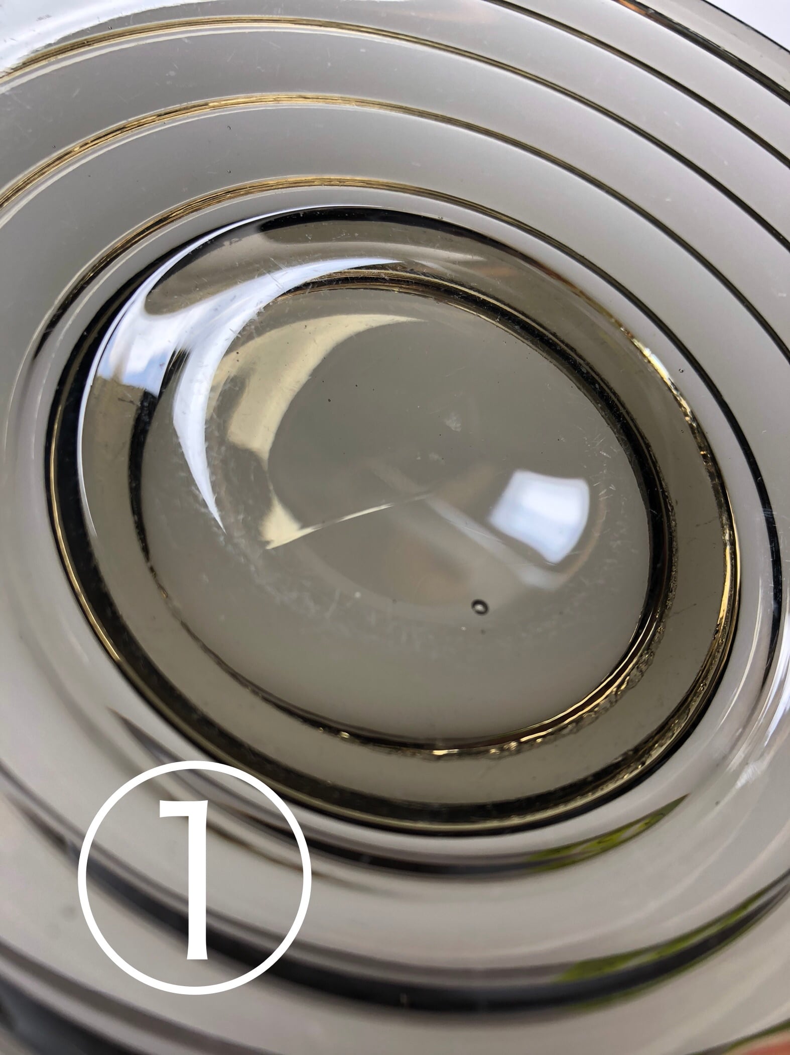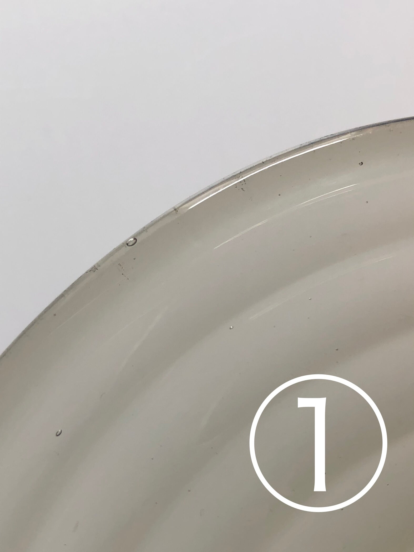 ガラスを削って高台の底を仕上げている為、このアイテムの殆どに高台の角に微細なチップがあります。高台の角を手でなぞると削れによるざらつきがあります。また、高台にはスクラッチもあります。
