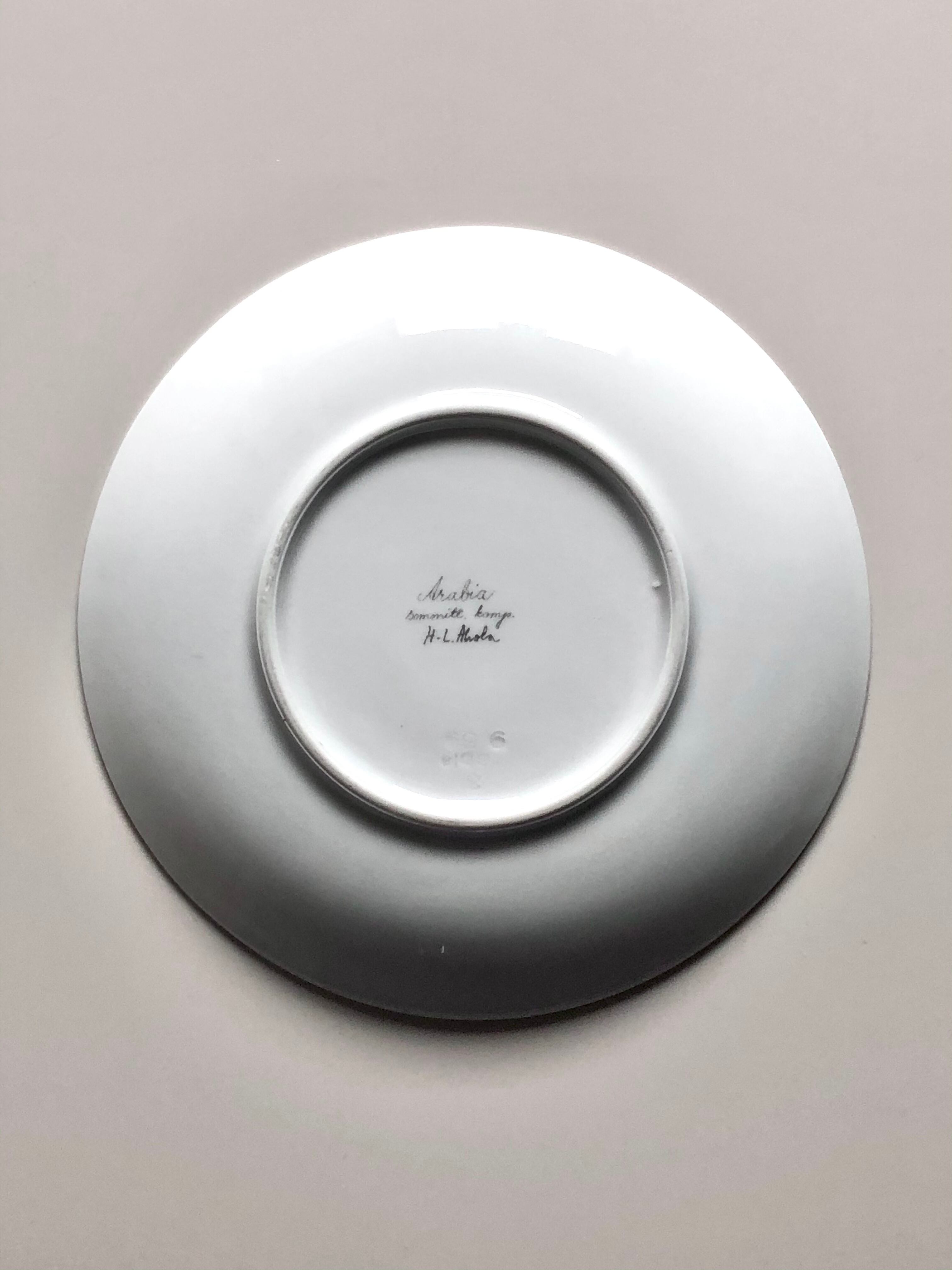 こちらのアイテムには、Arabia sommitt. kompと筆記体のバックスタンプがありますが、このスタンプによって、ARABIAのアート部門で製作された手仕事による品であることがわかります。