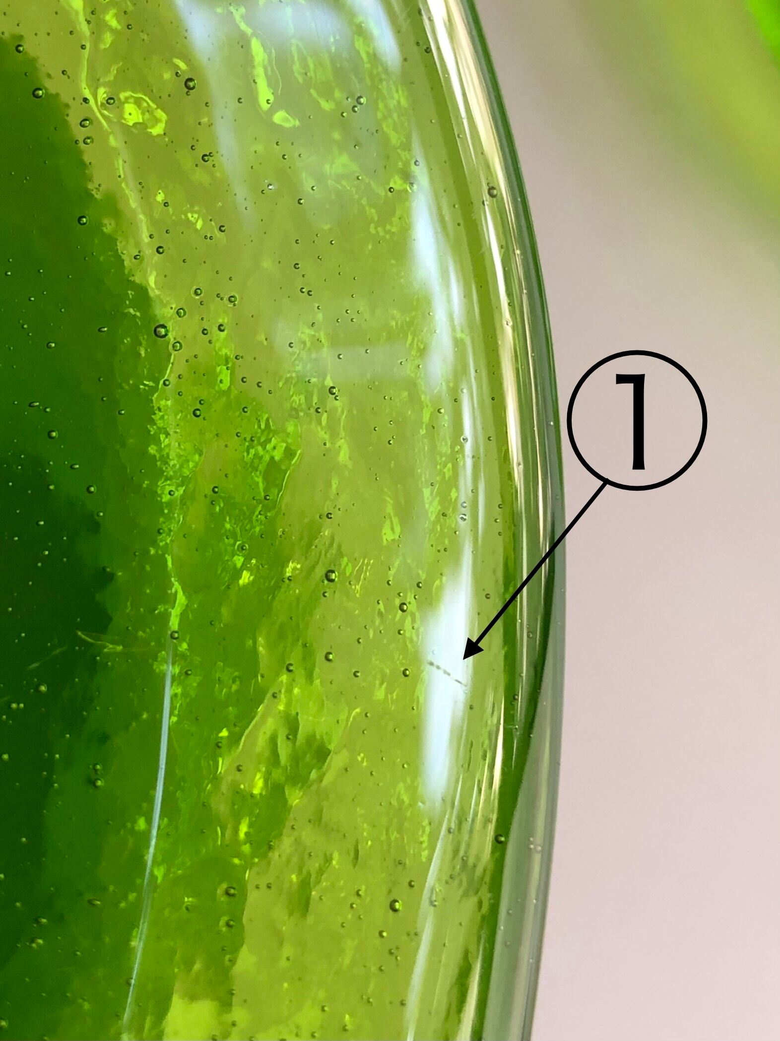 経年で付く微細な擦れ、製造時に出来るガラスのむら、ガラスの中に閉じ込められた気泡、色むら、小さな混入物がみられるお品です。