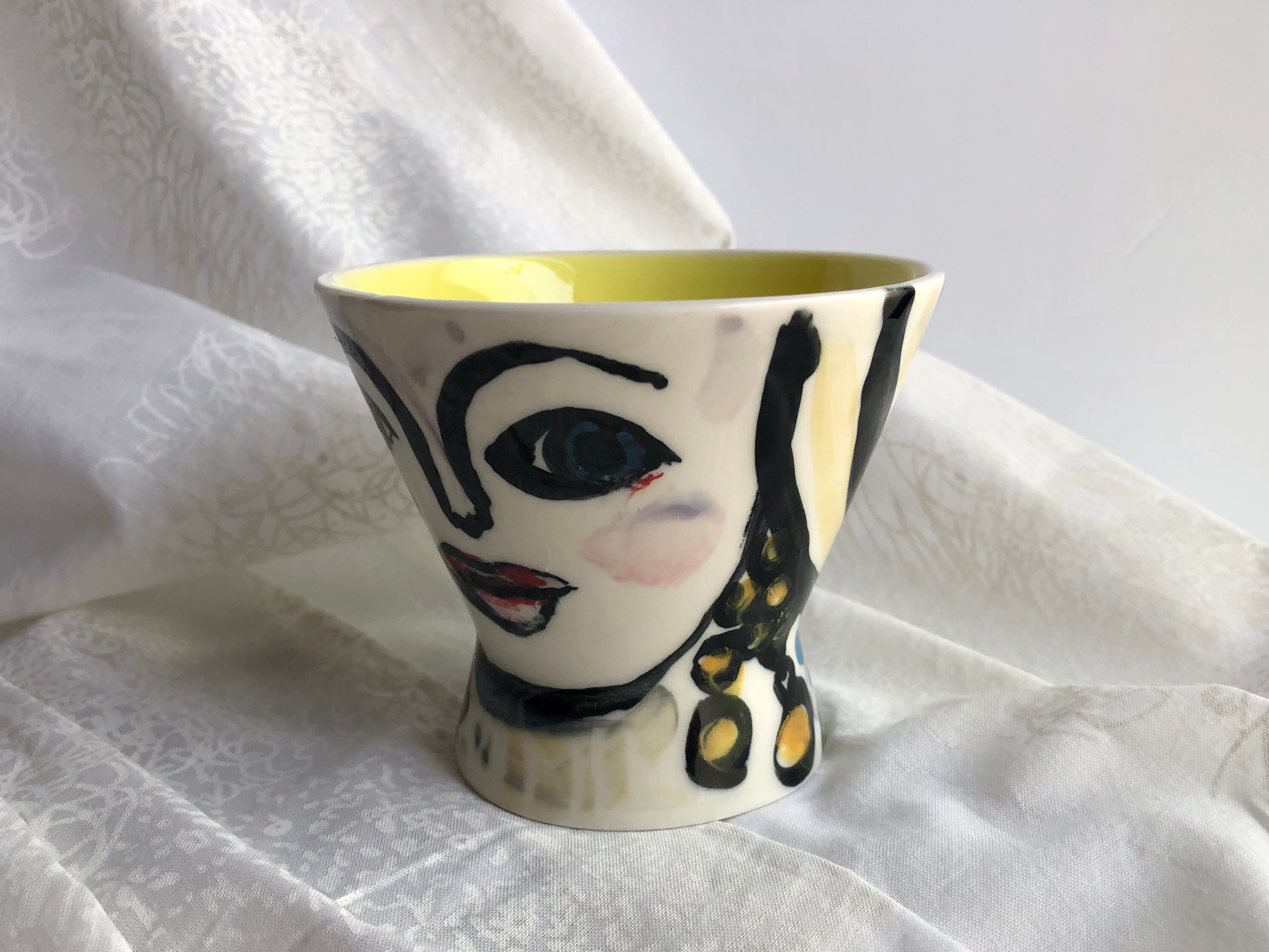 盃状のカップには一つ一つ、すべてヘイニリータフフタ本人の手色彩によって女の子の顔絵付けされています。