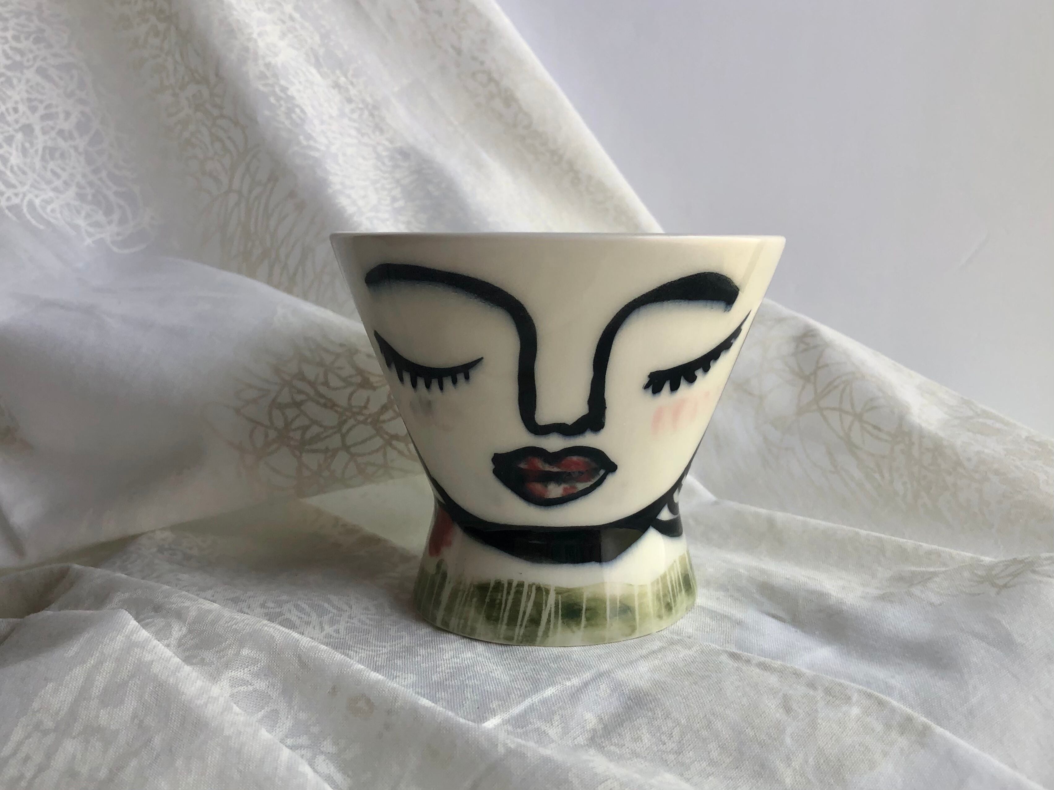 盃状のカップには一つ一つ、すべてヘイニリータフフタ本人の手色彩によって女の子の顔絵付けされています。
