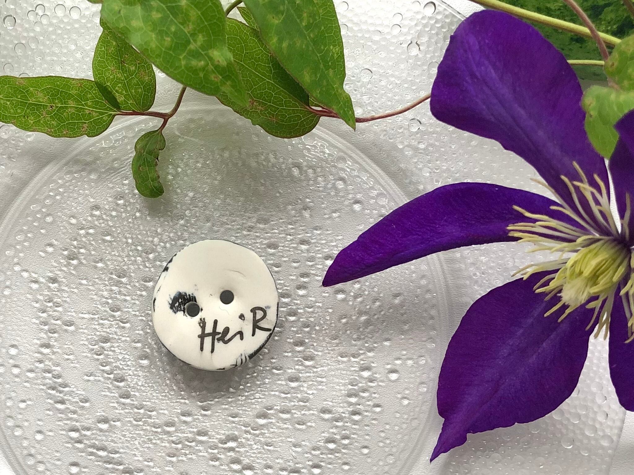 陶器製の大きなボタンに、ヘイニさんらしい個性的なデザインが施されているオリジナリティにあふれたアイテムです。