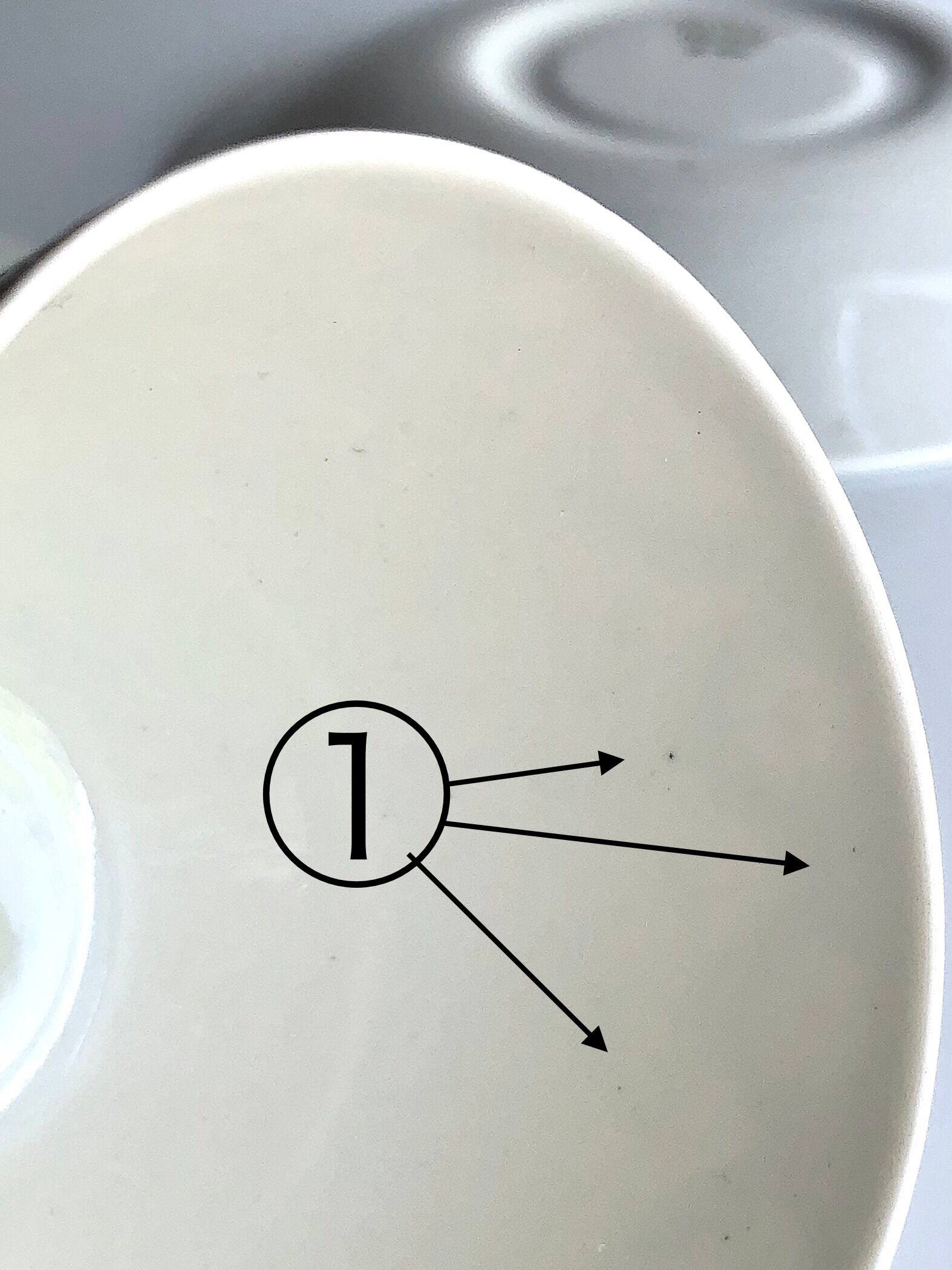 プレートやソーサーの裏側に支柱痕(焼き物がくっつかないように支える丸めた土「支柱」を外した痕)が1~3箇所あります