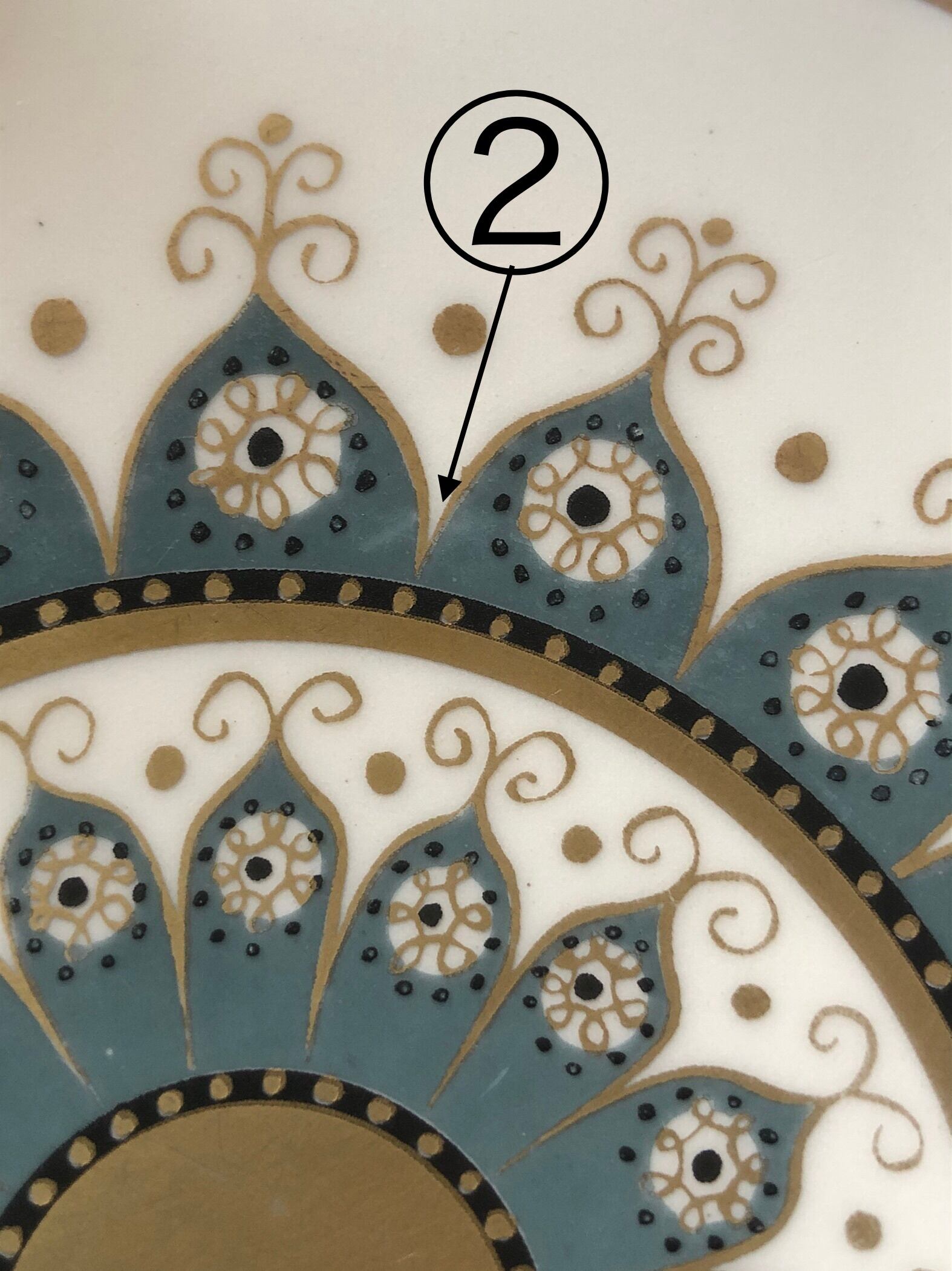 プレートやソーサーに微細な擦れがあります。また、ペイント上の擦れ、金彩上には黒い着色が見られます。