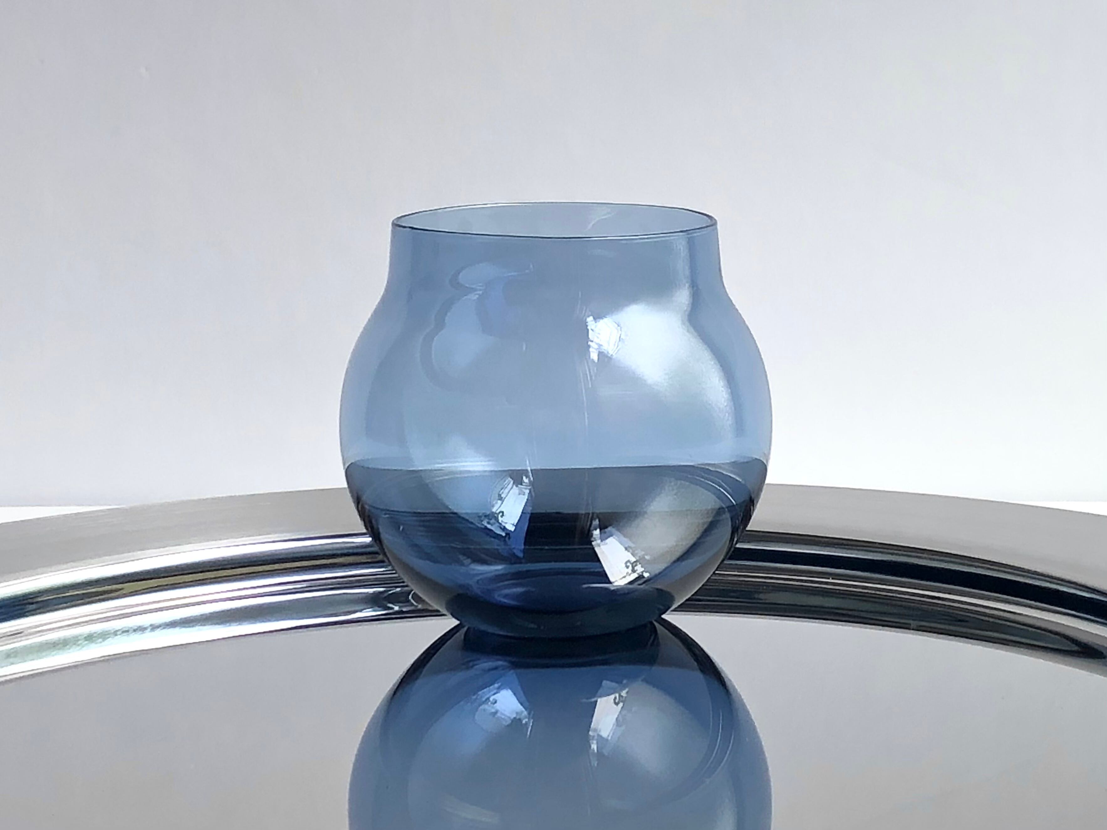 ”i-シリーズ” には、i-colorと呼ばれる独特な色合いの色ガラスが使用されているのですが、この美しいブルーも、その代表色の一つでした。マウスブローで製造されているので、薄作りなガラスの色合いや、その佇まいの繊細さが魅力の一つです。