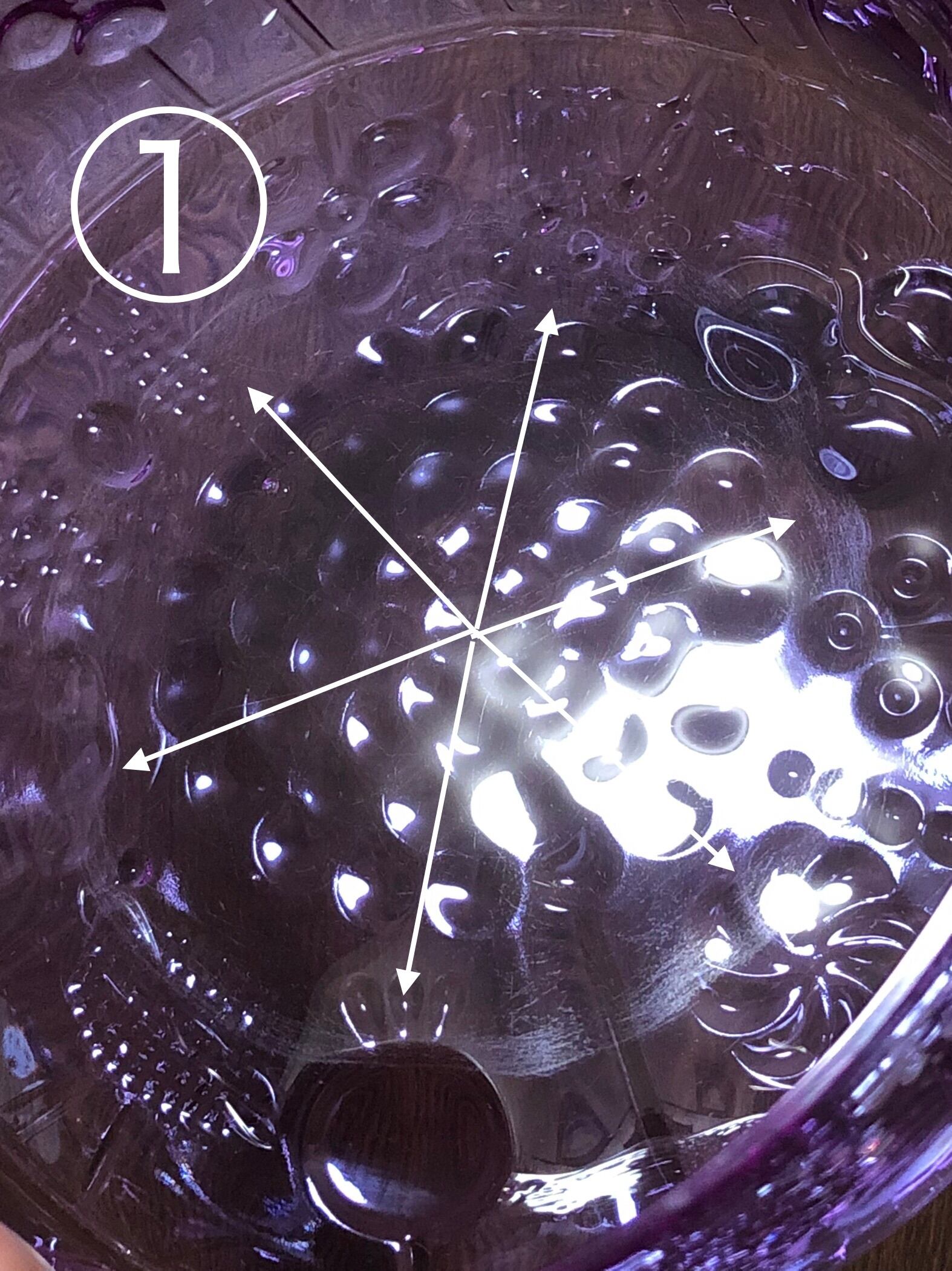 割れ欠けなくとても良い状態ですが、底にボウルを使ってダイレクトに何かを混ぜたような痕が付いています。(おそらく泡だて器の様なものを使ったのではないかと思われます)傷というほど深いものではありませんが、光に透かすとまんべんなく円形状の擦れによる痕が見えます、また円の内側にも細かな擦れ痕が付いています。
